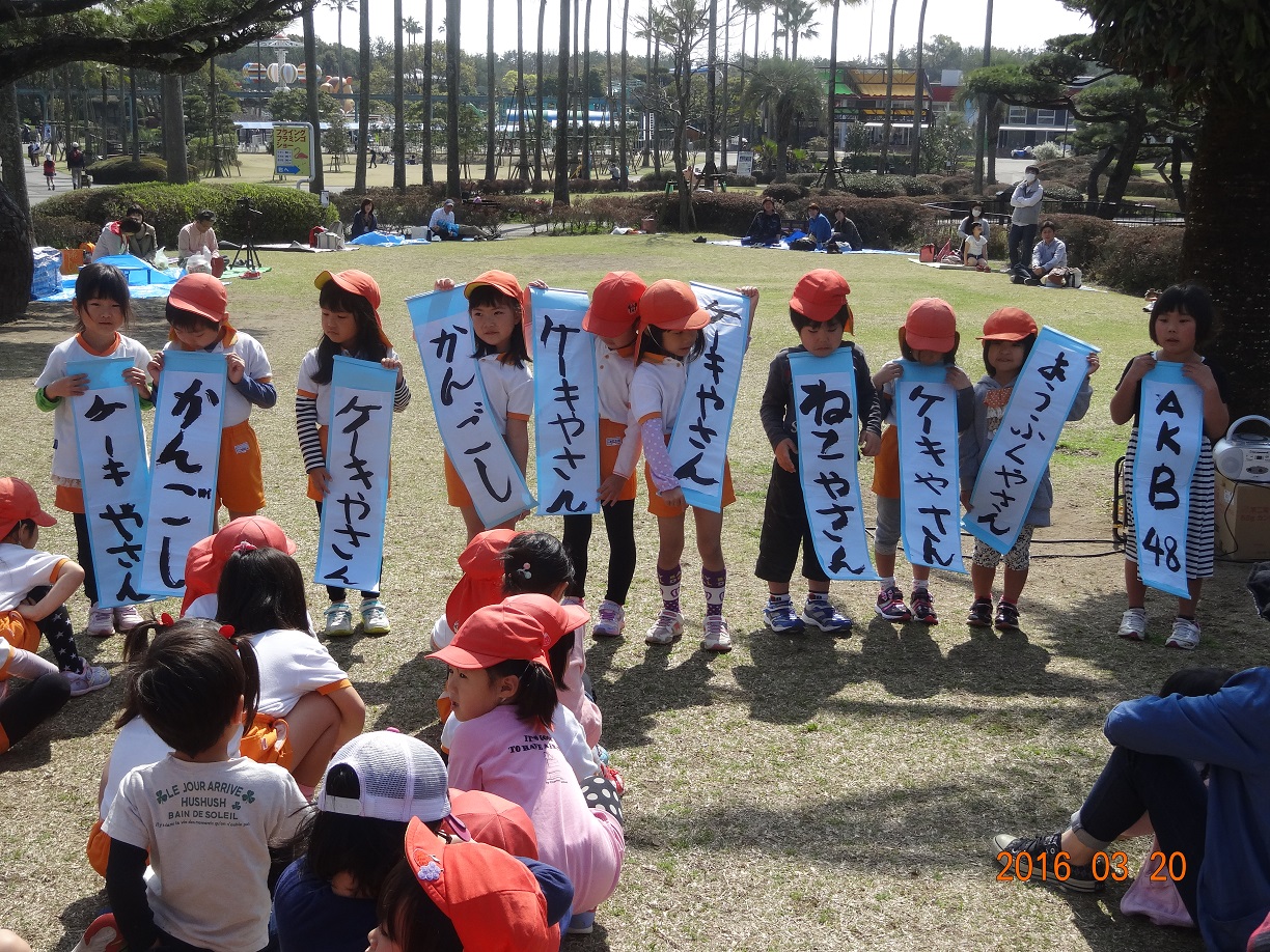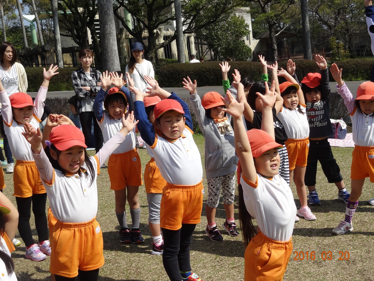 お別れ遠足 3月20日(日) 心配していた前日までの雨もあがり、フェニックス自然動物園で『お別れ遠足』を行うことができました。 きりん組さんは、みんなの前で将来の夢を発表しました。 その後スタンプラリーを行い、動物を見たり触れたり楽しい時間を過ごしました。