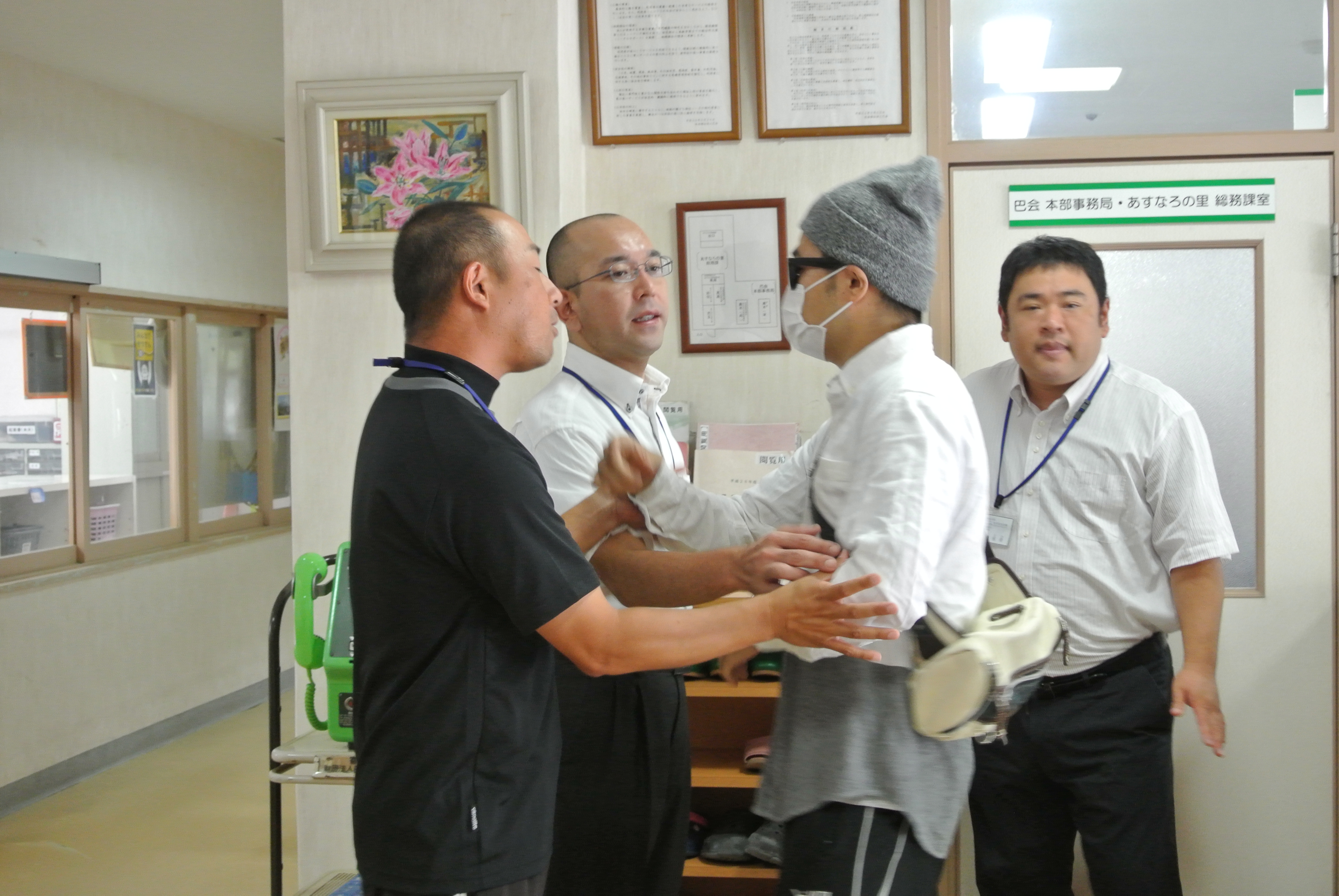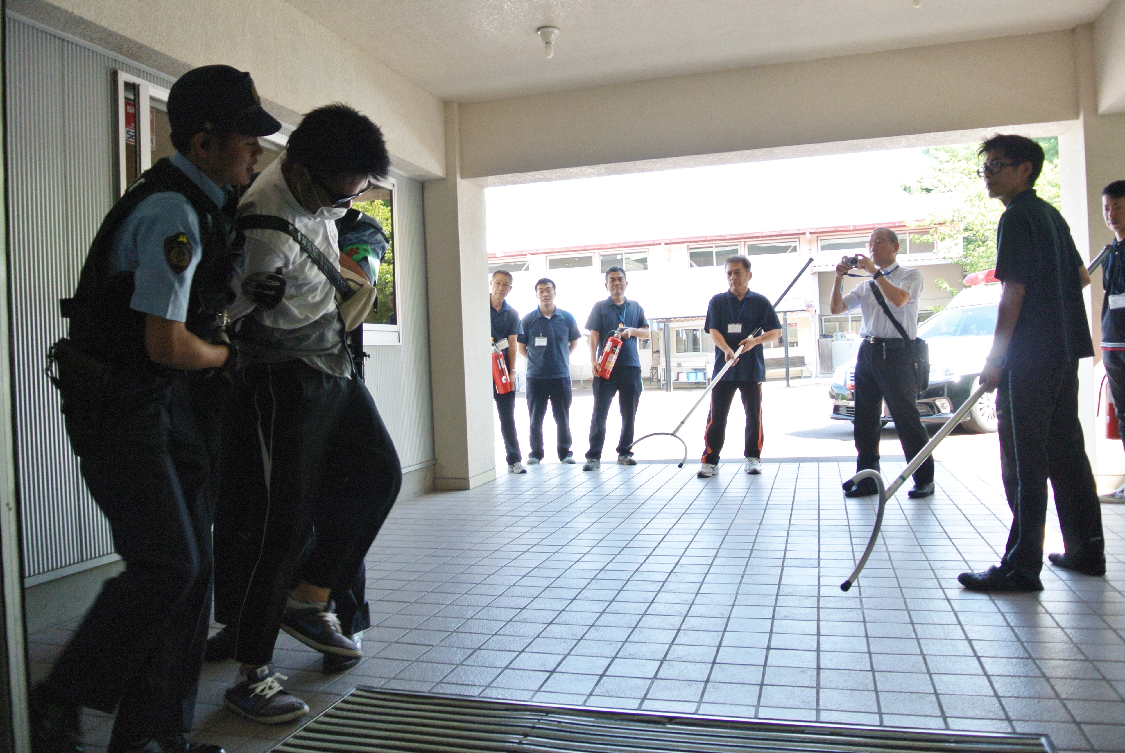 正面玄関から不審者が来たという想定で、