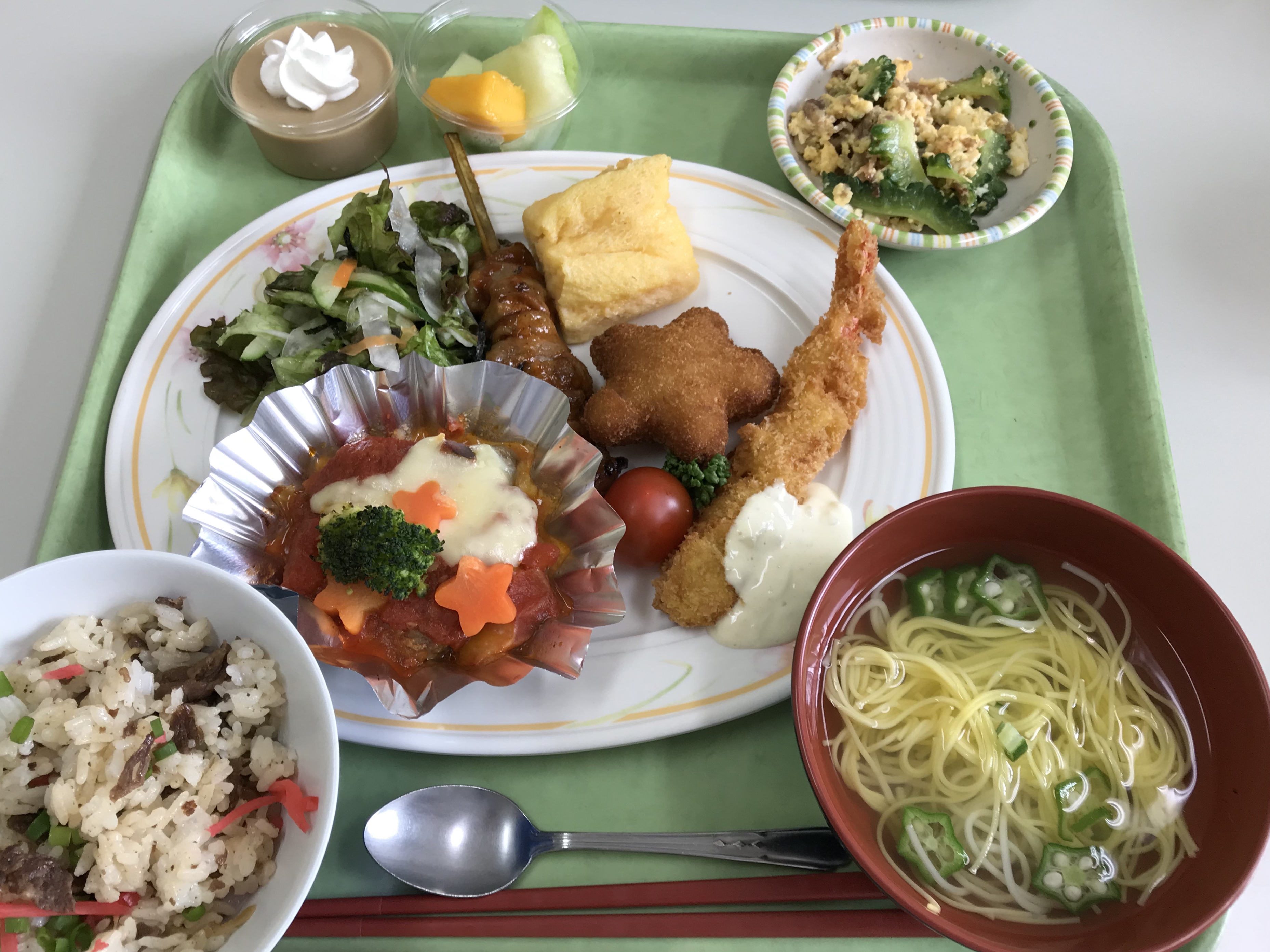 ☆七夕バイキング☆ 7月7日は、七夕ということもあり、今日のあすなろランチは、バイキングでした。 七夕らしく、カラフルで、どれもグッドな味付け!しかも栄養満点!! 利用者の皆さん、大きく口を開けて、どれもおいしそうに召し上がっていました。 心もお腹の満足できる、笑顔のランチタイムとなりました。