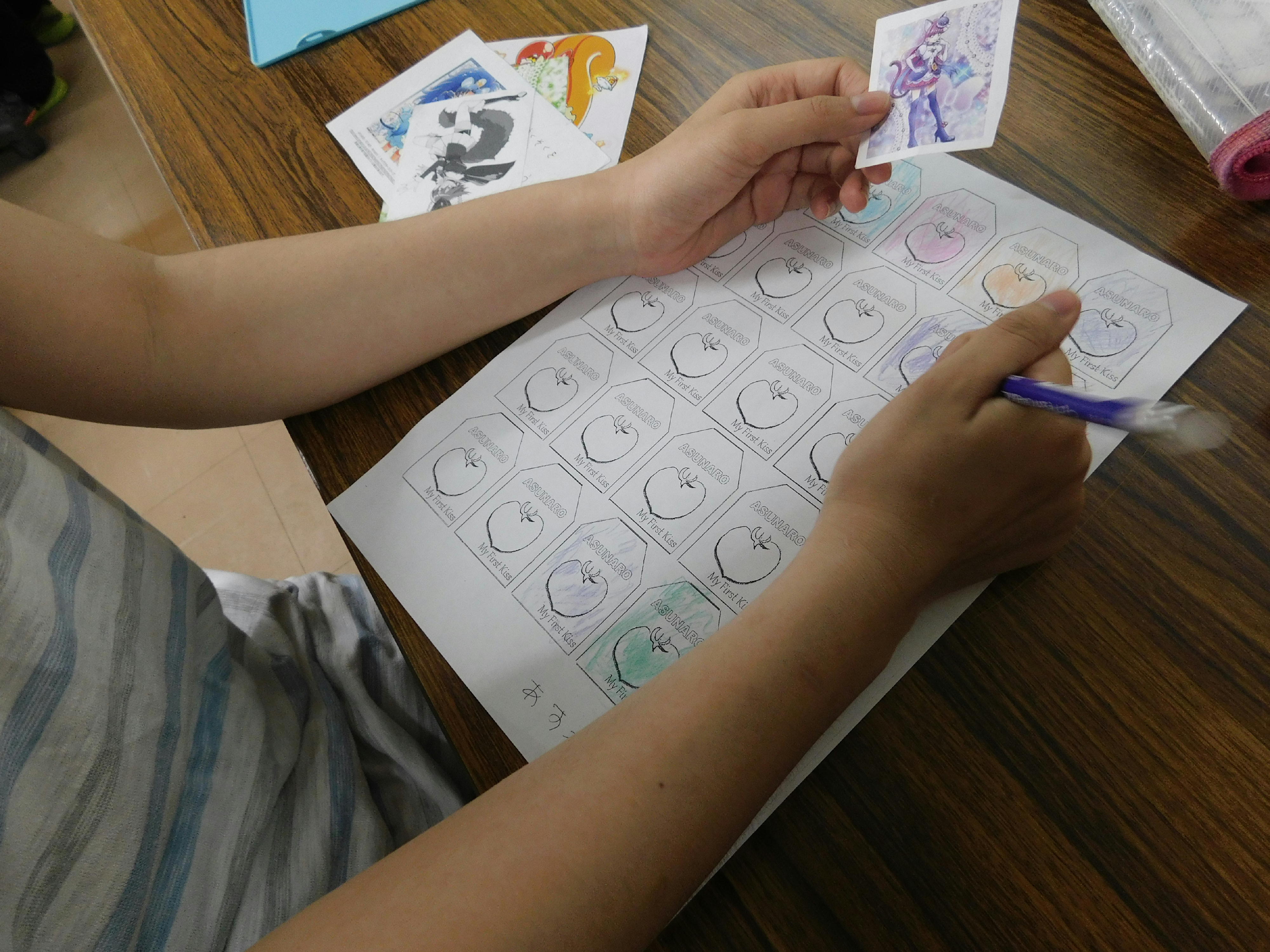 雑貨商品に付けるタグ作りをしている様子です。