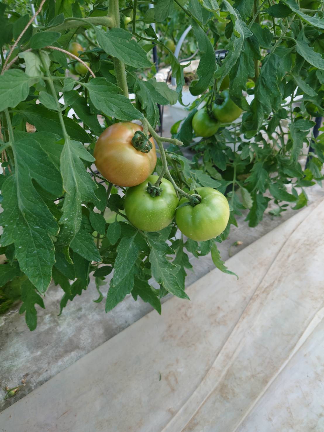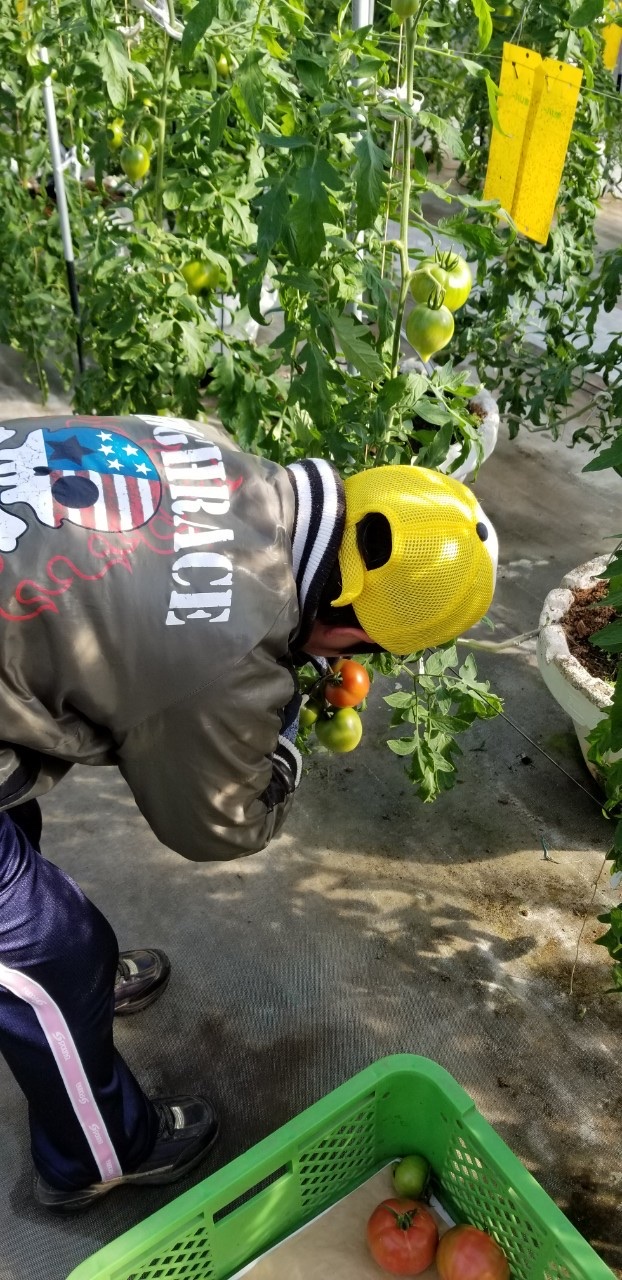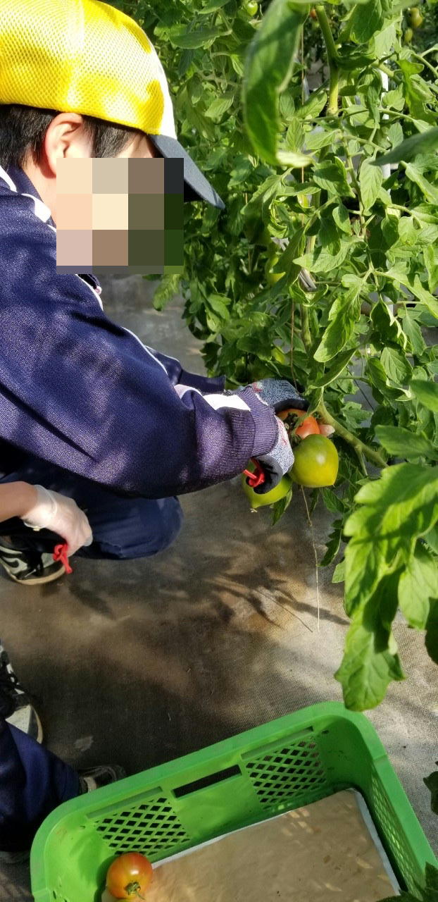 色づき始めたトマトを、ひと玉ずつ丁寧に収穫しています!