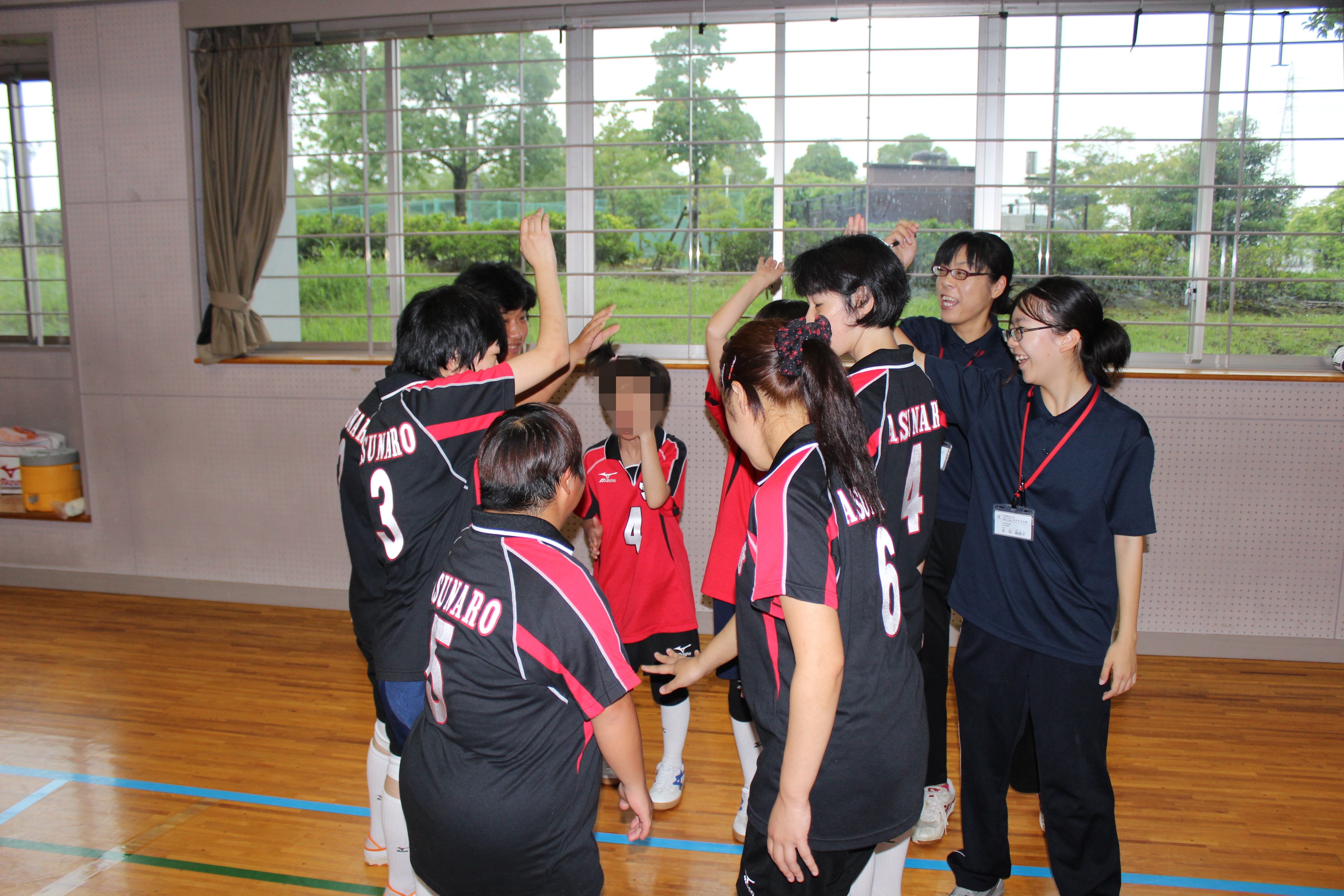 ミニバレーに参加されたご利用者です。試合前に円陣を組んでいます。