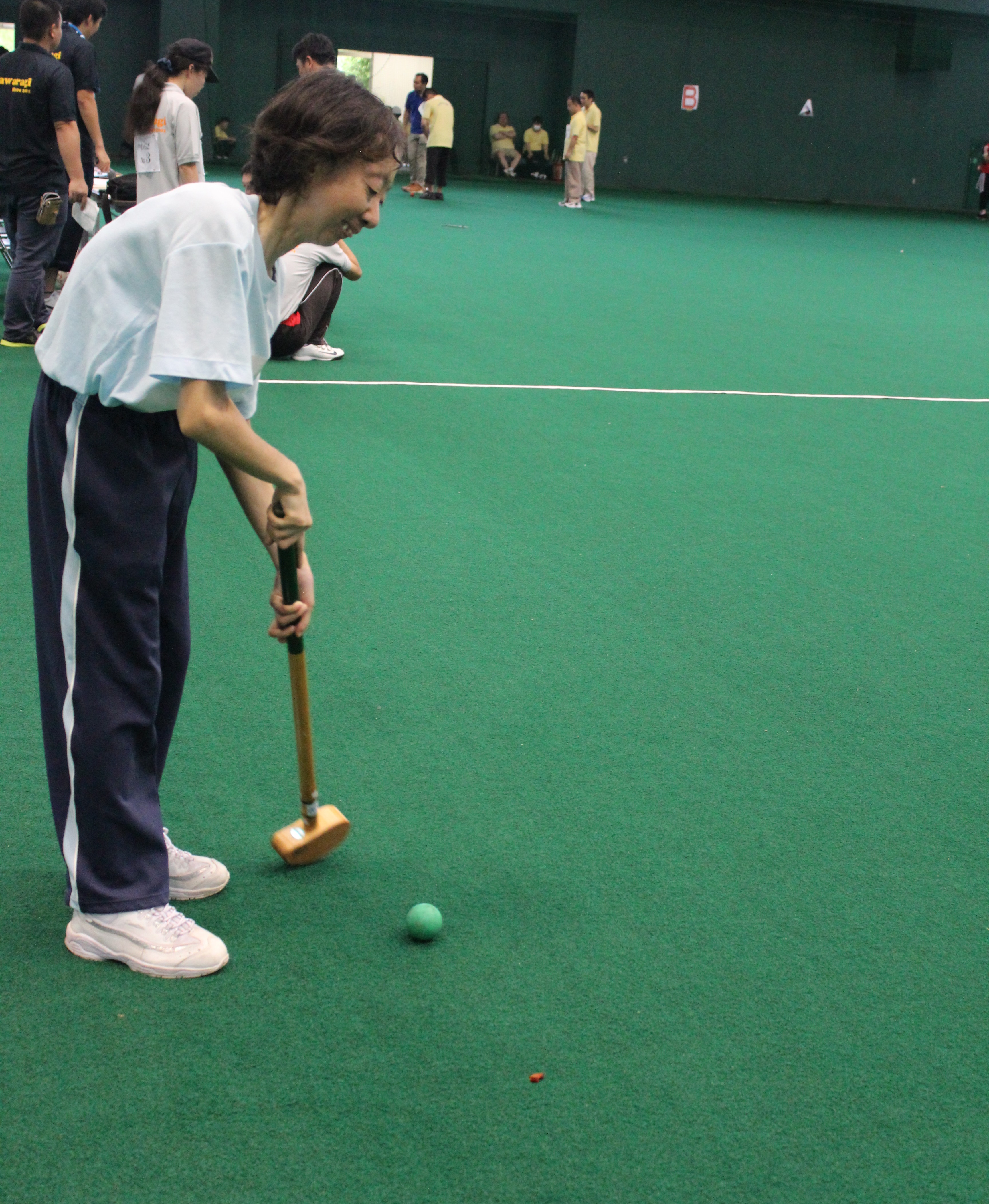 グランドゴルフの様子です。ゴールポストに向けて、スイングをしています。思うようにボールが転がらないこともありましたが、皆さん素晴らしいクラブさばきでした♪