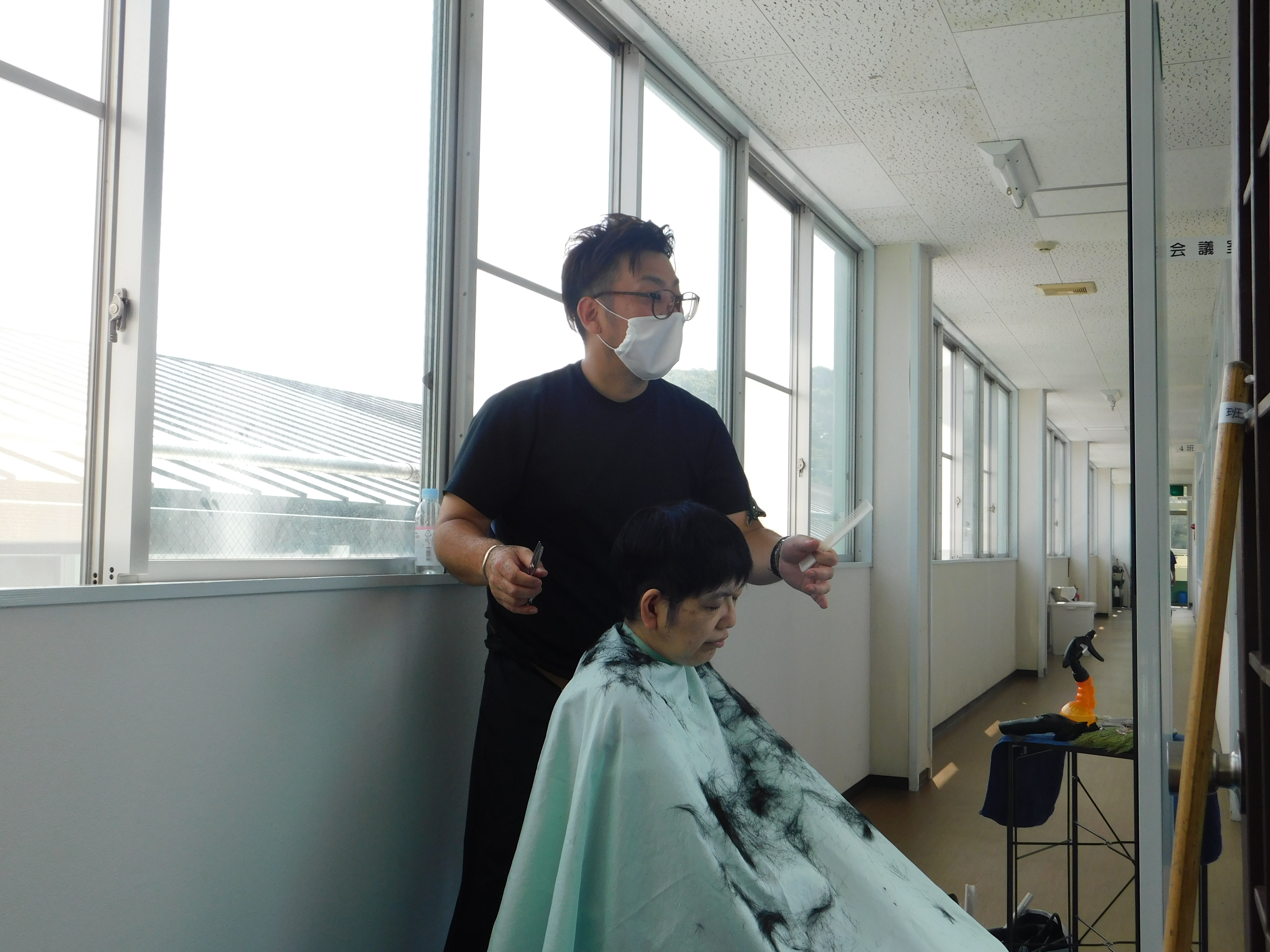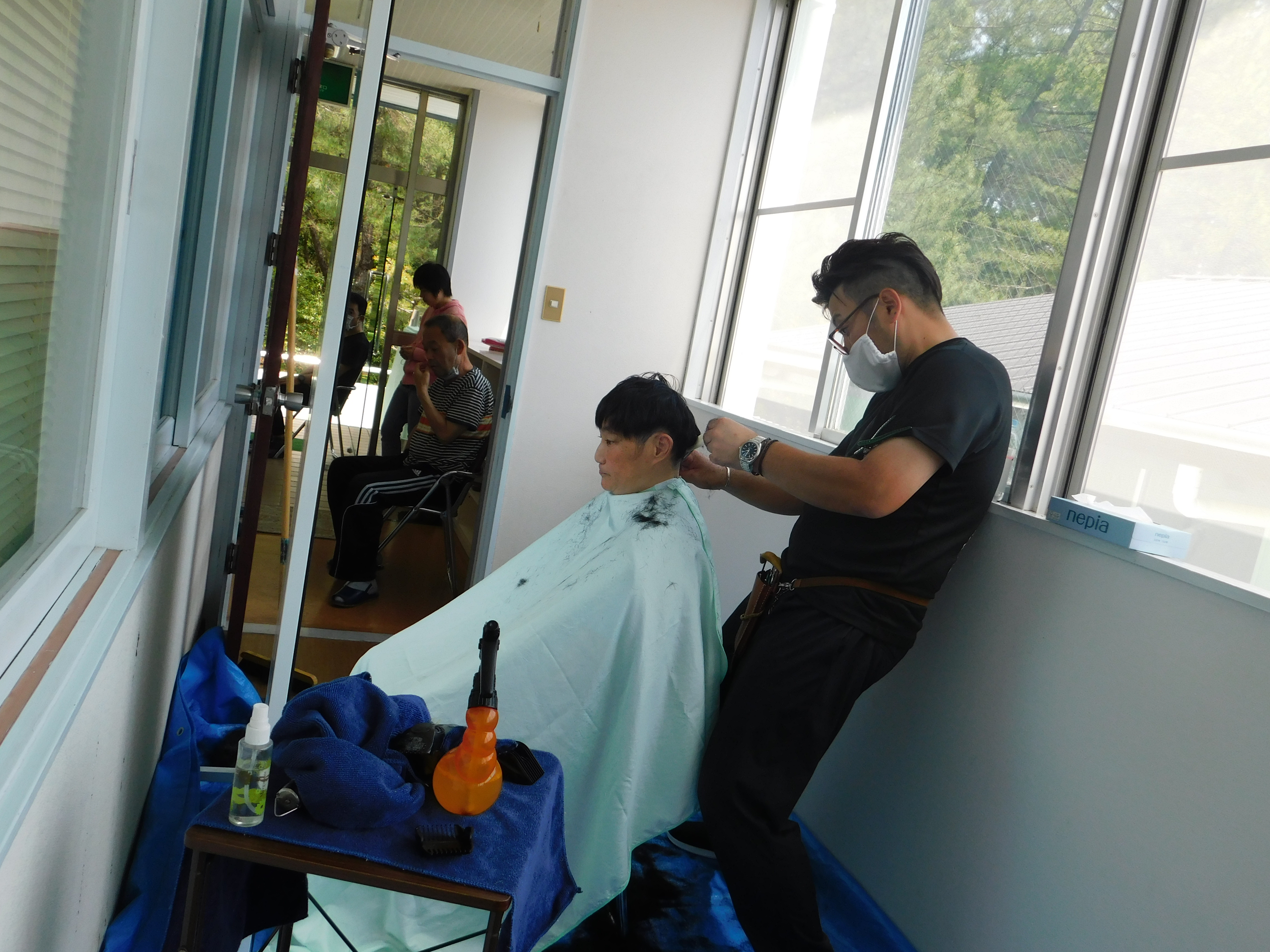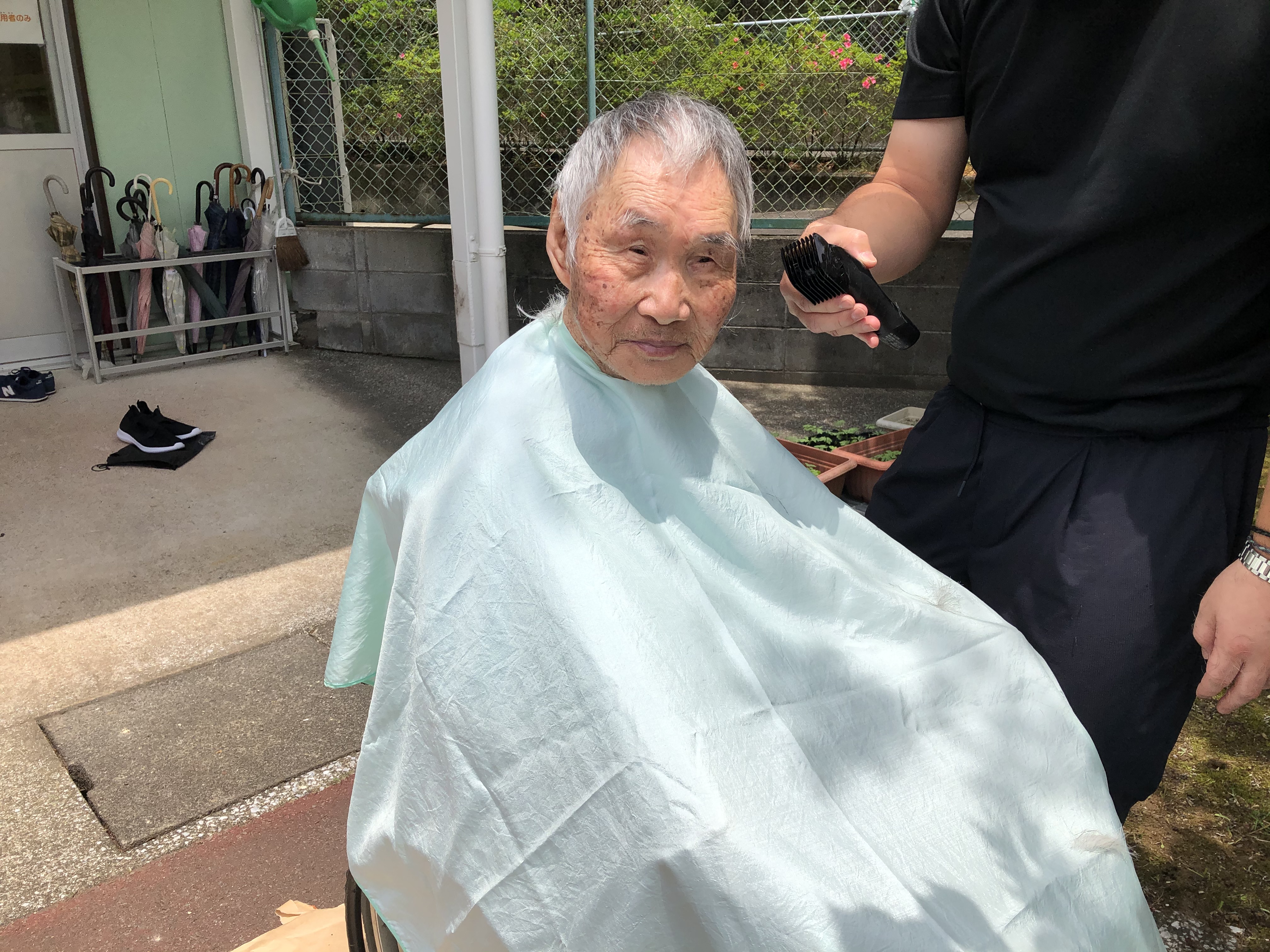 5月27日(水  今回は新型コロナウイルス感染症予防対策で外出自粛中のため、カットの達人さんに訪問理容を依頼し、換気の良い廊下で散髪をして頂きました。