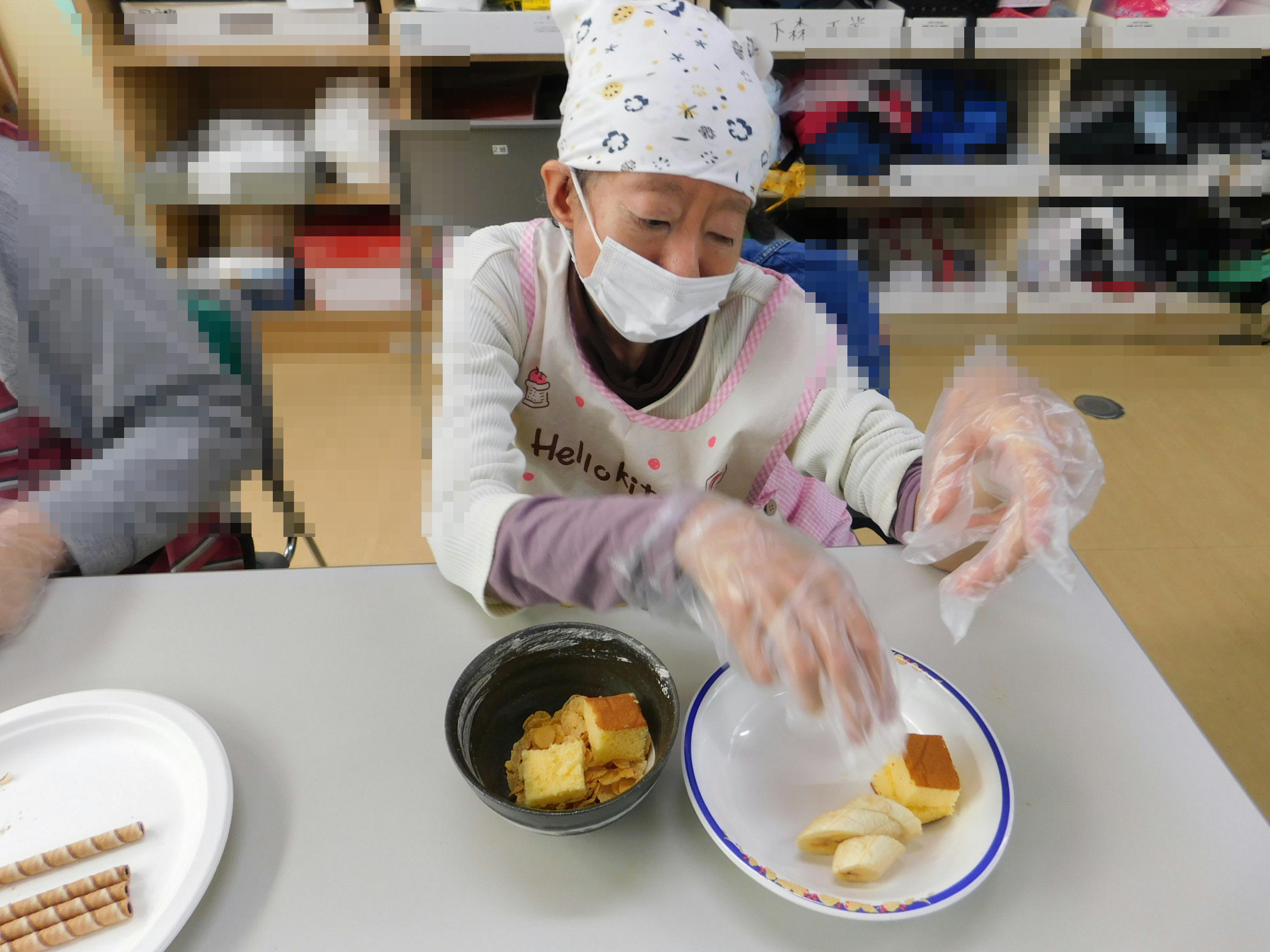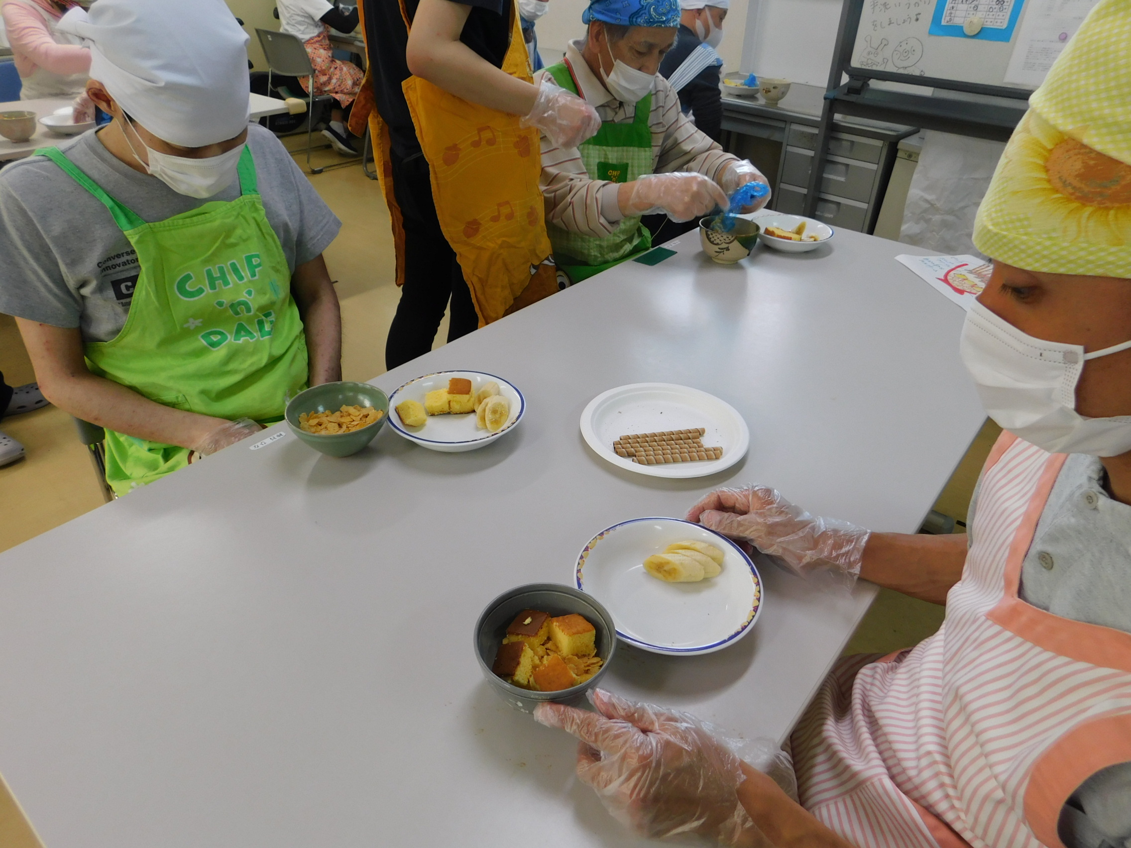 5月 調理実習☆彡 5月に調理実習を行いました! ご利用者の皆さまは、この日を指折り数えて待っていたことと思います♡ 感染症対策をしながら、 皆さん工夫して取り組まれていましたよ♪ 予め、1人ずつ皿にお菓子を取り分けておき、 他ご利用者と接触がないように工夫しました。 盛り付けはこのようになりました♡♥ 素敵ですね~♡美味しそう~♡ 素敵な笑顔をたくさん見ることができました♡ 楽しい1日になりましたね! 次の楽しい企画に向けて、 体調に気を付けながら過ごしていきましょうね☆彡