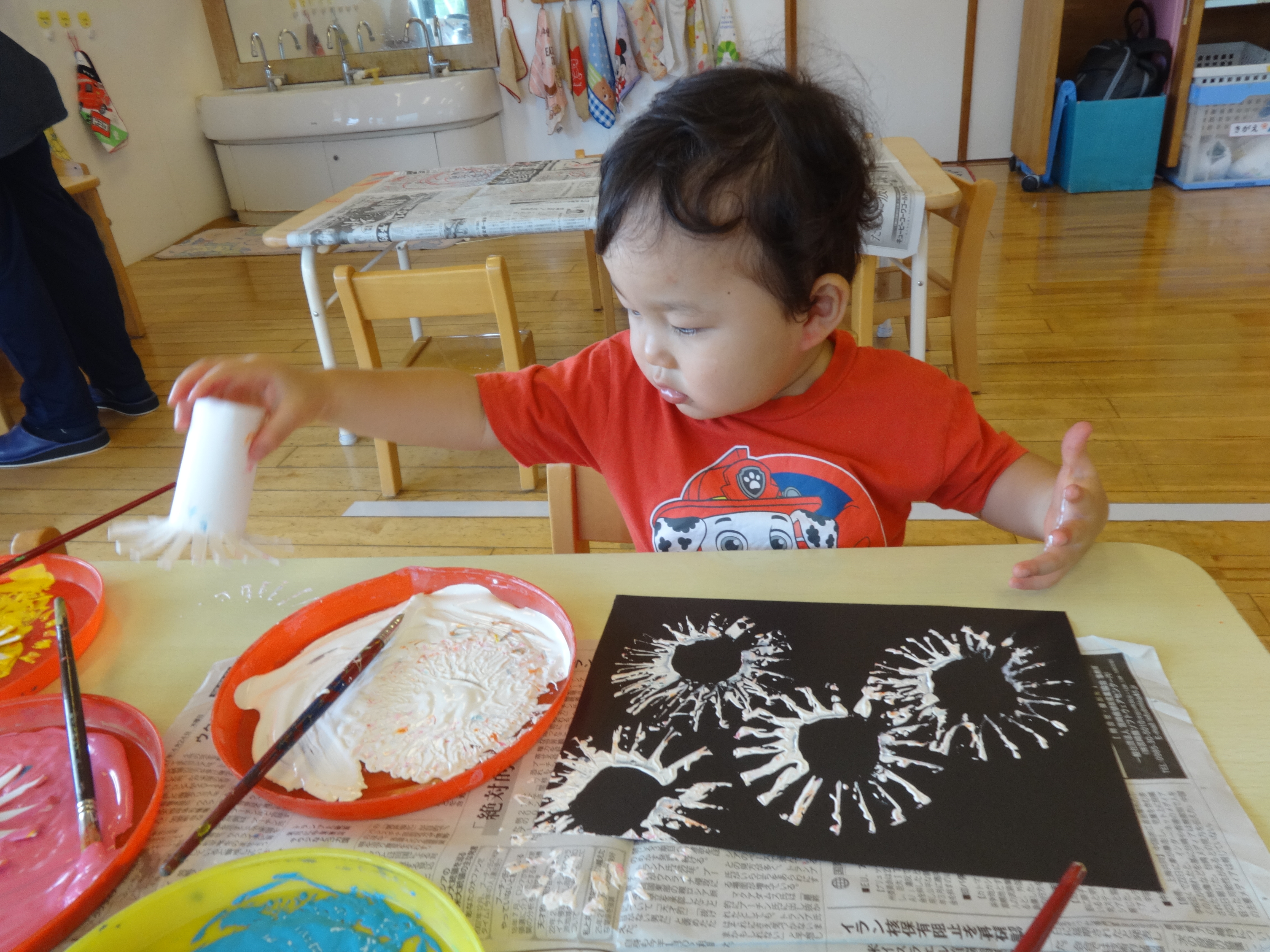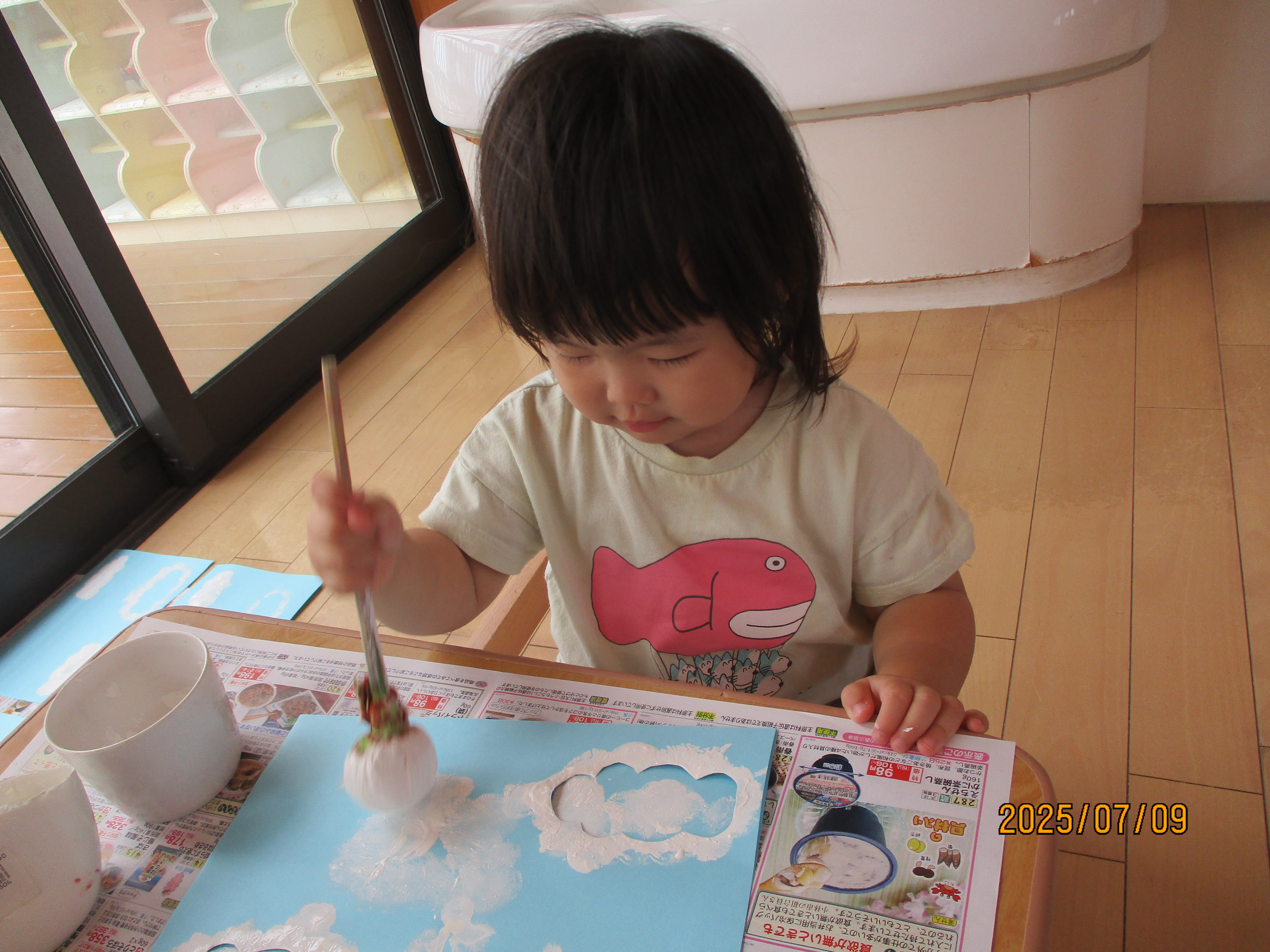 新緑の季節を迎えました! 5月16日、新緑レクリエーションを行いました!あいにくのお天気となり、室内での開催となりましたが、保護者の方にもご参加いただき、各グループでのレクリエーションや交流を楽しみました! 5月8日、初めての試み“ボタニーペインティング&ミュージック”があり、葉っぱに色を付けてみんなでアート作品を作ったり、ウクレレに合わせて楽器や歌を楽しみました♬