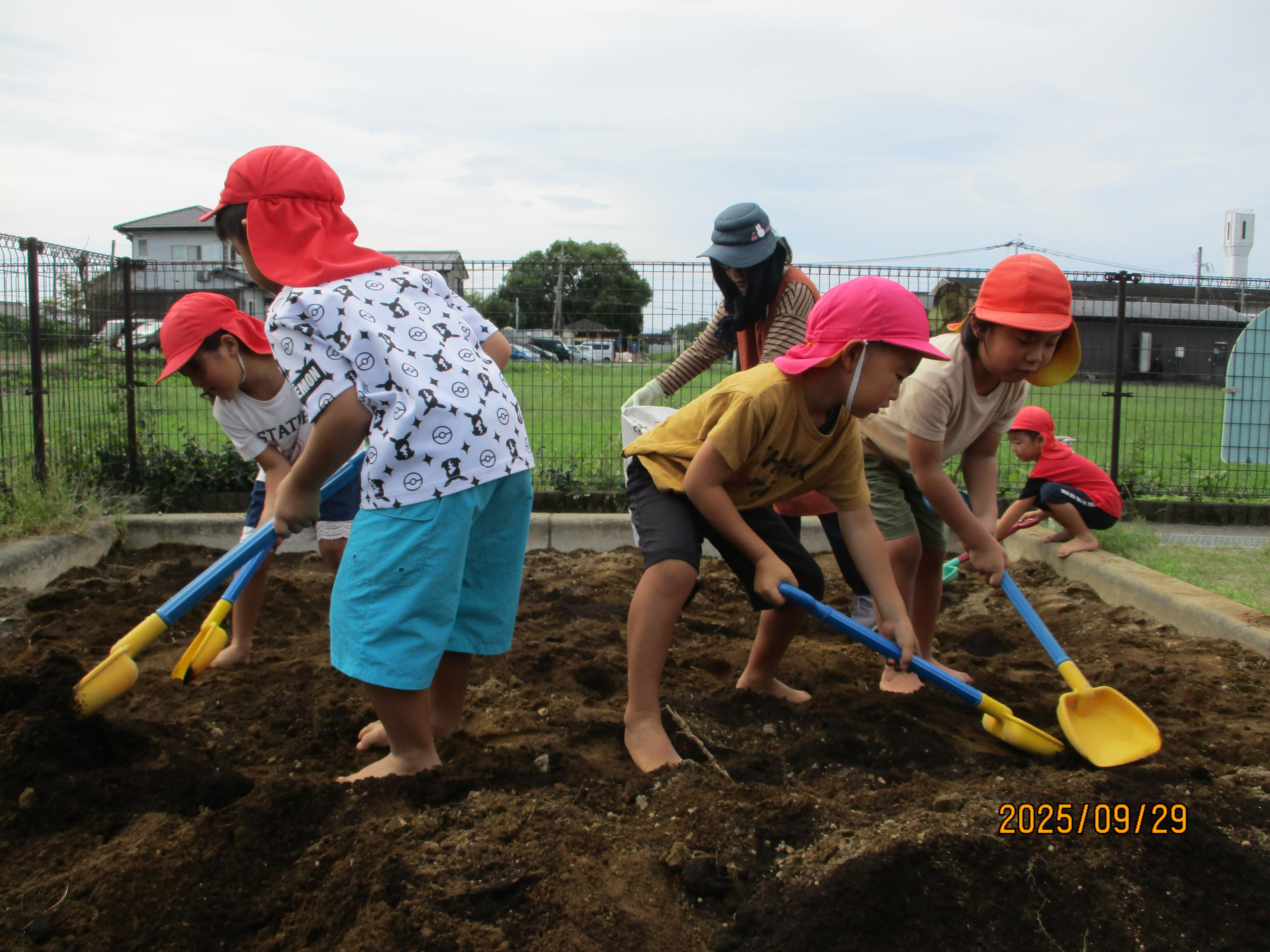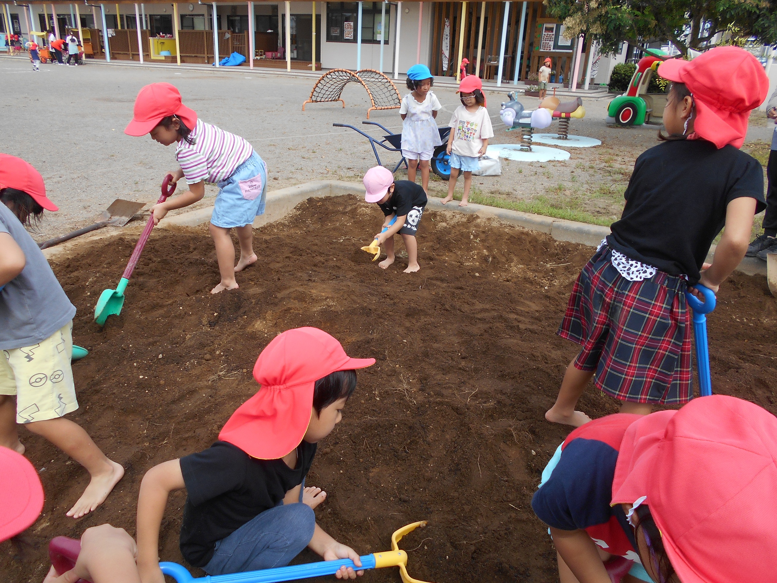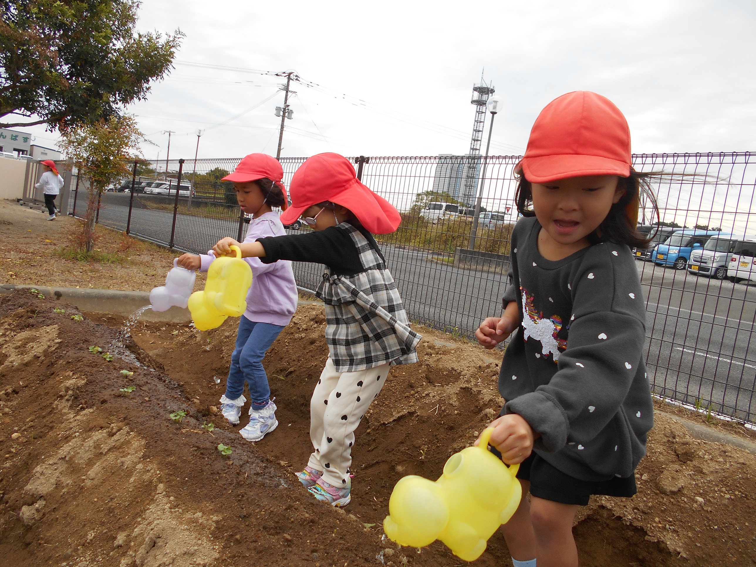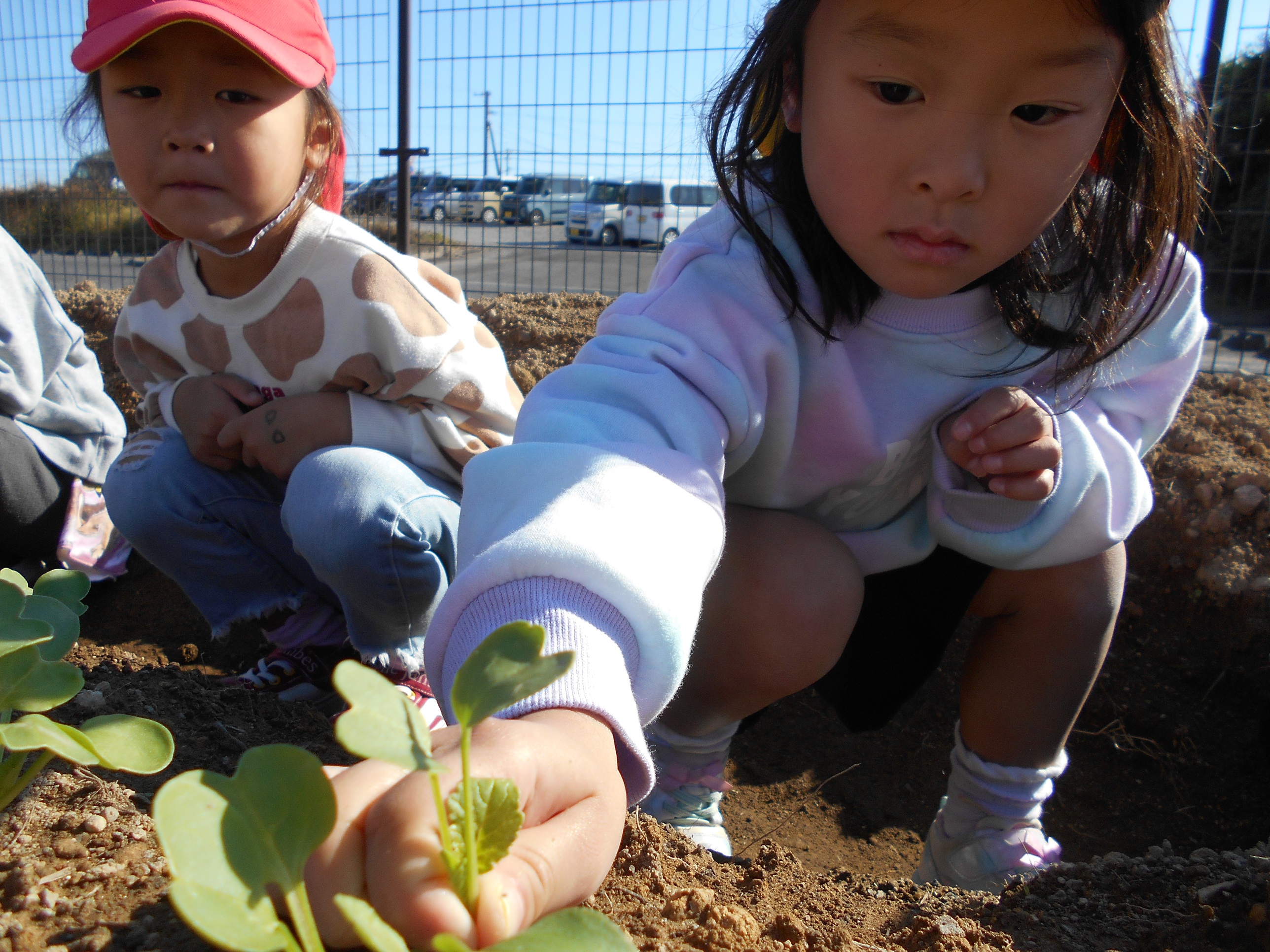 大根作りの始まり~!!肥料を入れて土作りから楽しそうに取り組む子どもたち。種をまき、水やりも毎日かかせません。数日するとかわいい芽がぴょこり!!やった~!!と大喜びです。生長が楽しみですね。