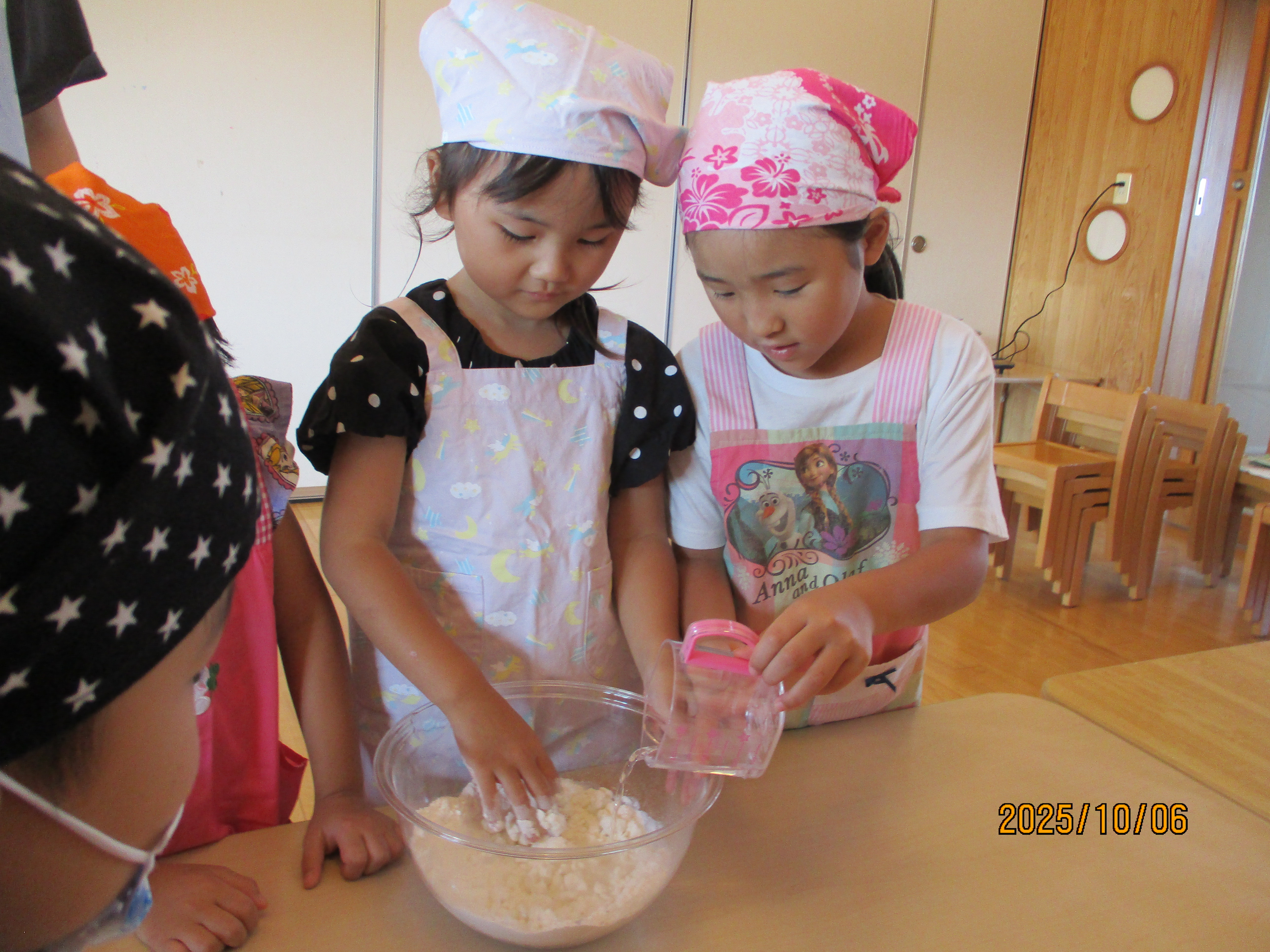 粉を触って感触を確かめたり、お団子みたいにまるまる~と丸めてみたり、みんな喜んで作ってくれました。