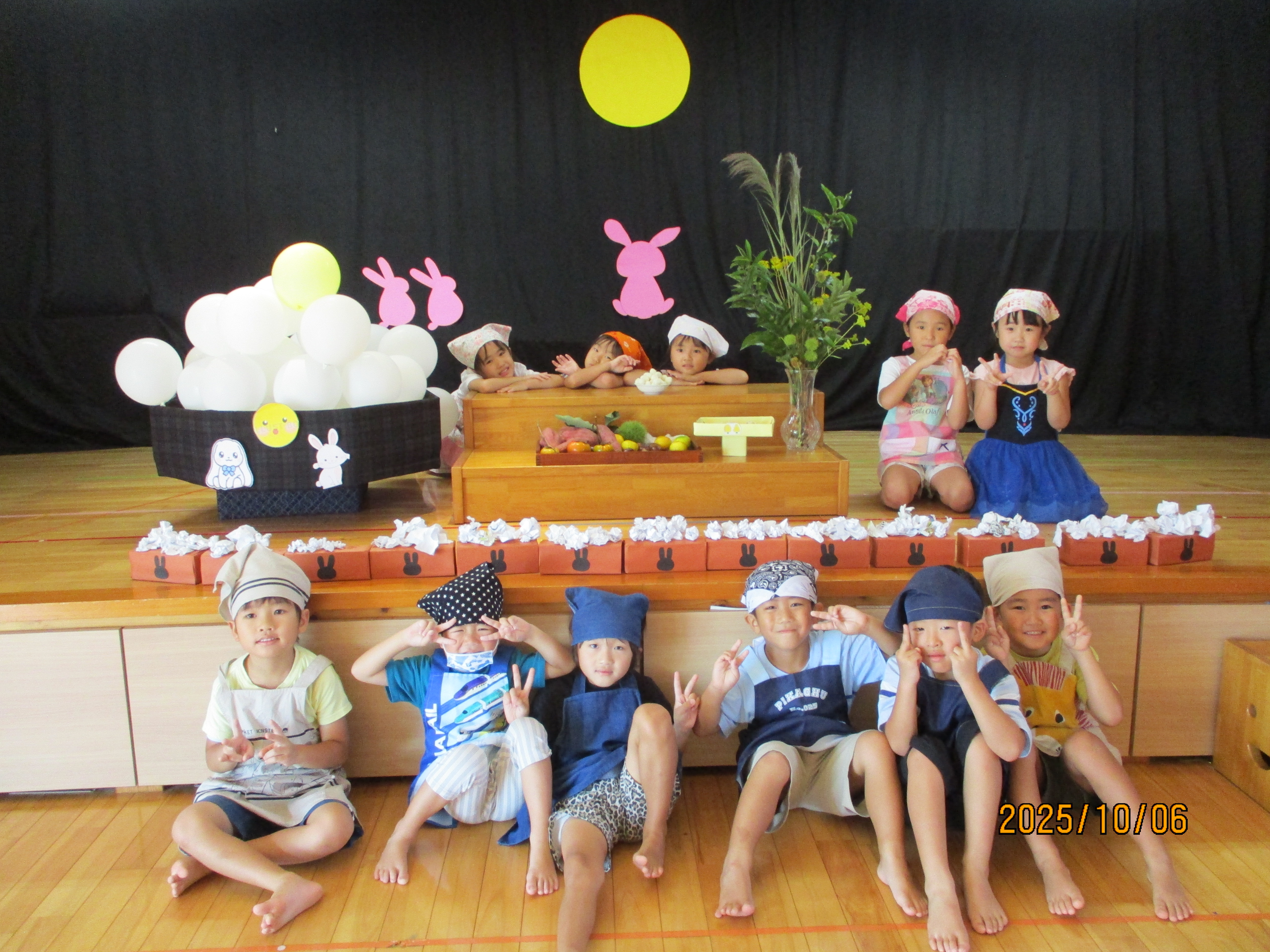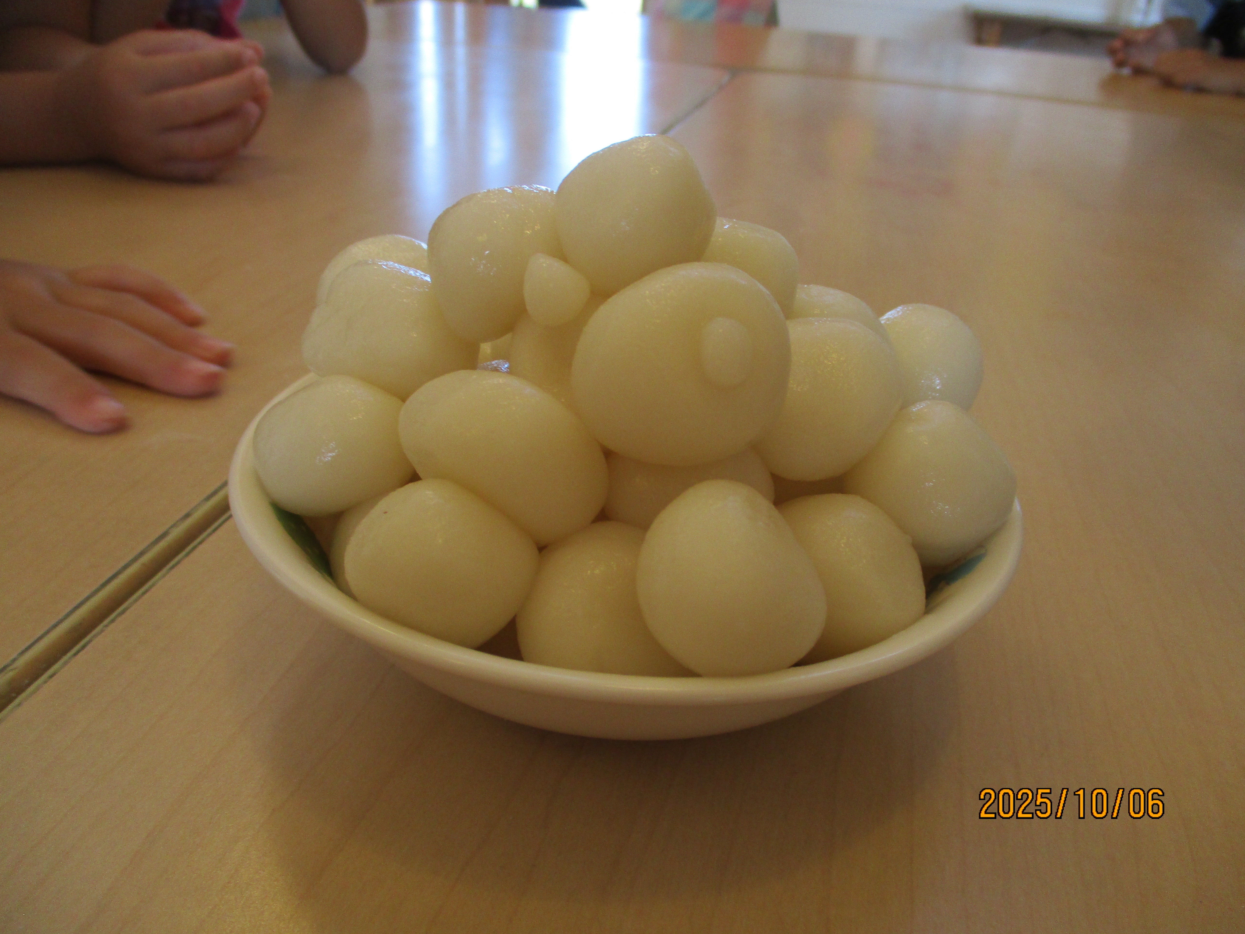 今日は十五夜。収穫に感謝をしながらお団子作りをしました。各クラス、団子粉や風船、小麦粉粘土、紙を丸めた団子等色々な団子を作ってお供えをしました。伝統ある行事に親しみをもちながら子どもたちも数日お供えを飾っていました。