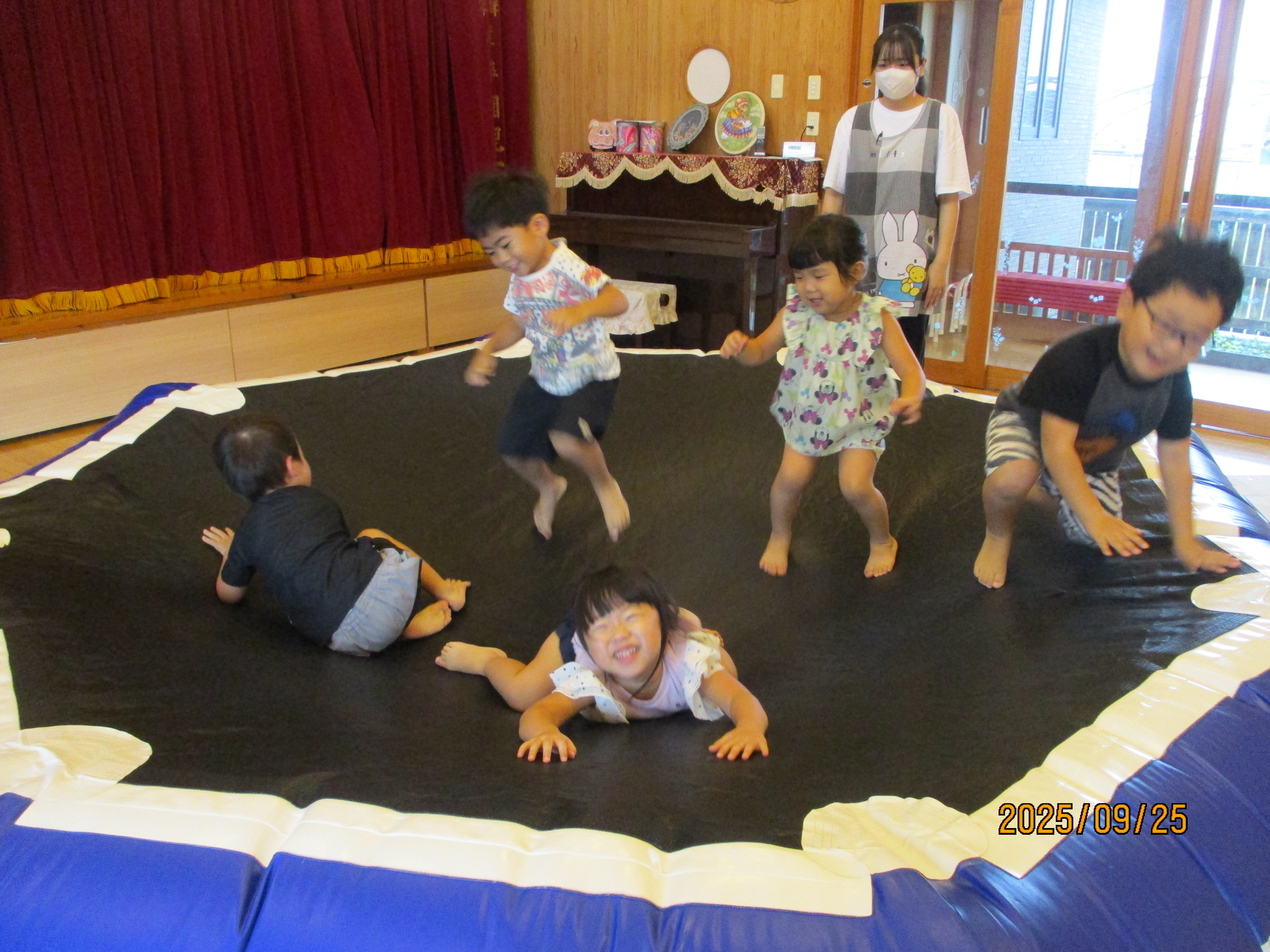 今月の誕生会は、芋ほりのペープサートを見た後に、みんなで芋ほりごっこを行いました。