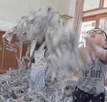 子ども達と一緒にちぎった新聞+事前に準備した新聞を合わせると、部屋中が新聞紙だらけに。両手いっぱいに新聞紙を持って、上に投げたり、お腹や背中に入れ込んだりと、様々な遊び方で楽しみます。大きく繋げた新聞紙のトンネルをくぐったり、やぶったり。最後はビニール袋に入れ