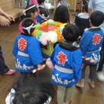 子ども達がはっぴを着て、お御輿やお賽銭箱を持って準備万端!!