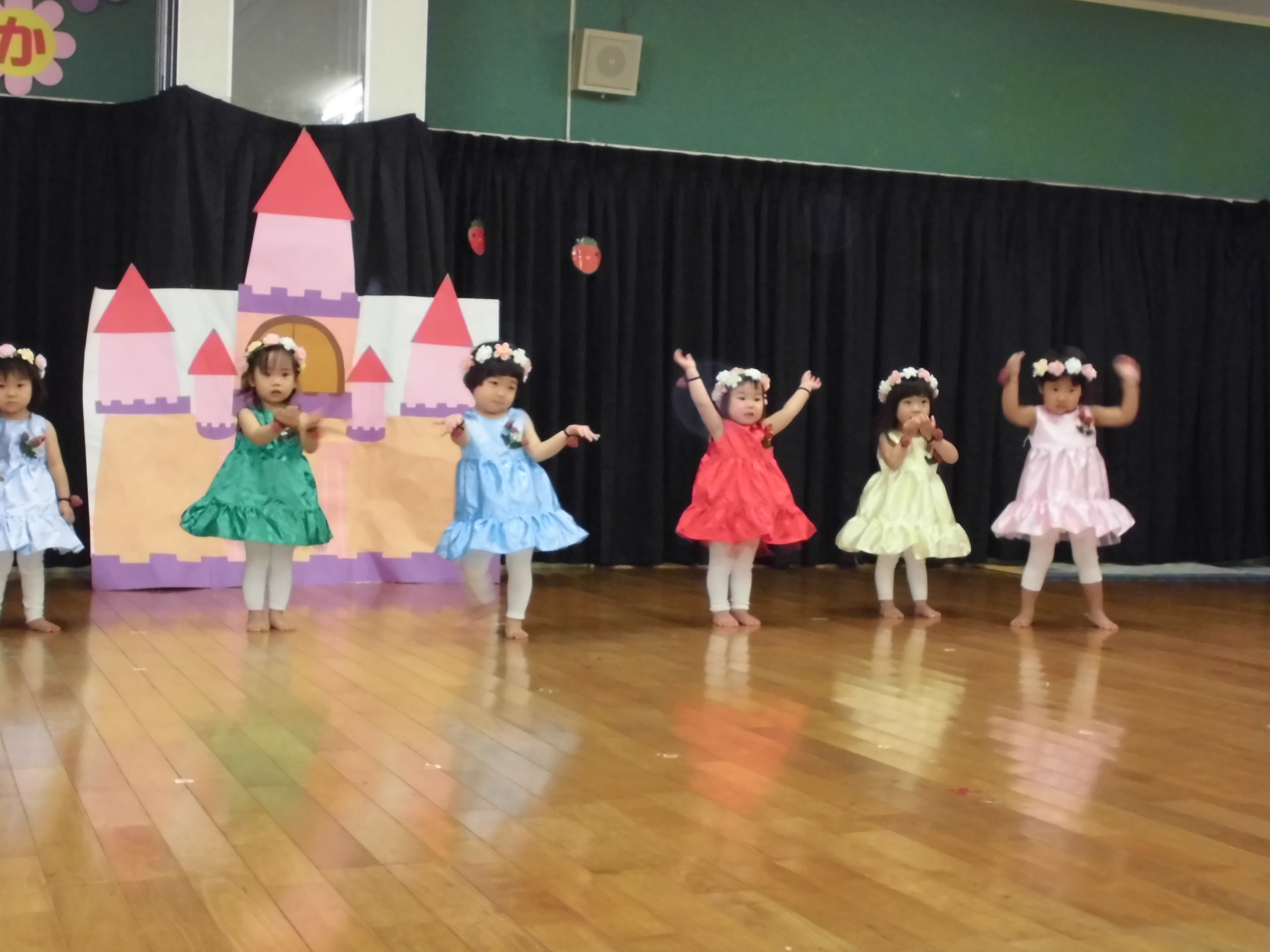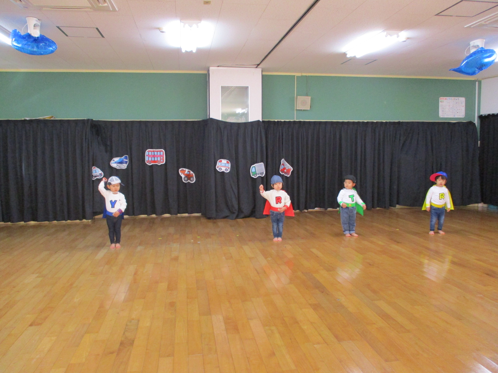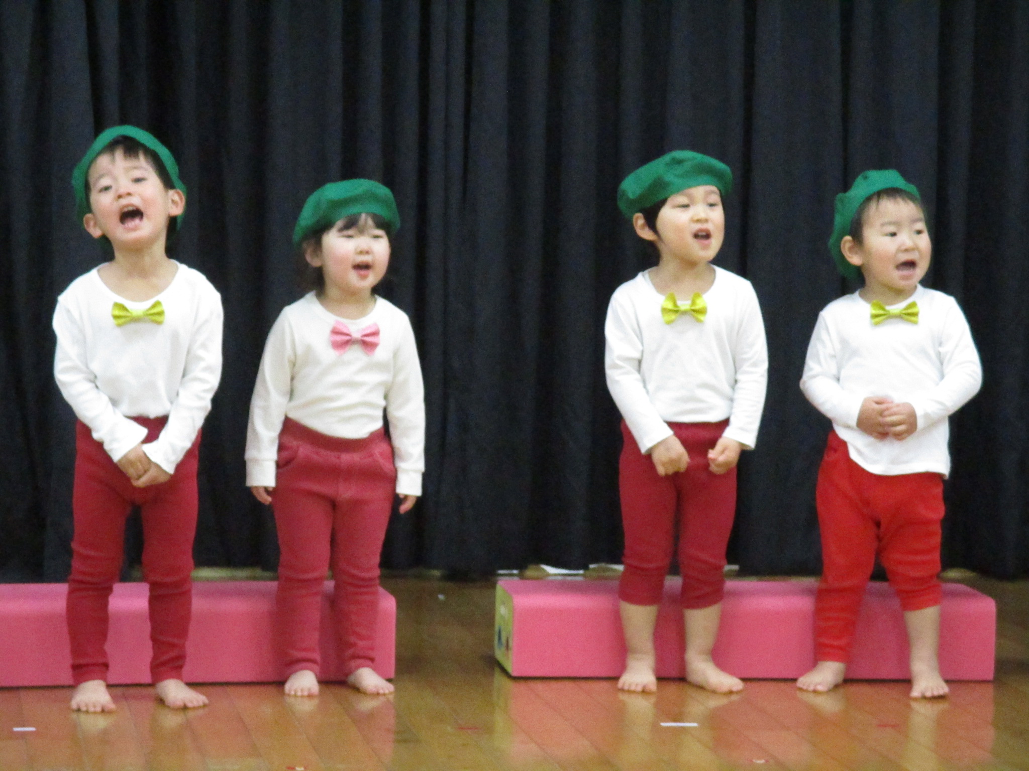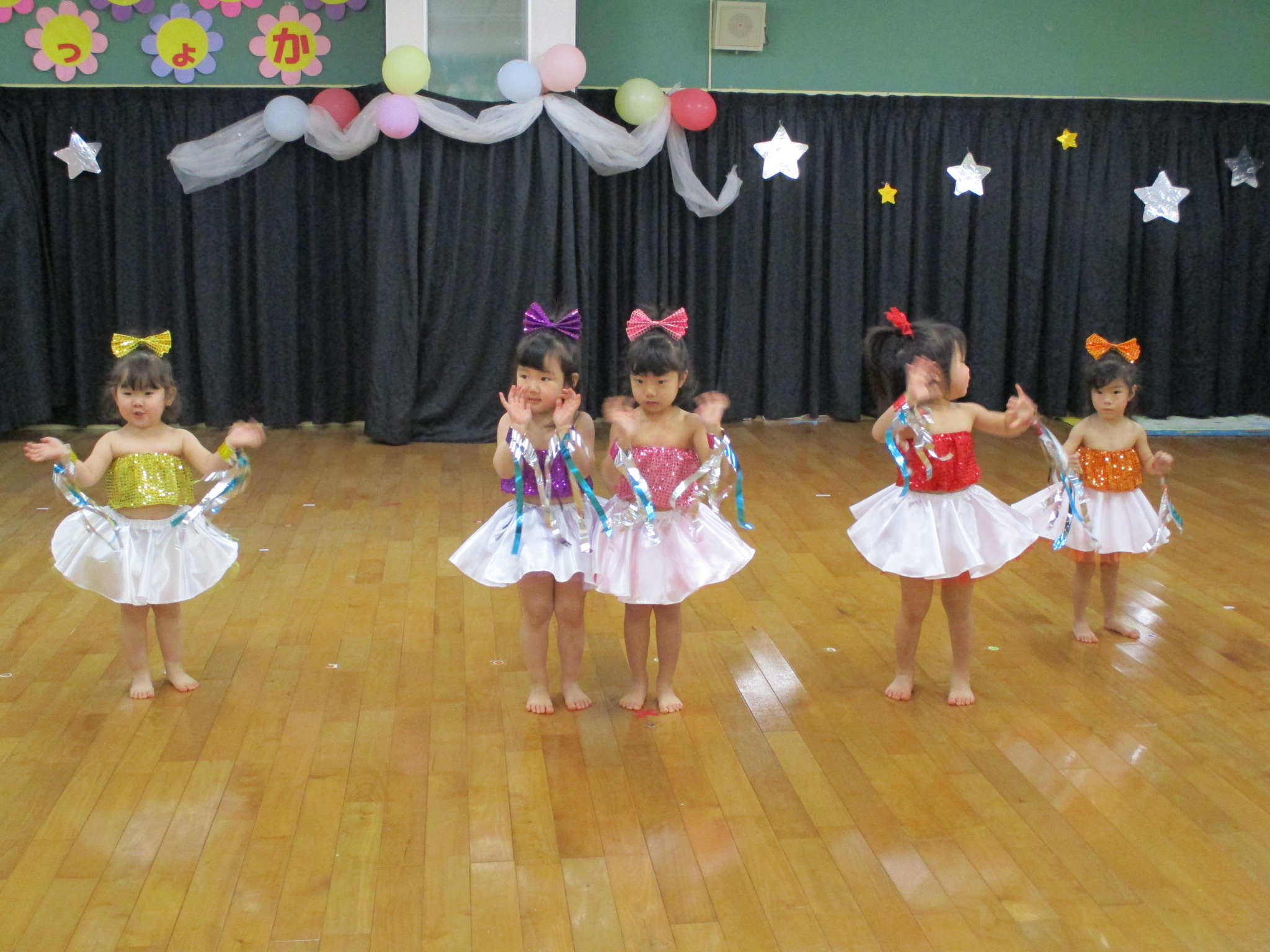 R2。2月 発表会 令和2年2月15日発表会が行われました。これまで2回のリハーサルでは、お友だちや先生たちが見守る見慣れた雰囲気の中で披露でしたが、本番は大好きなお父さん、お母さん、おじいちゃん、おばあちゃん…とたくさんのお客様にびっくりしたようでした。 ステキな衣装を身に着け、様々なかわいい表情を見せてくれました(^^♪ 最後までみんな頑張っていましたよ。 見に来てくださった保護者の皆様、ありがとうございました。