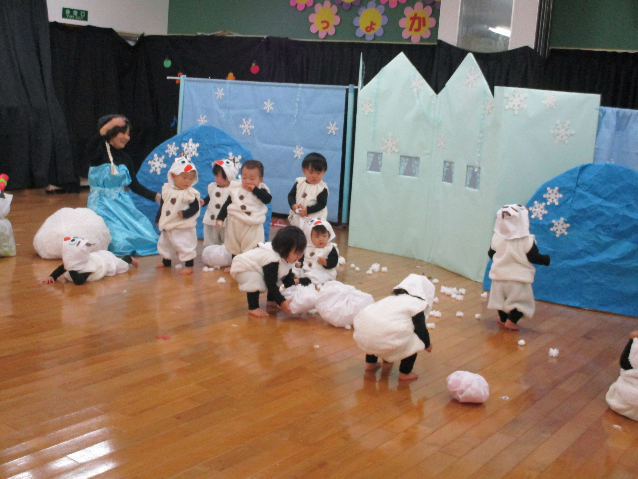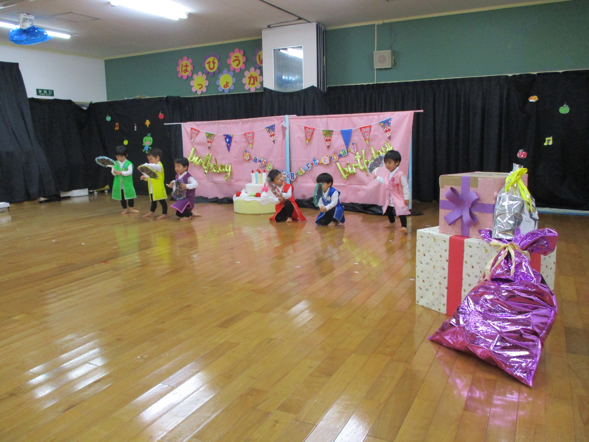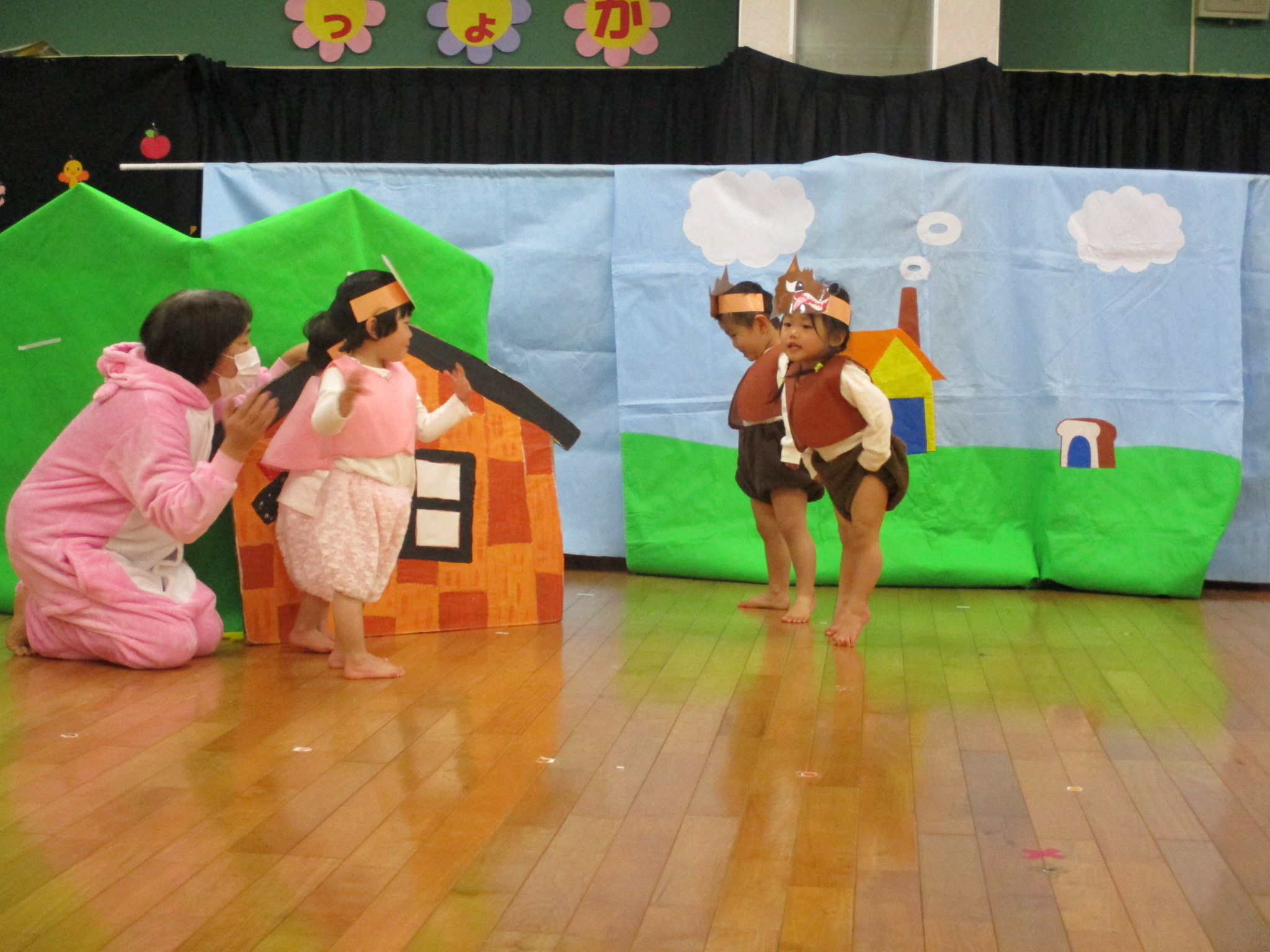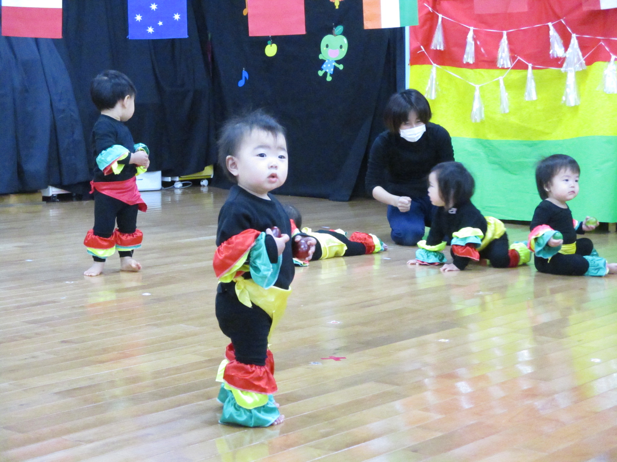 R2。2月 発表会 令和2年2月15日発表会が行われました。これまで2回のリハーサルでは、お友だちや先生たちが見守る見慣れた雰囲気の中で披露でしたが、本番は大好きなお父さん、お母さん、おじいちゃん、おばあちゃん…とたくさんのお客様にびっくりしたようでした。 ステキな衣装を身に着け、様々なかわいい表情を見せてくれました(^^♪ 最後までみんな頑張っていましたよ。 見に来てくださった保護者の皆様、ありがとうございました。