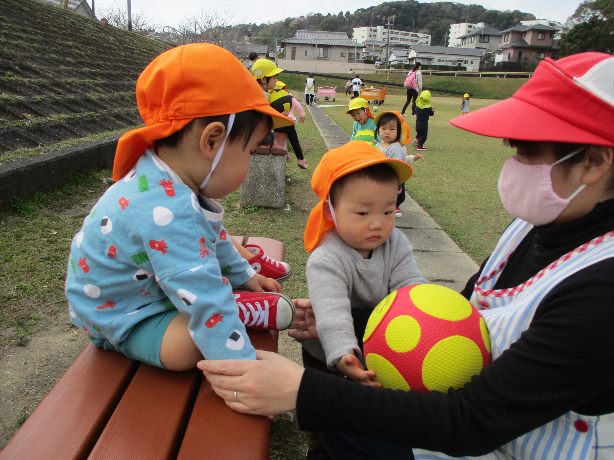 雨が降らないかと心配しましたが、雨も降らず園外へ行き遊ぶことができ、子ども達は大喜び!!もみじ組(0歳児)とすみれ組(1歳児)は、平和が丘公園に行きボール遊びやシャボン玉を追いかけて広い公園をたくさん走り回り遊びました。「ハイどうぞ!」とボールのお店屋さん。「まって~!!」としゃぼん玉をつかまえようとする姿は、とてもかわいかったですよ。