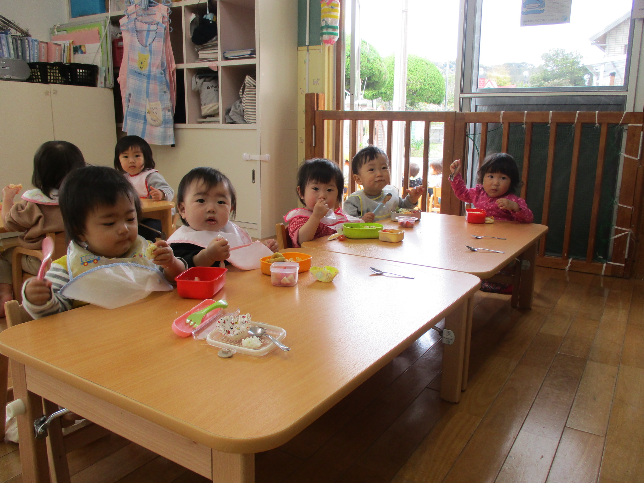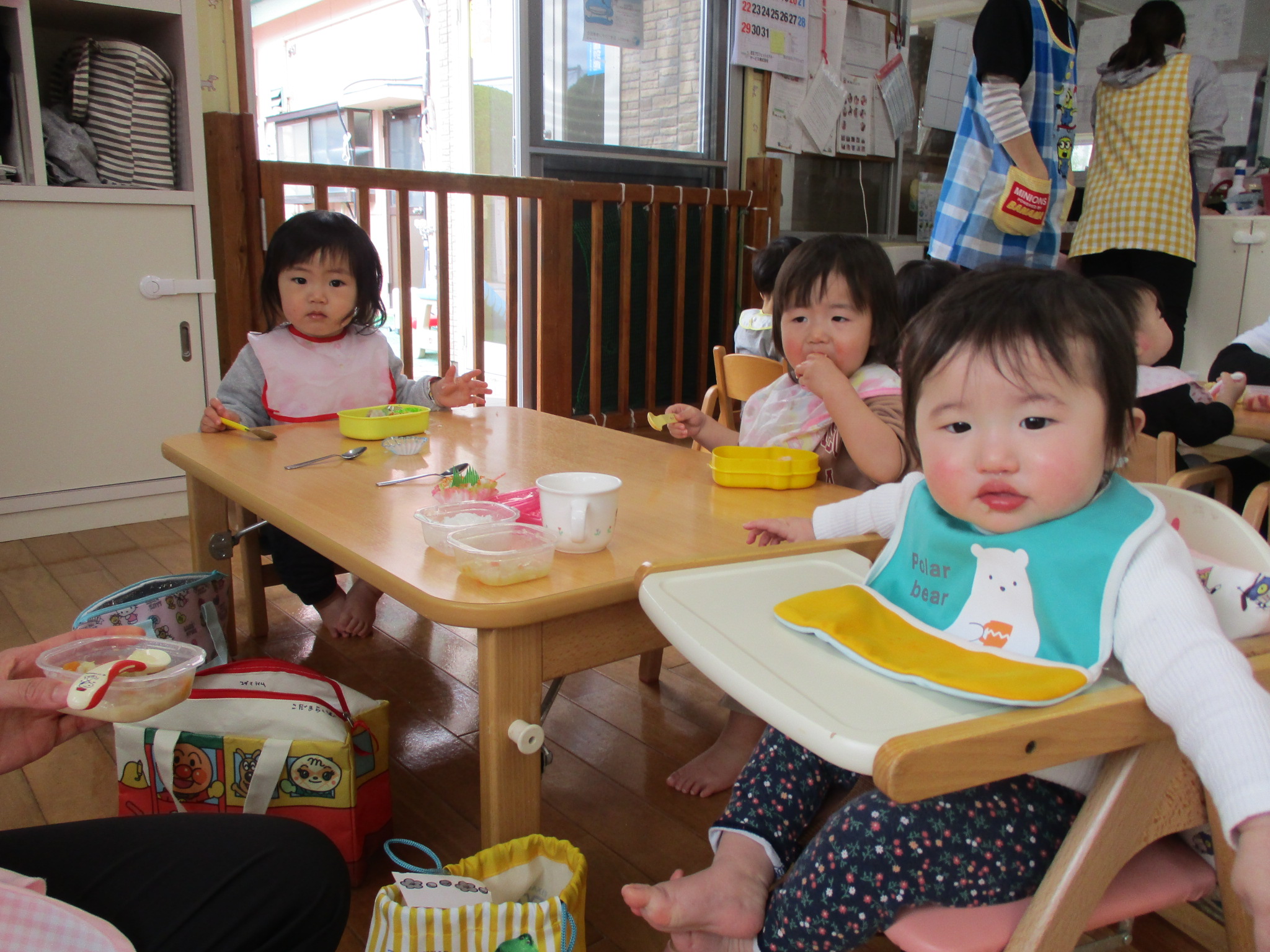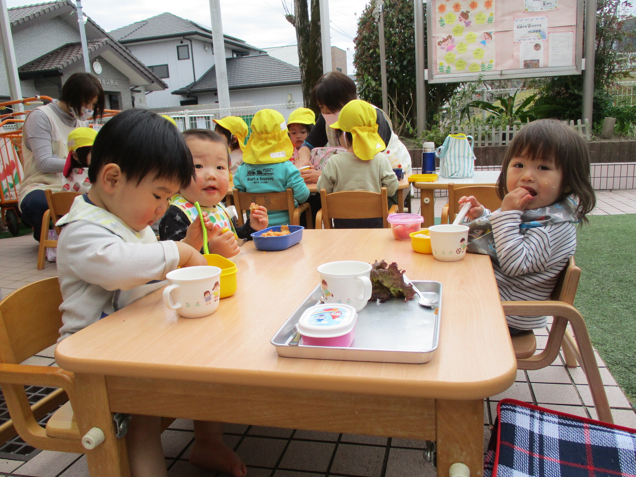 たくさん遊んだ後は、待ちに待ったお弁当タイム!!お弁当に中身をワクワクした表情でチェック!お友達のお弁当も気になるようでした。「おいしい!」「○○が入ってた~!」などを嬉しそうに食べてた子ども達でした。