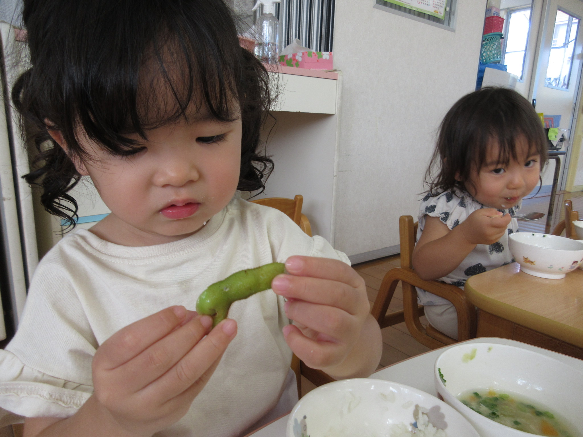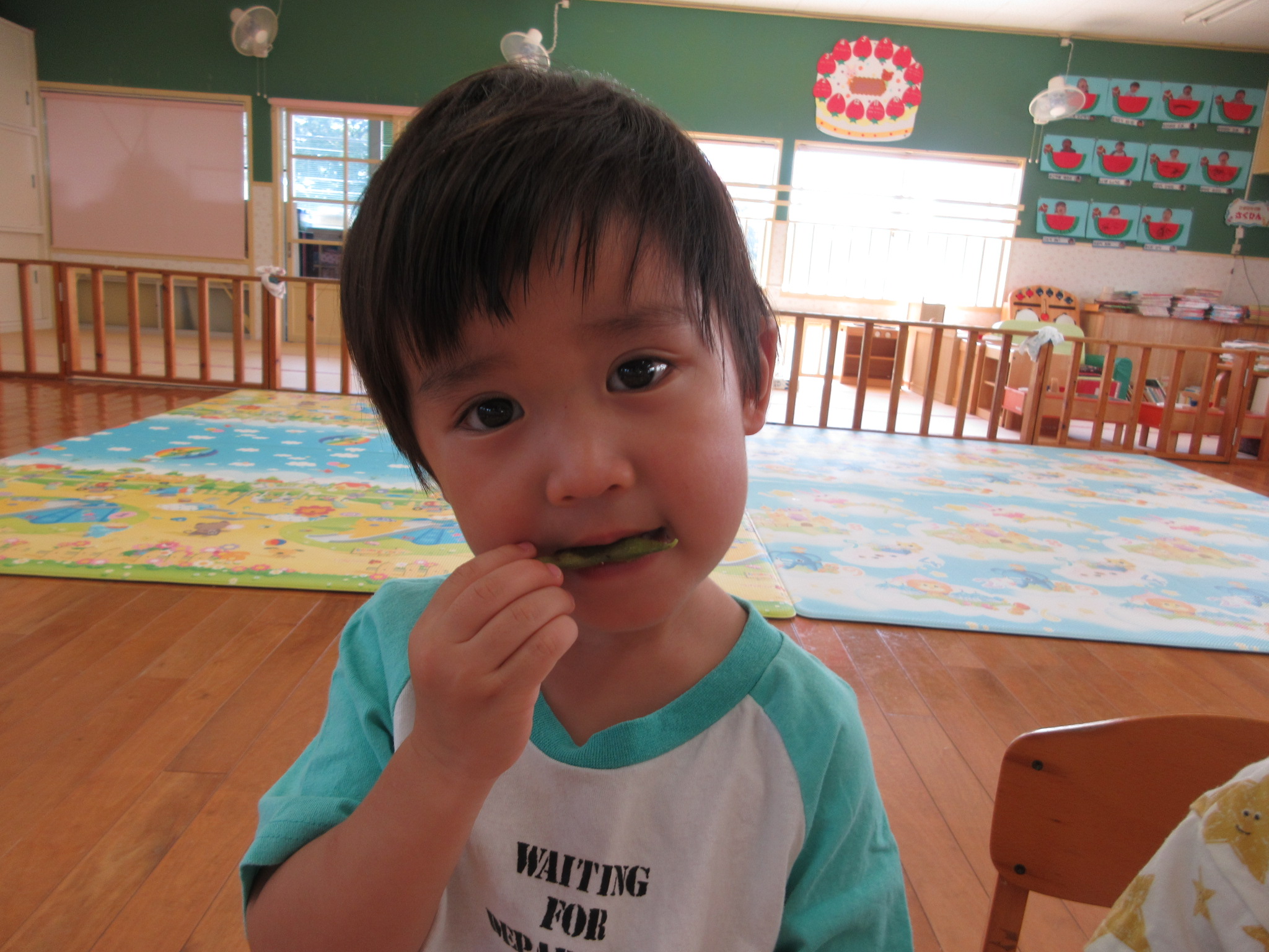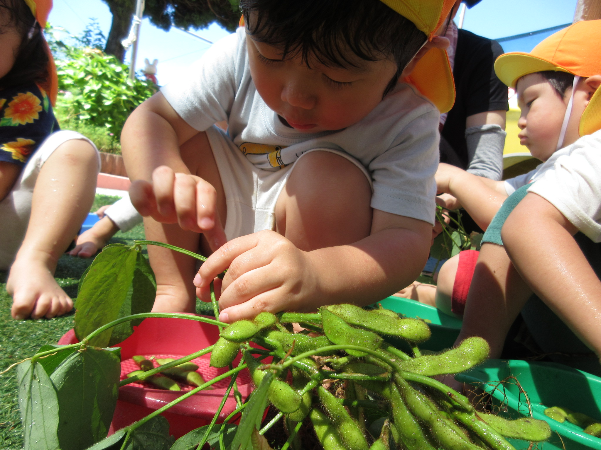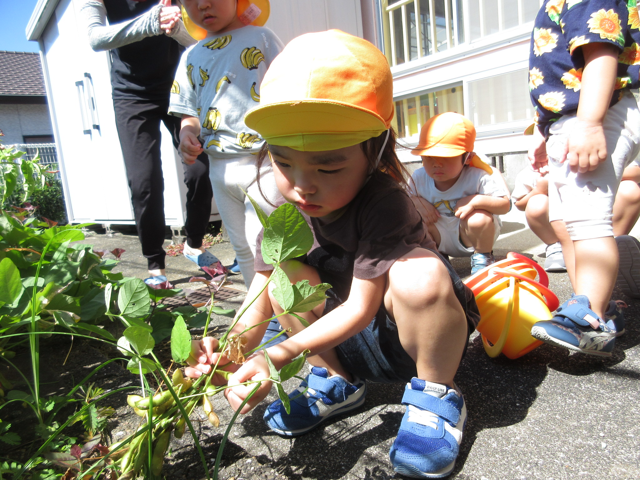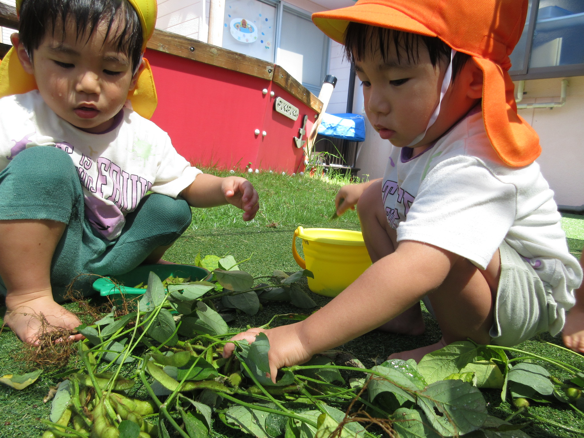 枝豆の収穫時期が来て、ひまわり組がプチプチと茎からとってくれました。