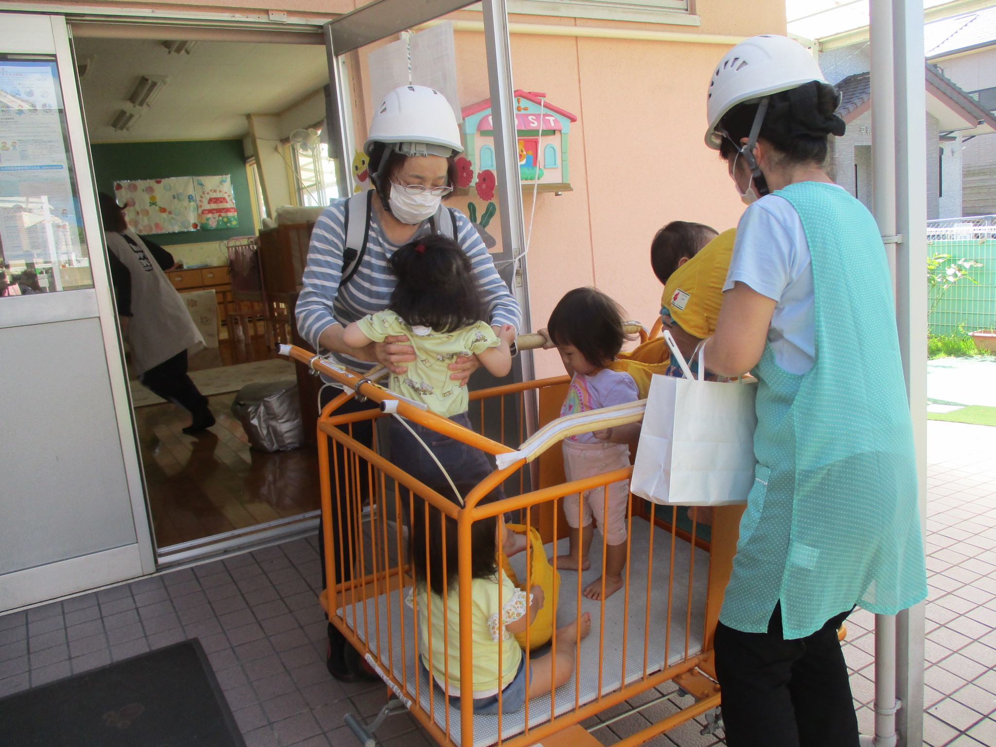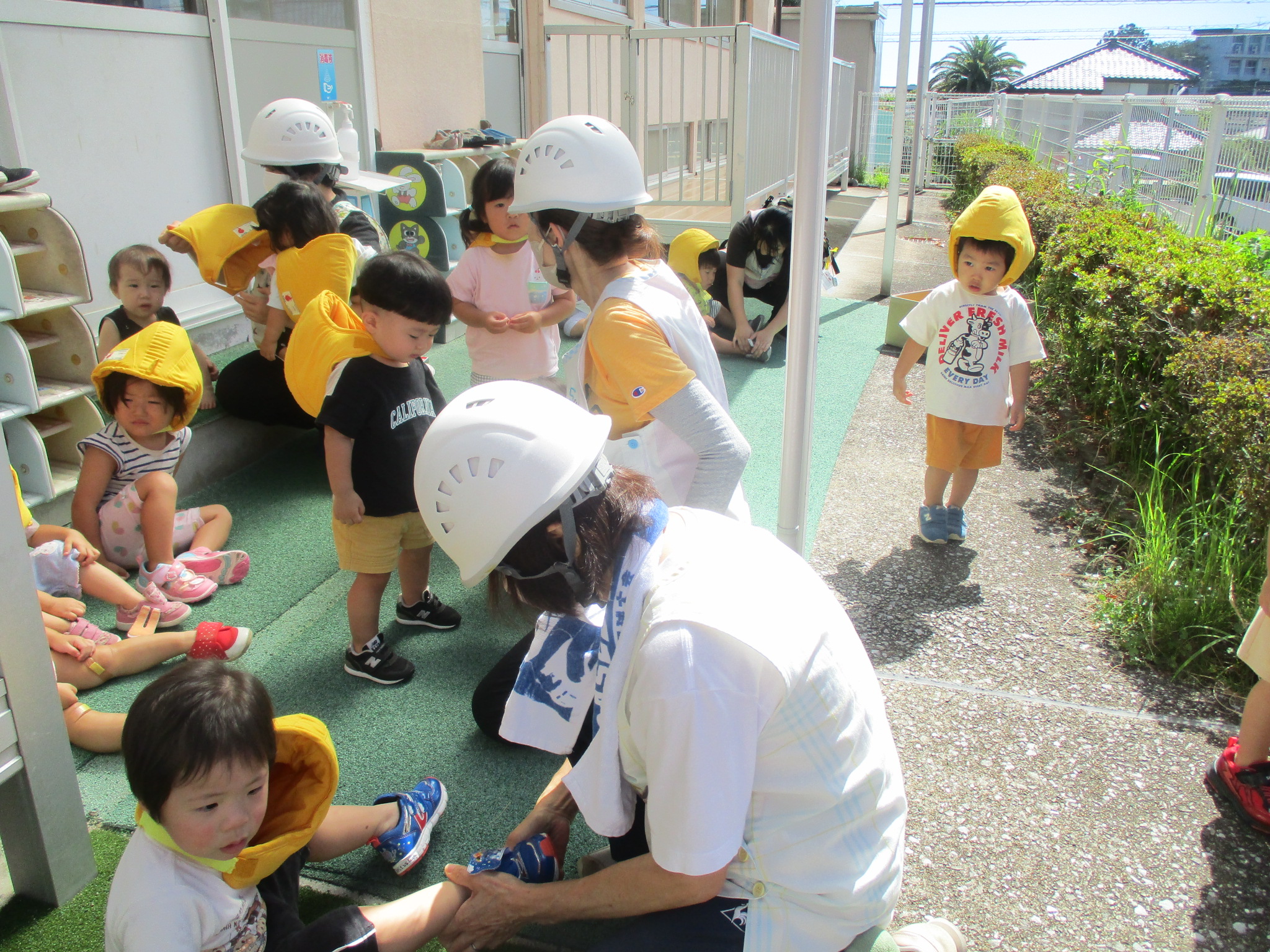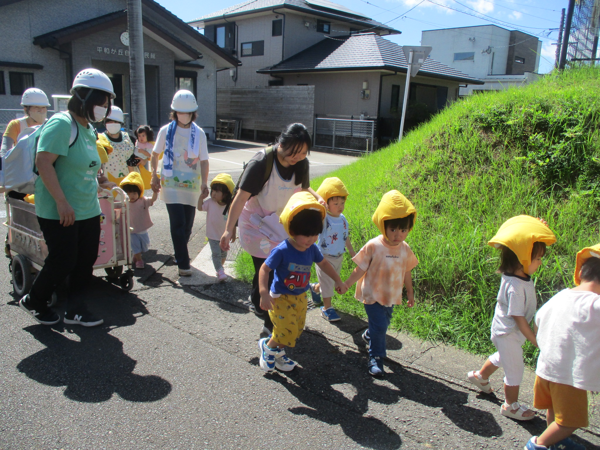 9月 防災訓練1 9月は、地震により給食室のガスが漏れたという設定での避難訓練を行いました。 地震を知らせる職員の拡声器のサイレンにびっくりする子ども達もいましたが、防災頭巾を被って、みんなで平和が丘公園に避難することができました。