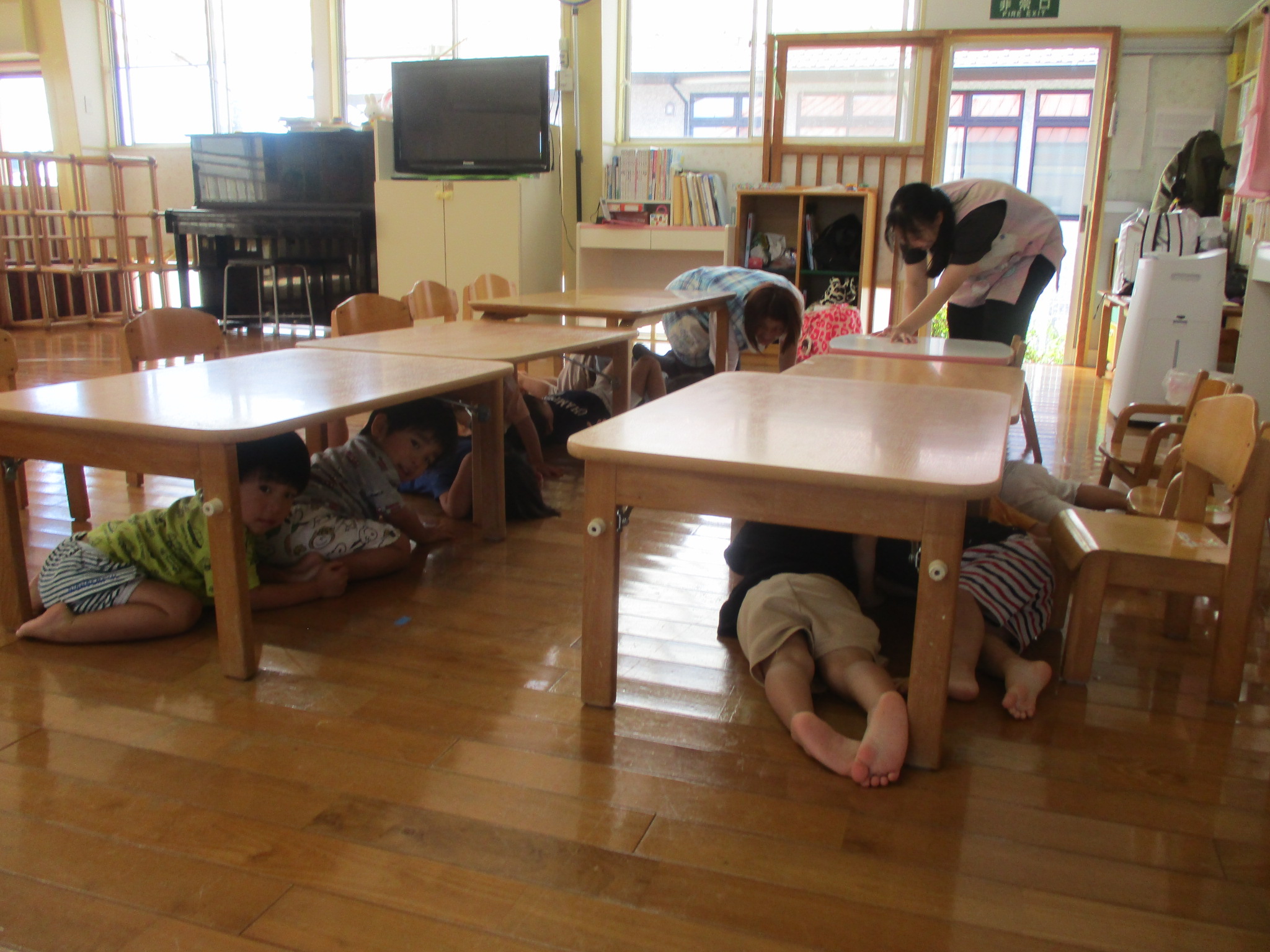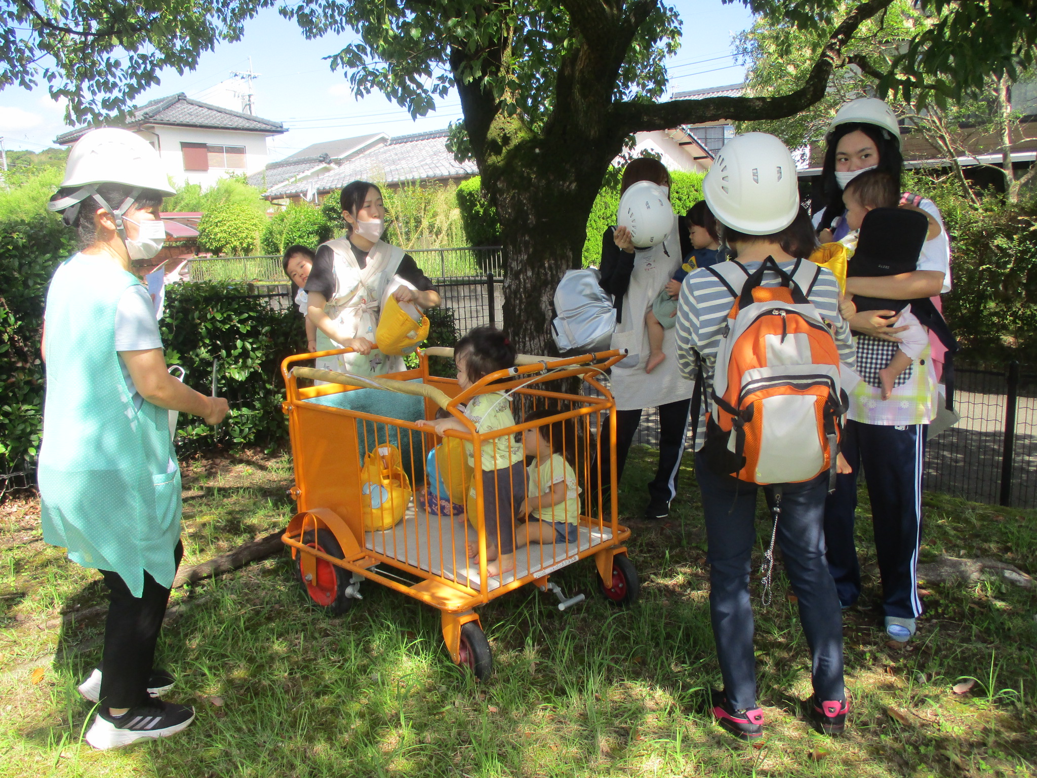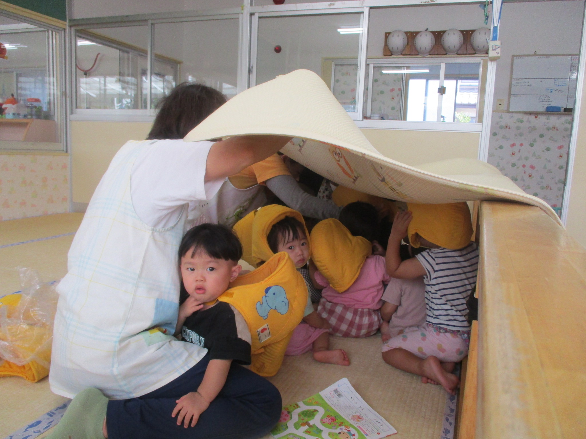 9月 防災訓練1 9月は、地震により給食室のガスが漏れたという設定での避難訓練を行いました。 地震を知らせる職員の拡声器のサイレンにびっくりする子ども達もいましたが、防災頭巾を被って、みんなで平和が丘公園に避難することができました。