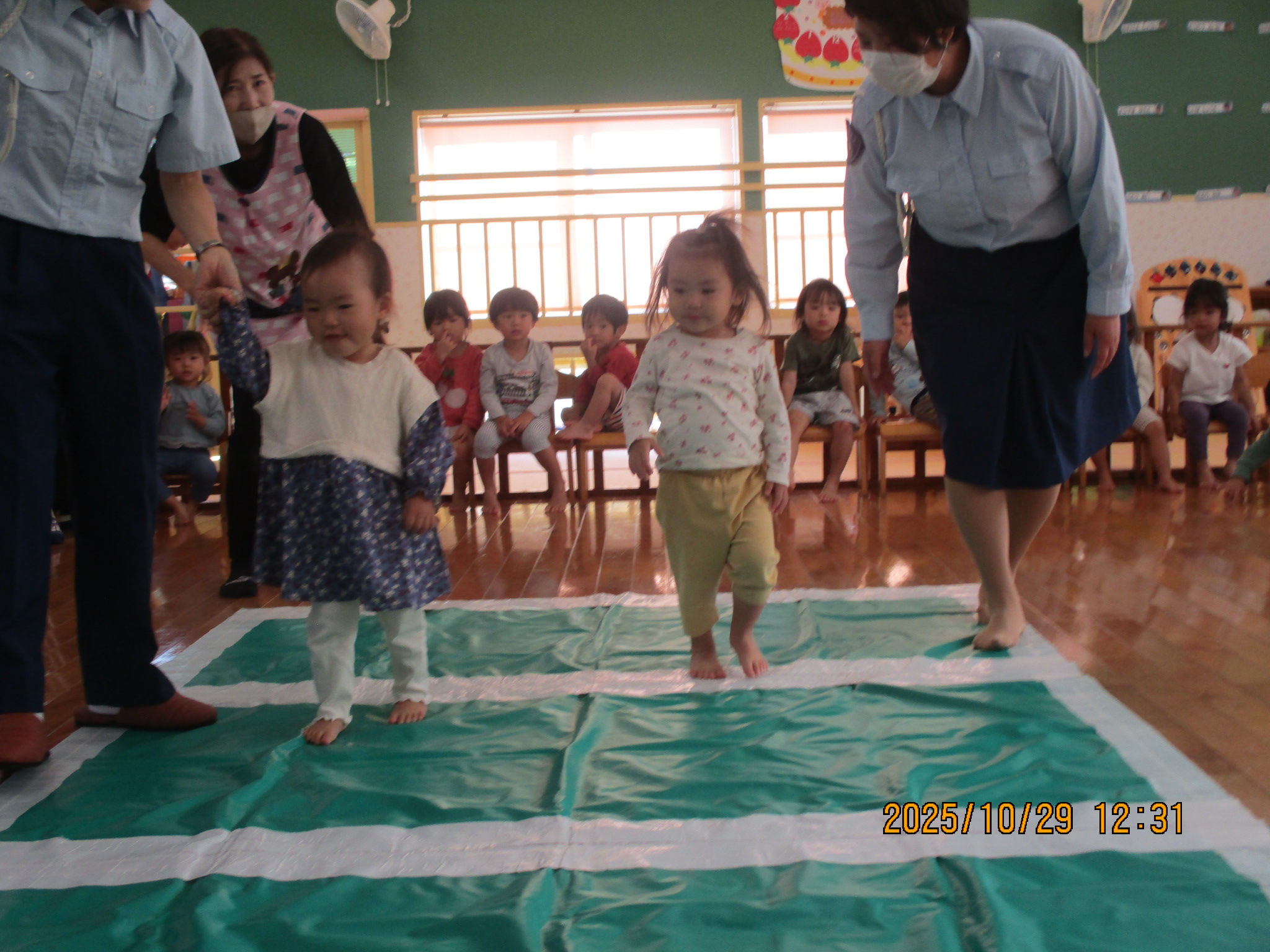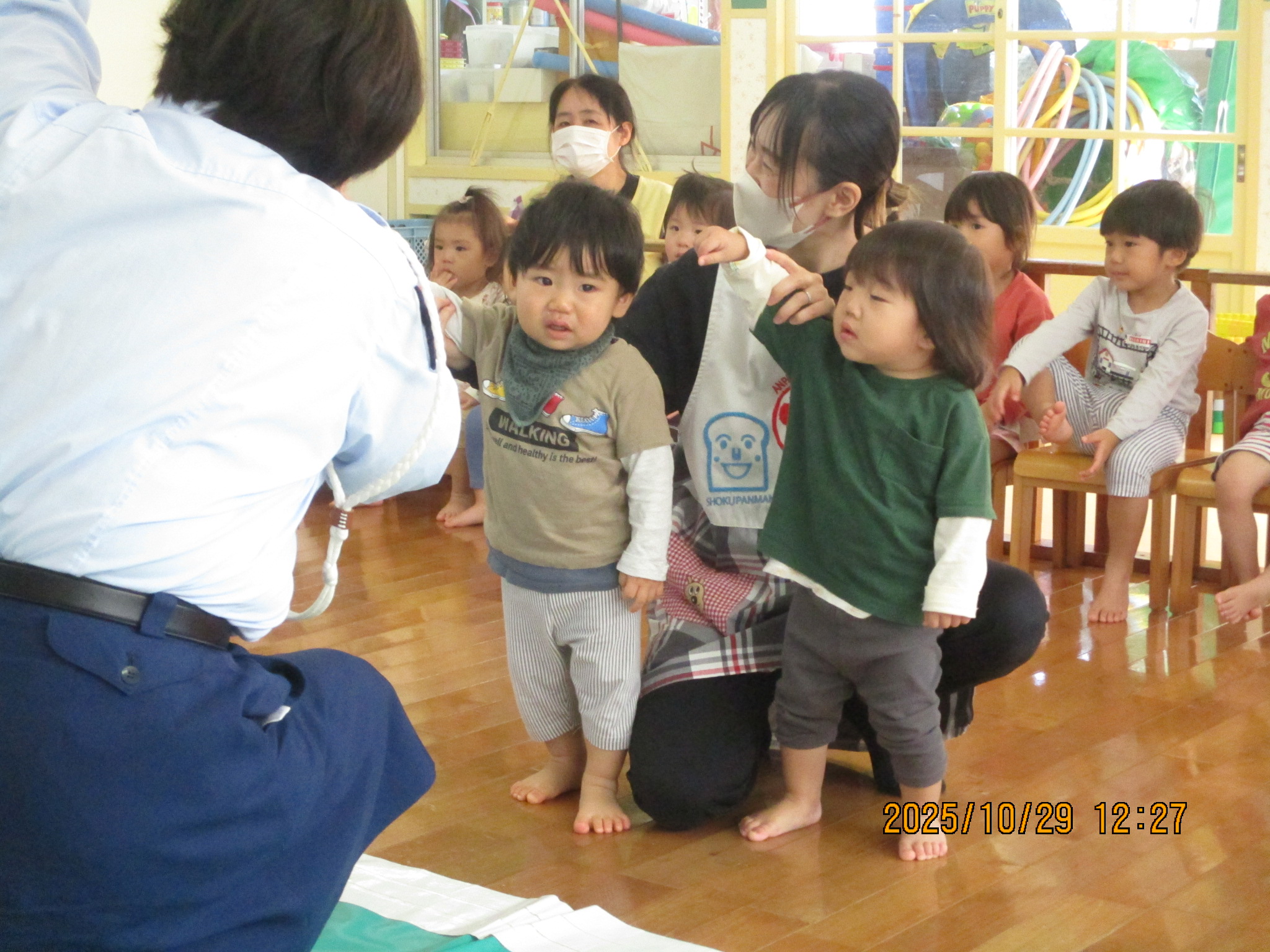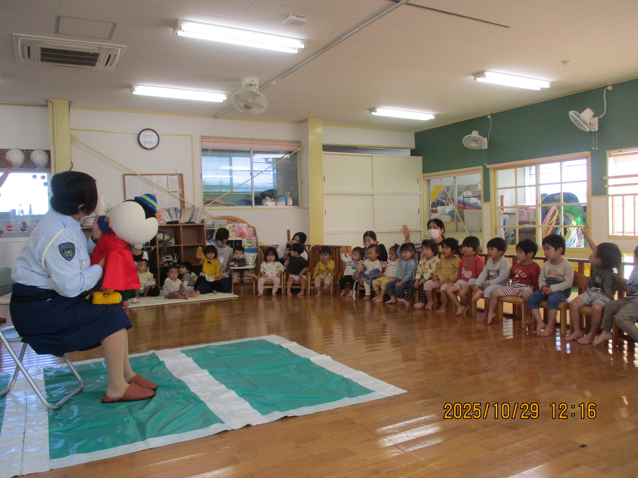 10月 交通安全教室 29日は交通安全教室に参加しました。 交通指導員のお姉さんと『まもりん』が保育園に来てくれて、子ども達に交通ルールを教えてくれました。 子ども達は、「右よーし、左よーし、もう一度右よーし!」と、手を挙げながら横断歩道を渡りました。ちょっぴり緊張している姿も見られましたが、これからのお散歩や園外での行事にきっと役に立つことと思います‼