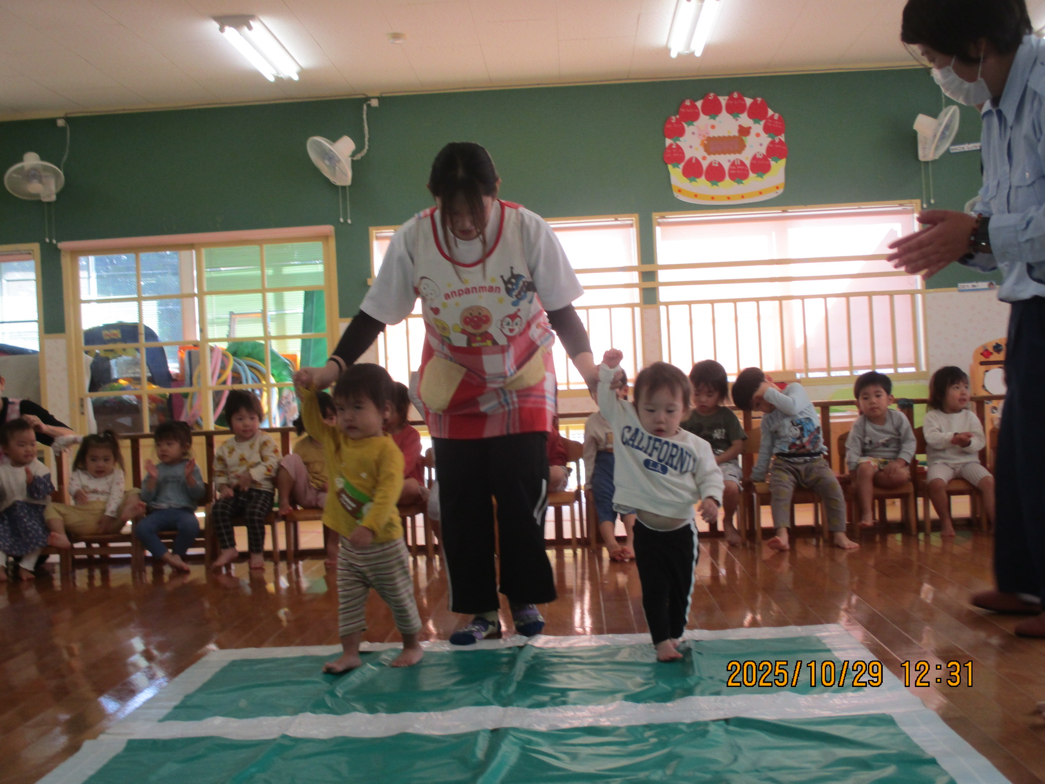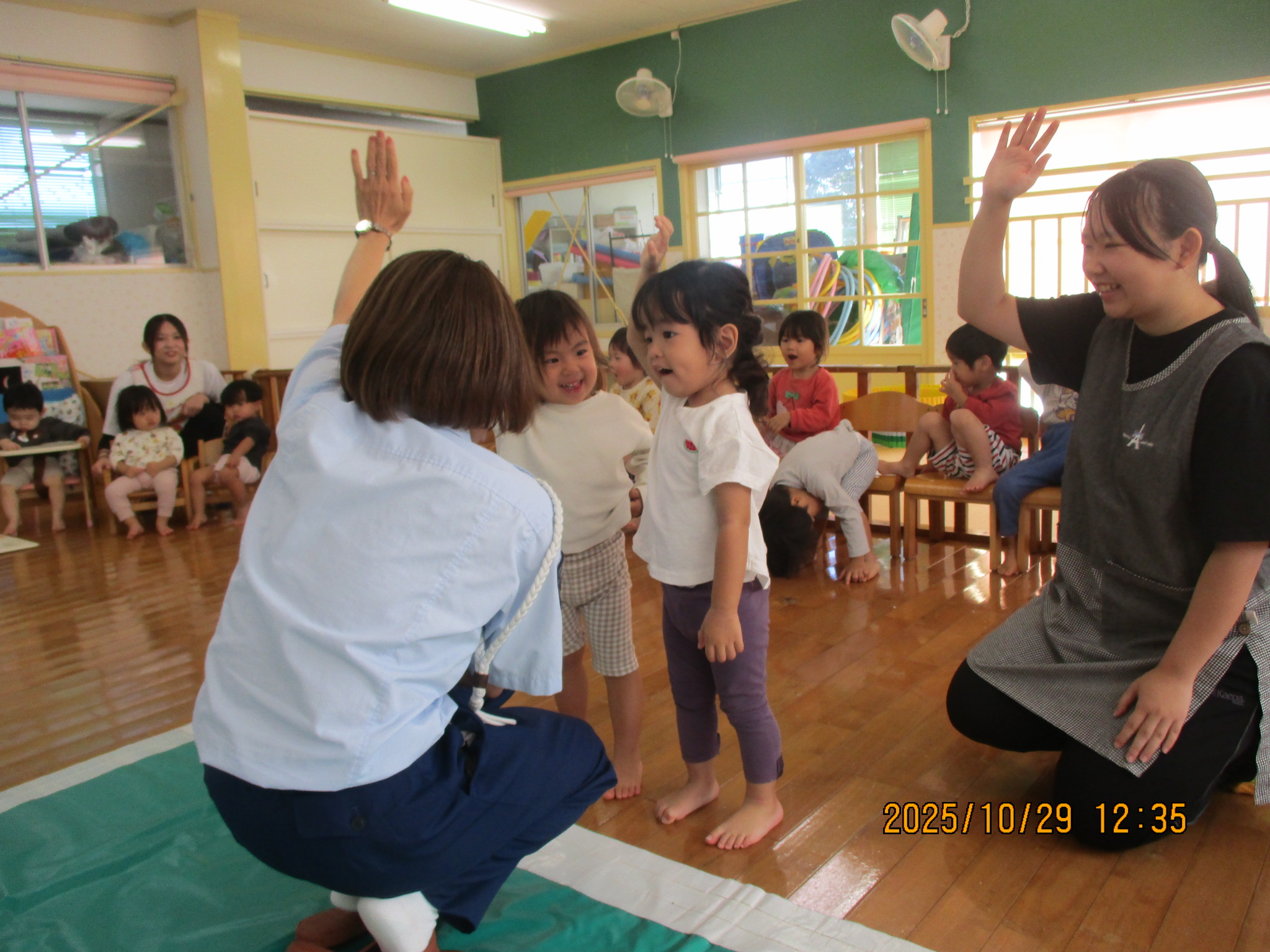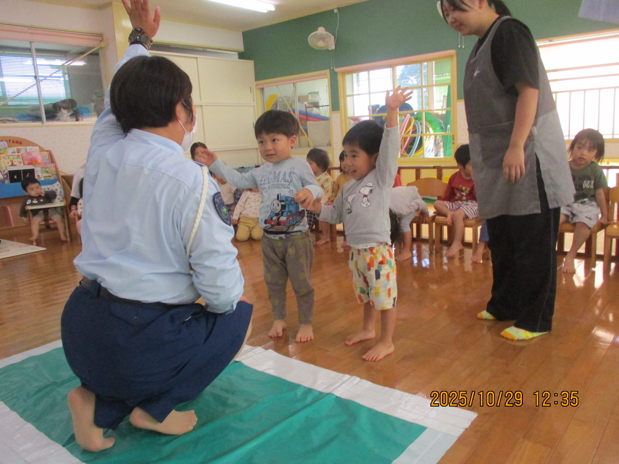 10月 交通安全教室 29日は交通安全教室に参加しました。 交通指導員のお姉さんと『まもりん』が保育園に来てくれて、子ども達に交通ルールを教えてくれました。 子ども達は、「右よーし、左よーし、もう一度右よーし!」と、手を挙げながら横断歩道を渡りました。ちょっぴり緊張している姿も見られましたが、これからのお散歩や園外での行事にきっと役に立つことと思います‼