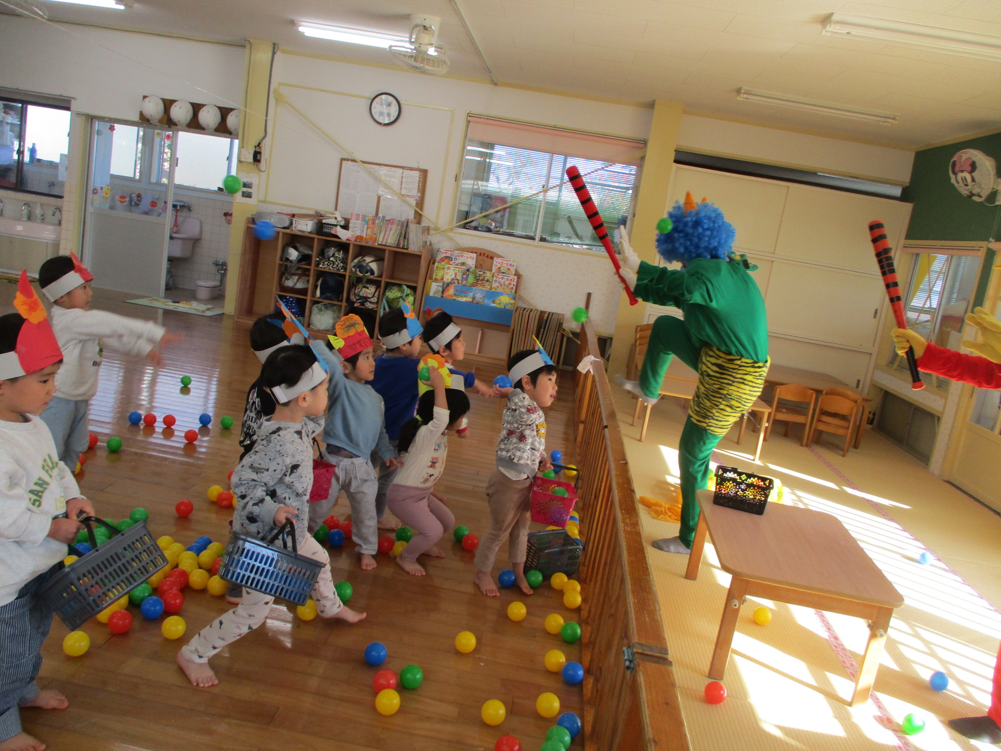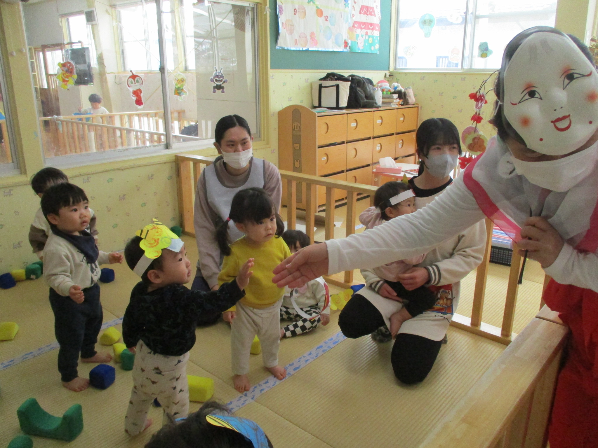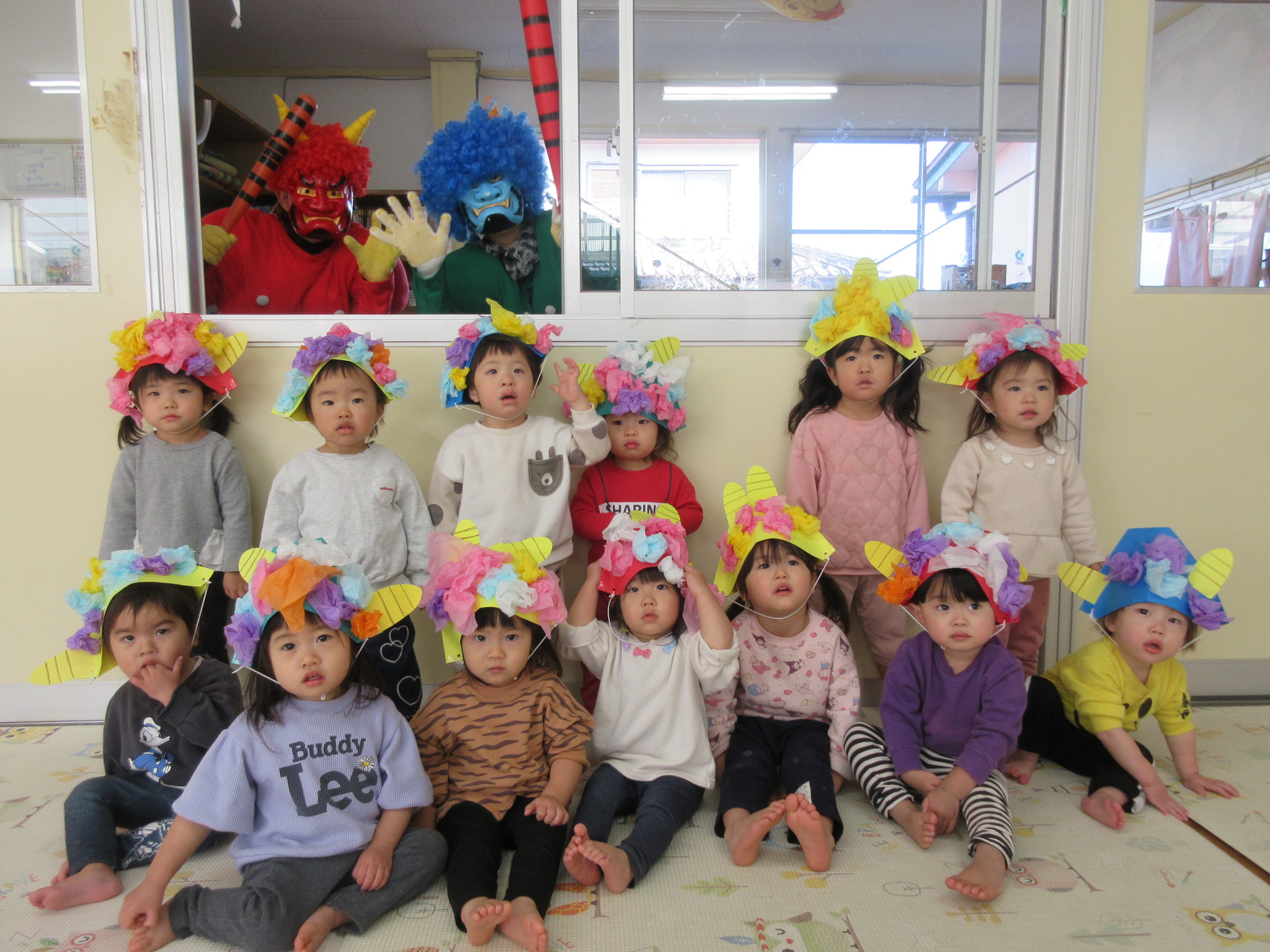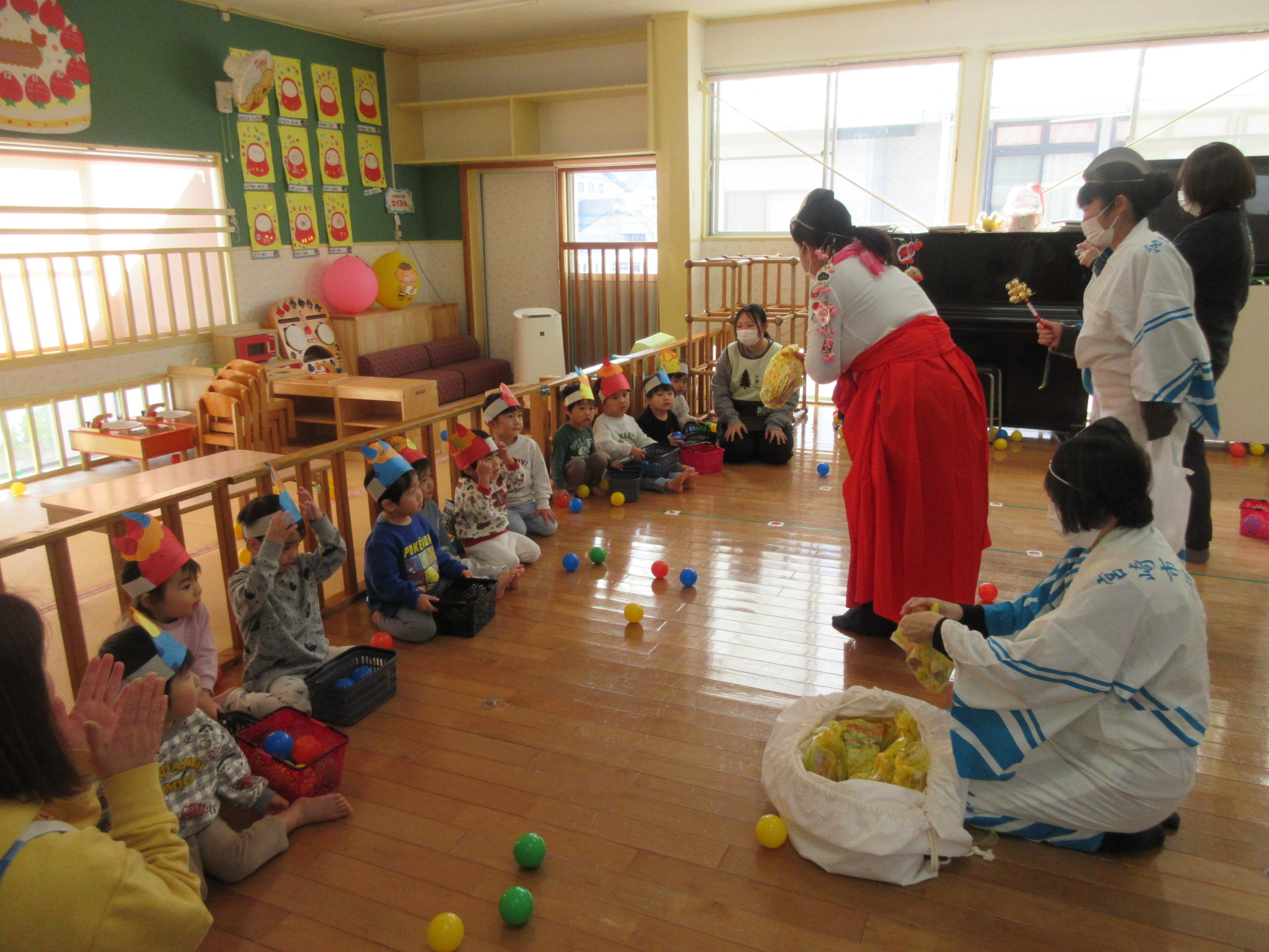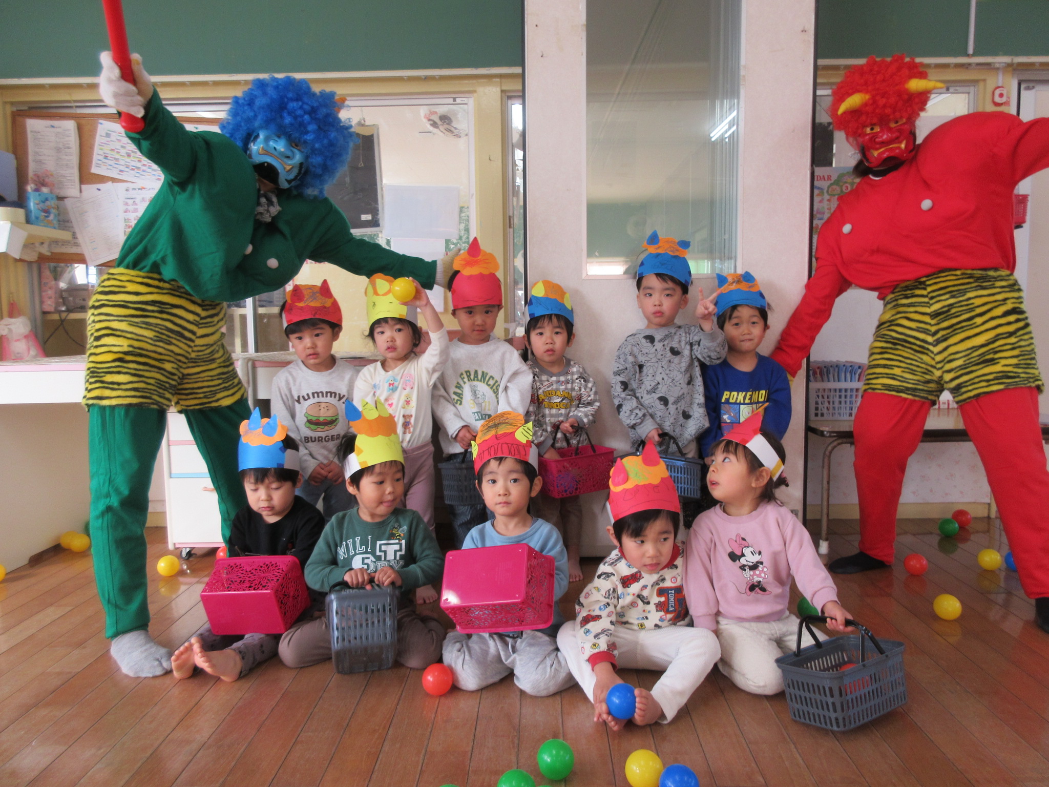 2月 豆まき 2月3日は『豆まき』。平和が丘乳児保育園にも鬼さんが子ども達の心の中にいる悪い鬼を退治しにやってきてくれました。 ちょっぴり怖がっていた2歳児のひまわり組さんでしたが、「鬼は外!」と元気よく豆に見立てたカラーボールを投げることができ、最後には鬼さんと記念写真を撮ってお別れしましたよ。 鬼さんが帰った後には、「福の神」が現れて子ども達はお菓子をもらい、にっこり笑顔になりました。