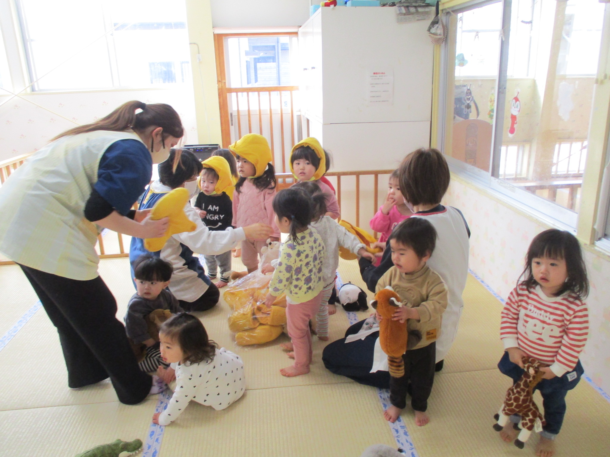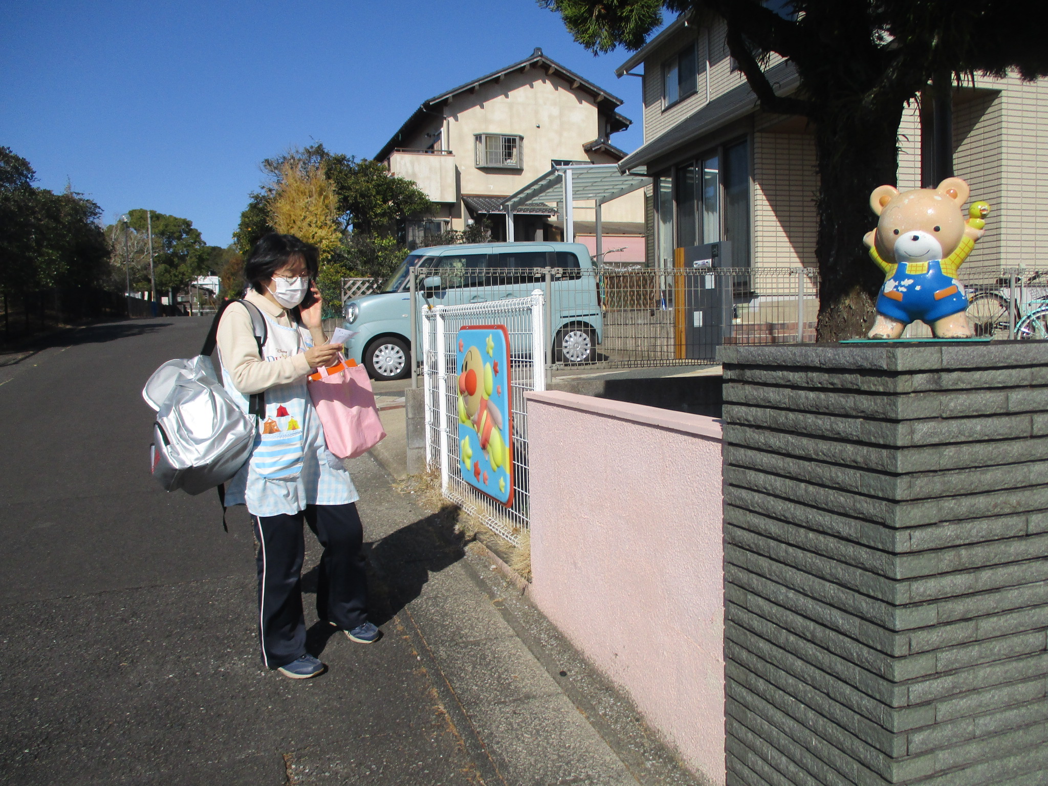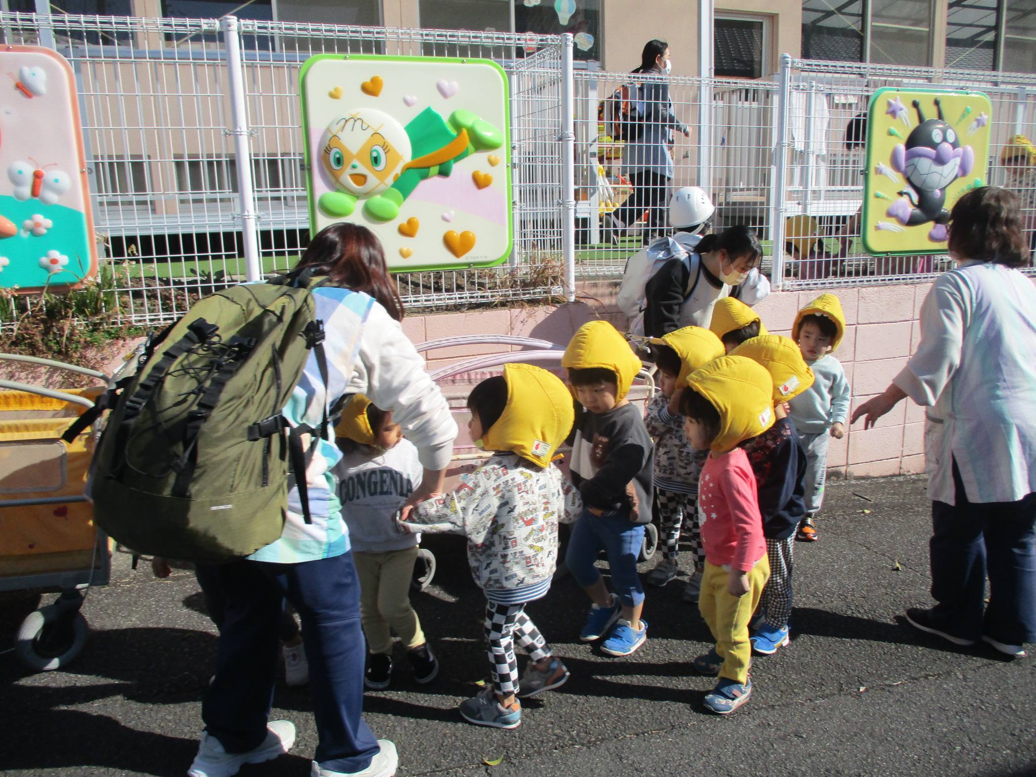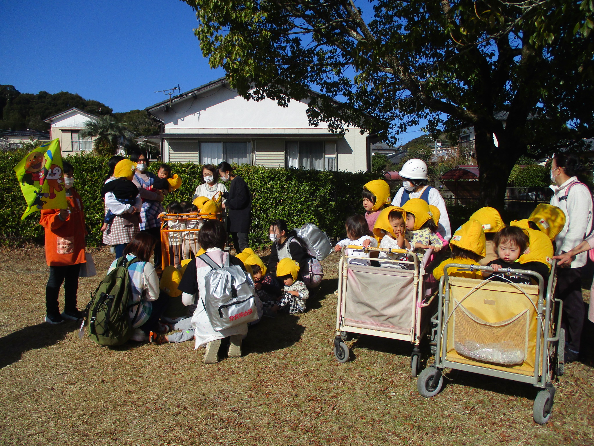 2月 避難訓練(通報訓練) 今月の避難訓練は、厨房から火災が発生し、実際に消防署へ通報をする訓練を行いました。 拡声器のサイレンの音にびっくりして涙の出た子どももいましたが、みんな落ち着いて平和が丘公園のどんぐりの木の広場まで避難することができました。 通報訓練も、指令管制員の問いかけに正確な情報を伝えることができました。 これからも、迅速かつ安全な避難ができるようにしっかり訓練を行っていきたいと思います!