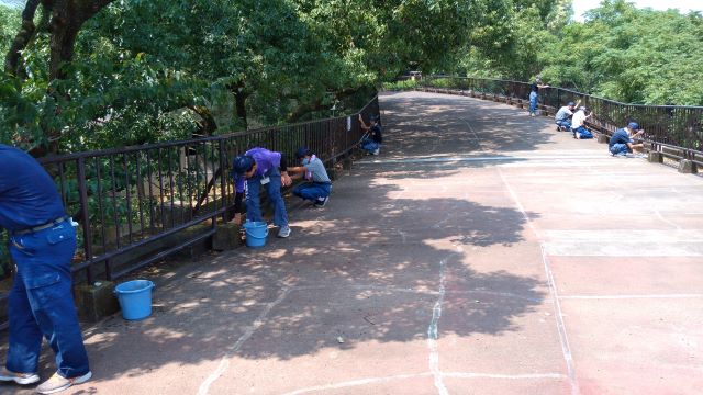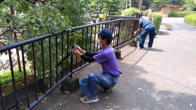 柵拭き上清掃は観覧橋の柵拭きを行います。範囲は1柵ずつ、2柵取り組みます。2柵終わると次の場所に移動し拭き清掃を続けていきます。
