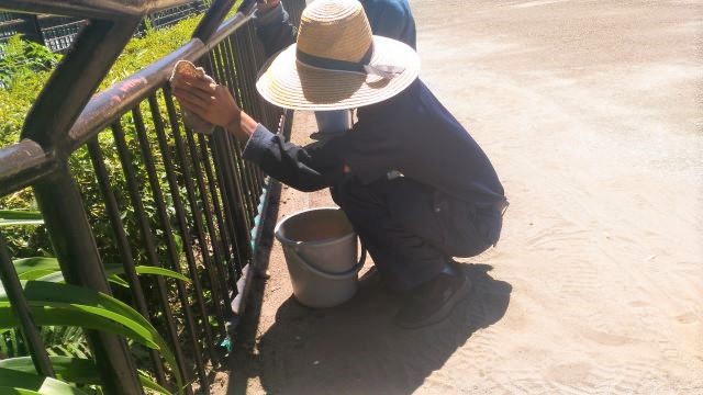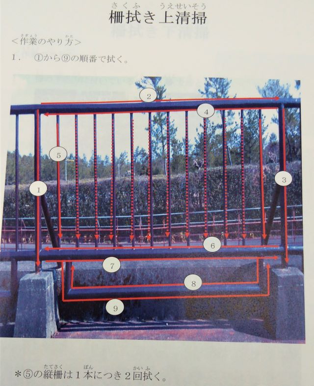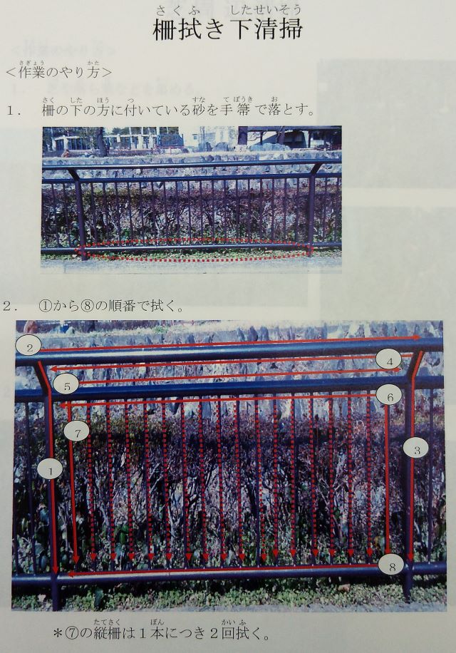 柵拭き清掃には「上」と「下」2か所あり、作業の場所、道具、手順も少しですが違いがあります。