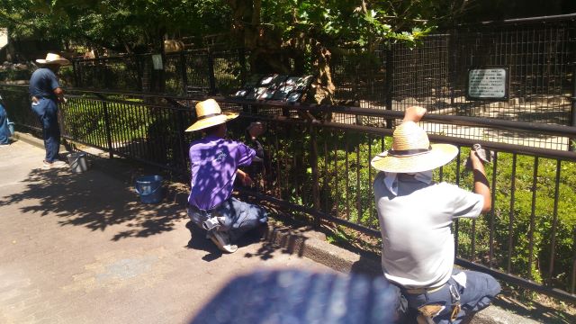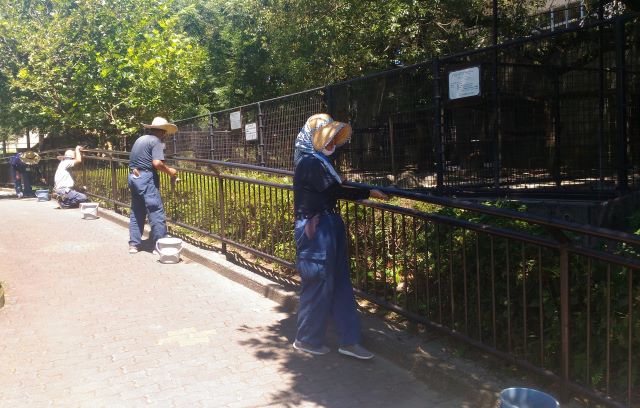 柵拭き下清掃は、ラマ周辺からトラ周辺までの柵拭きを行います。柵上清掃と違い手箒を使い柵の下についた砂を落とす工程があります。