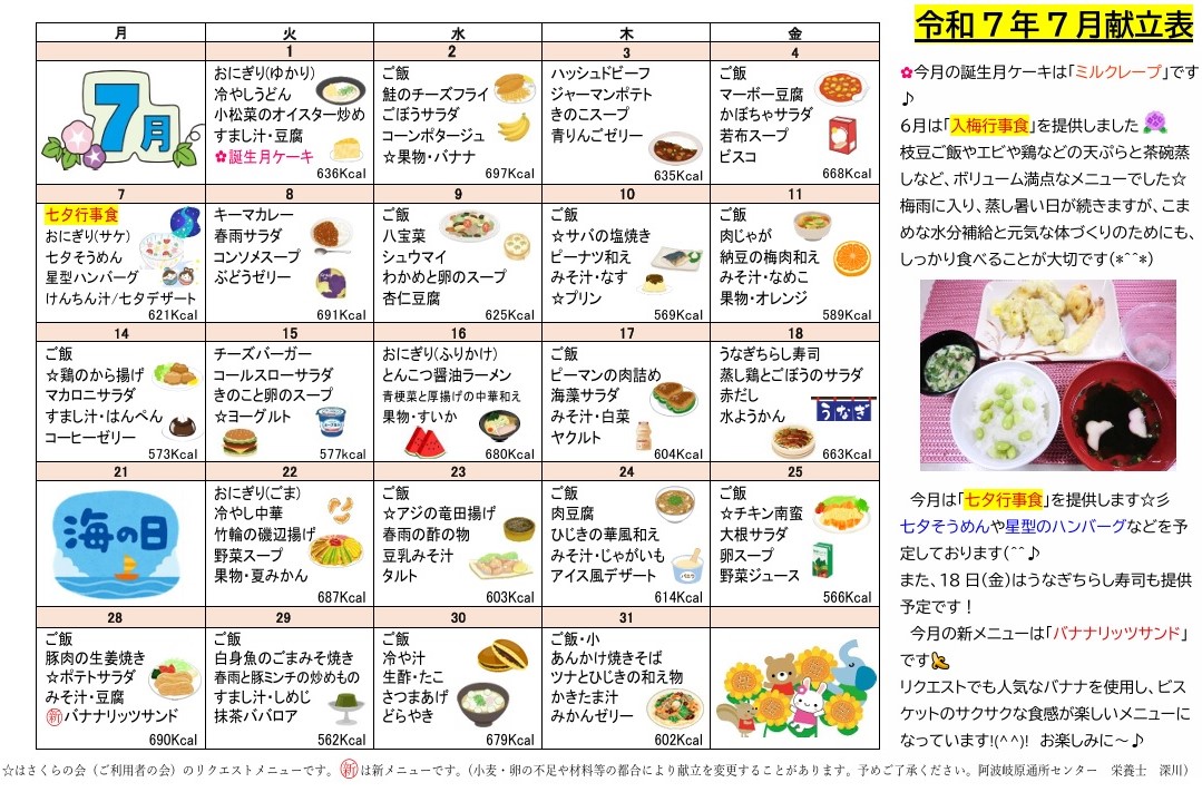 阿波岐原通所センターだより「夢通信」7月号 6月中に梅雨も明けて暑い日が続いていますね。今年度の4月よりSDGs活動の取り組みとして、グループのみんなで公園や公共施設に出掛けてゴミ拾いなど皆さん頑張って取り組まれています。 今月は入梅行事食でした。旬の枝豆ご飯やエビ・鶏の天ぷらなど、ボリューム満点の美味しい食事で皆さん、お腹一杯にされていました。