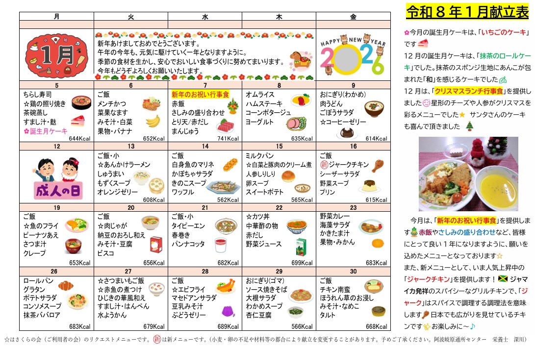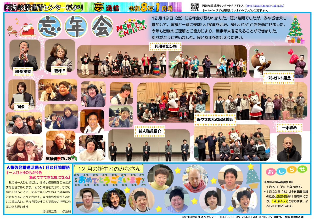 阿波岐原通所センターだより「夢通信」1月号 12月19日に忘年会が行われました。今年度よりご利用者による出し物も復活し、ハンドベルや音楽に合わせての手話など、練習の成果を発揮されていました。皆さんコース料理やみやざき犬の参加に盛り上がっていました。 12月の行事食は「クリスマスランチ行事食」でした。モミの木型のチキンやサンタさんのケーキなどクリスマスを彩ったメニューに皆さん喜ばれていました。来月は、新メニューの「ジャークチキン」の登場です。お楽しみに‼