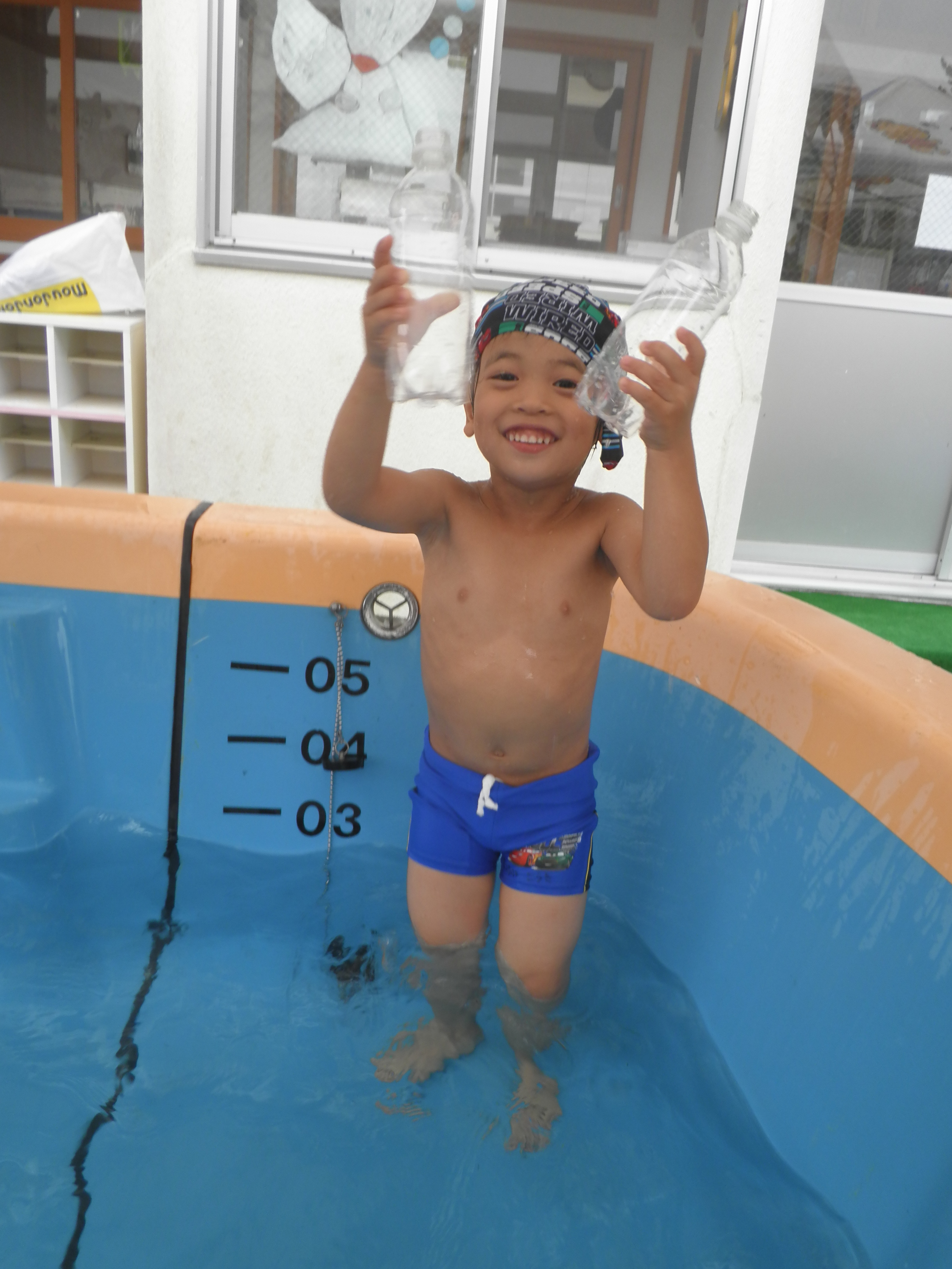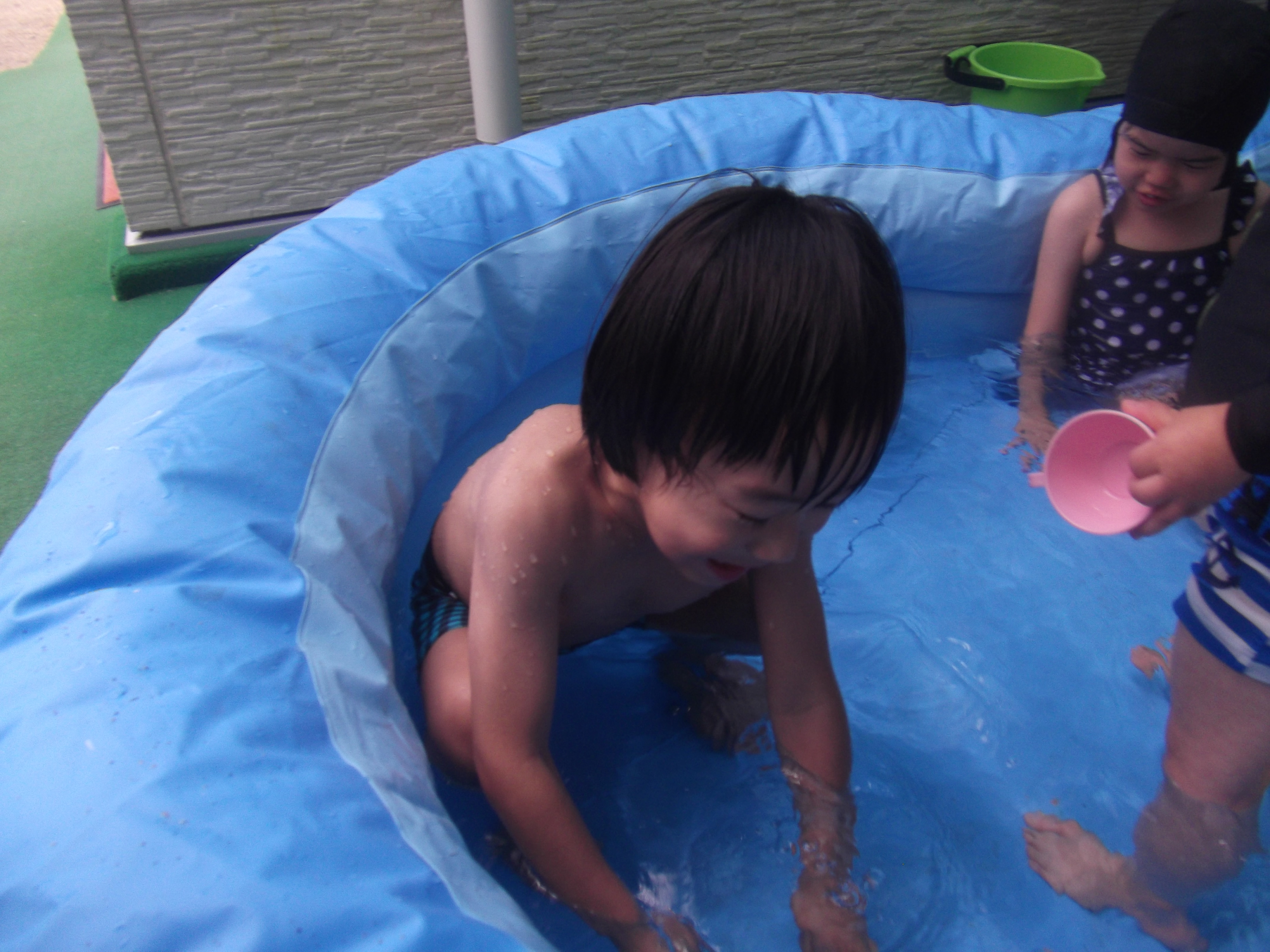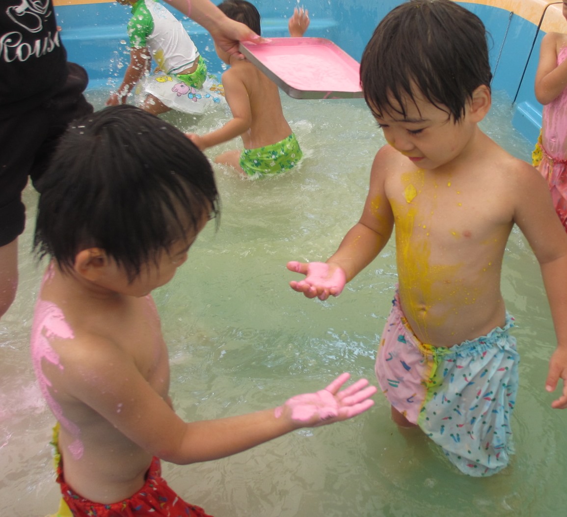 水あそび楽しいなぁ☆ 毎日暑い日が続きますが、子ども達は水あそびをしながら元気いっぱいに遊んでいます。 園庭の大きなプールに入ったり、ビニールプールで遊んだり・・・・。プールの中では、水鉄砲やペットボトルを使って水の掛け合いっこをして、暑さに負けずに遊んでいます。 時には、「ボディペインティング」をすることも。手や足だけでなく、お腹や背中、顔にもペタペタ・・・・。お友だちや先生の体にもペタペタつけて遊びました☆