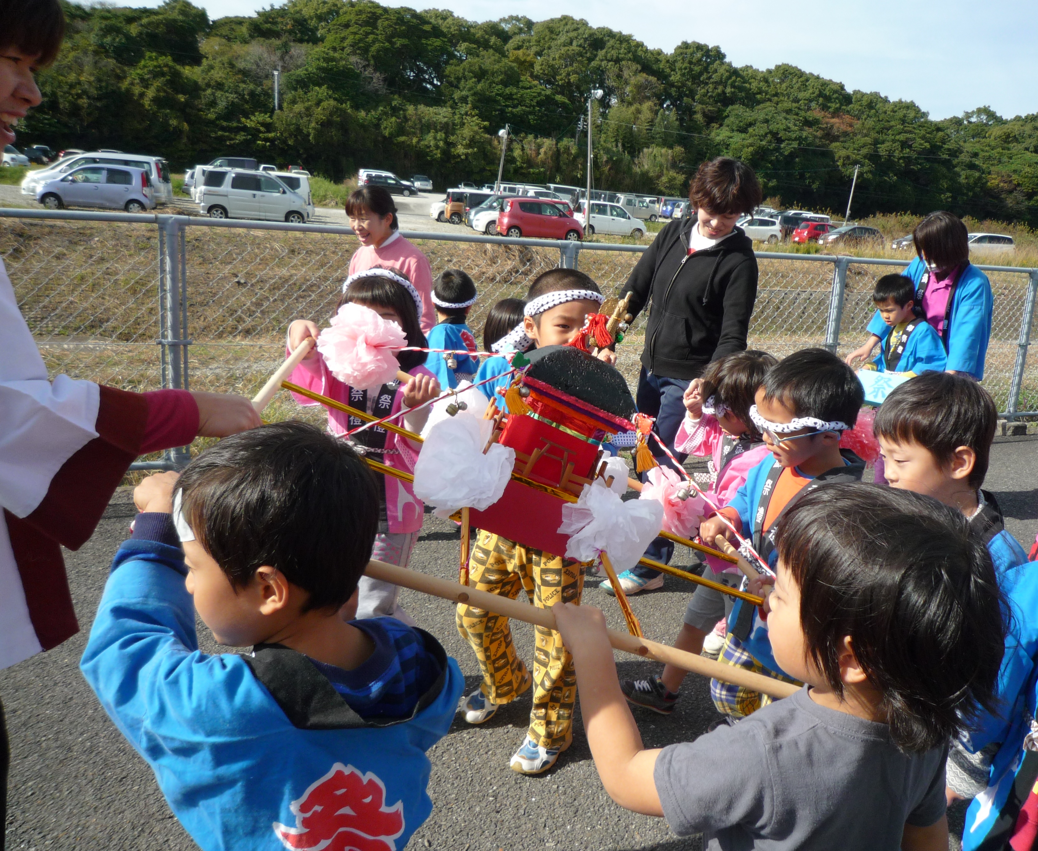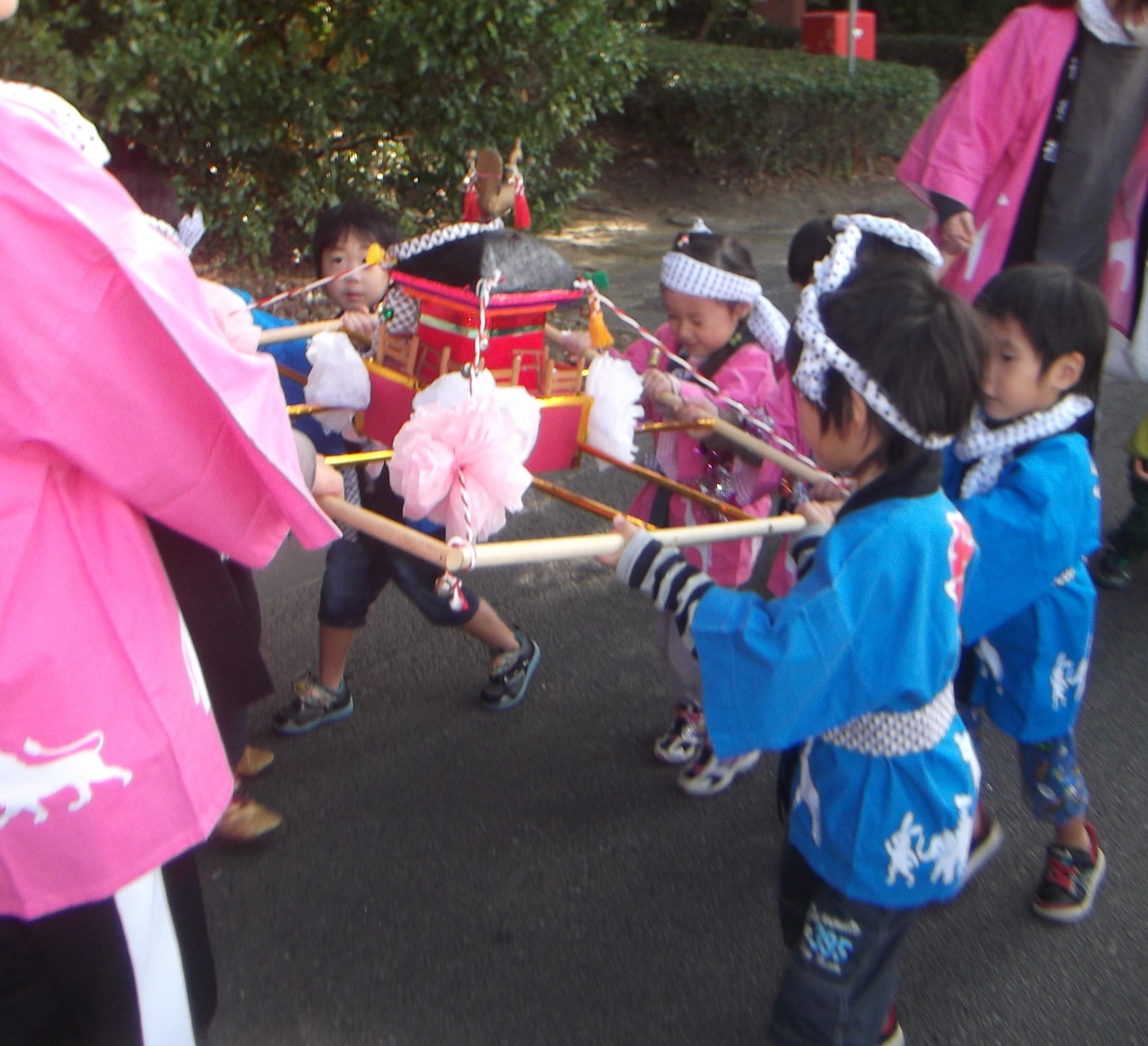 おみこしわっしょい♪ 下の写真は、「おまつりごっこ」の様子です☆ 「おまつりごっこ」では、子ども達がお神輿や賽銭箱、太鼓などを持って、園周辺の施設等をまわります。 子ども達の元気な、「わっしょい、わっしょい」の掛け声に、たくさんの方がお賽銭を入れてくださいました。 ご協力いただいた近隣施設の方々、ありがとうございました。