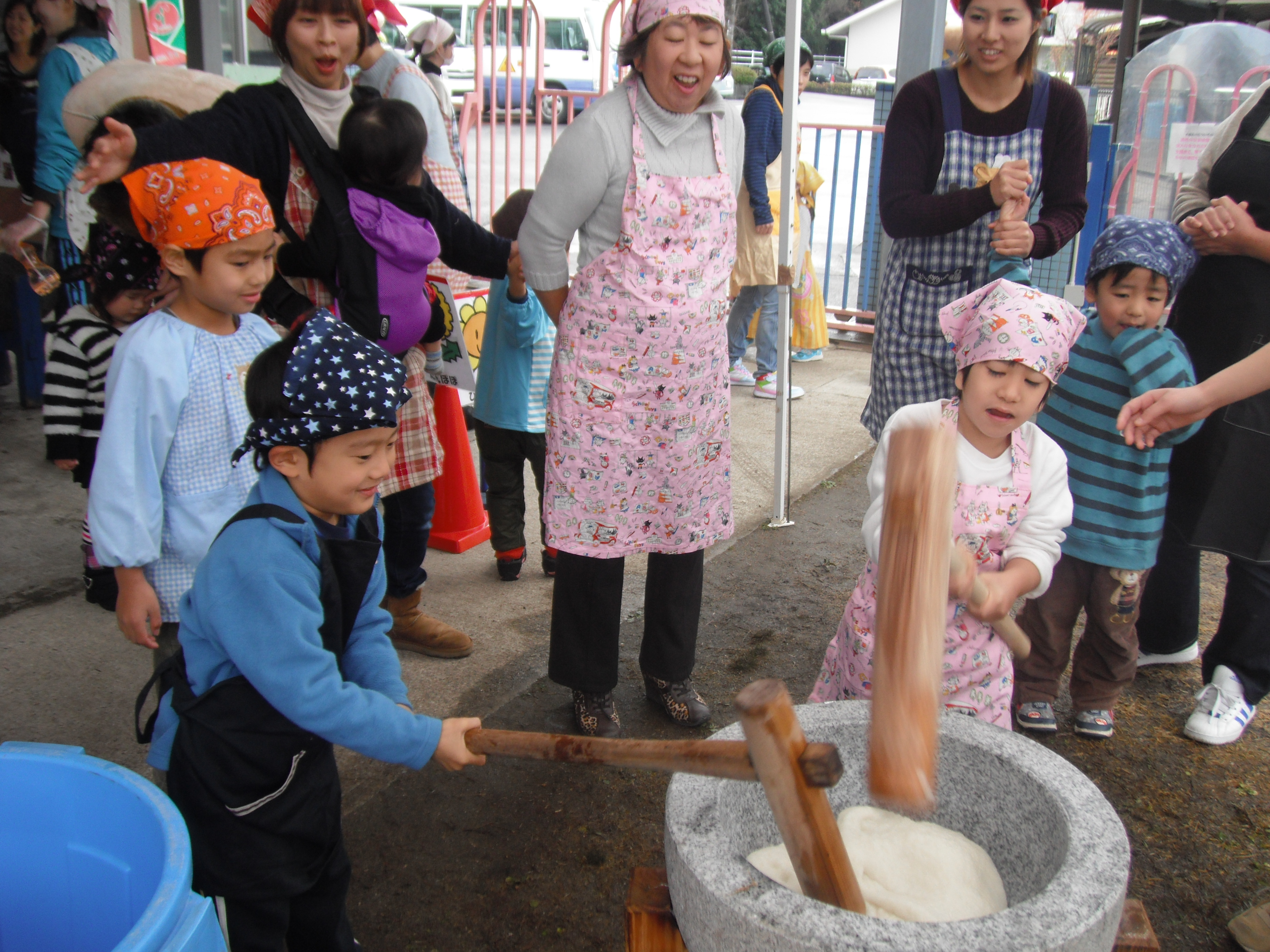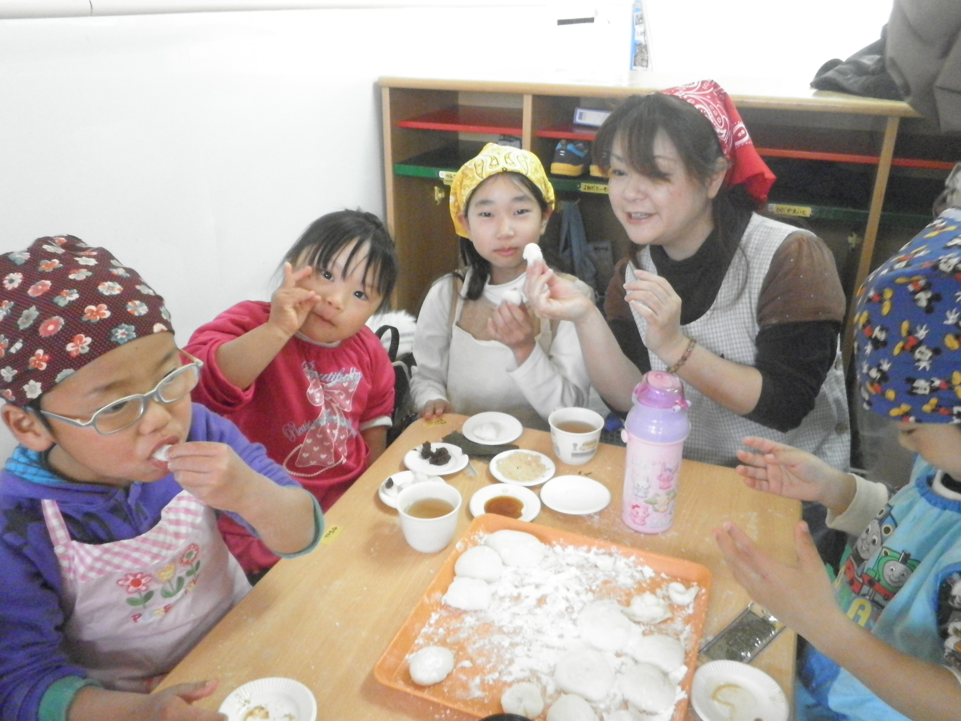クラスに分かれて、順番にペッタンペッタン。一人で杵を持ってチャレンジする子、お母さんと一緒にチャレンジする子、み~んな力いっぱいおもちをつきました。 出来上がったおもちは・・・・。教室で丸めてから、「いただきまーす」。たくさんあったお餅も、みんなのお腹の中にぜ~んぶ入ってしまいました(*^_^*)