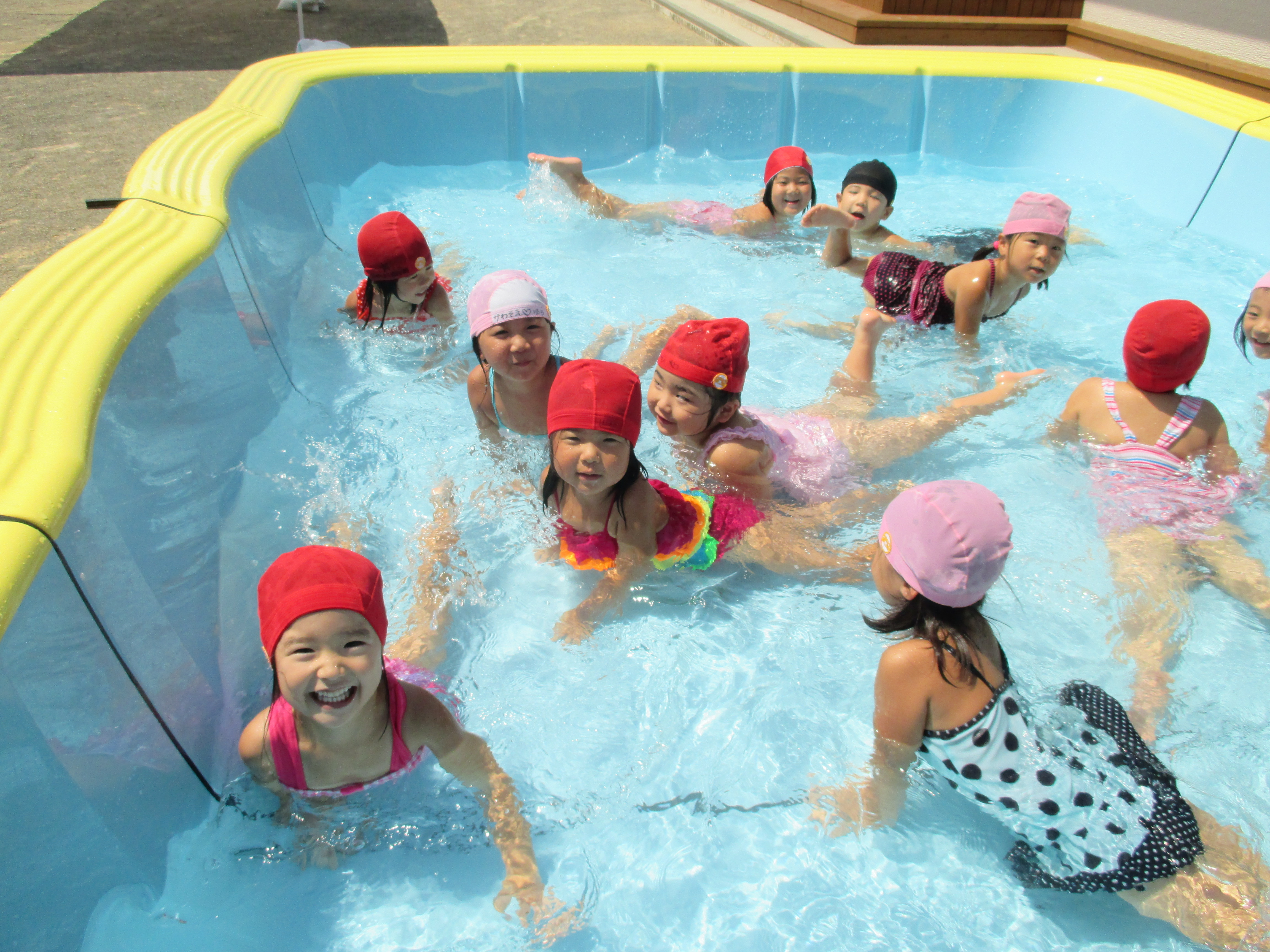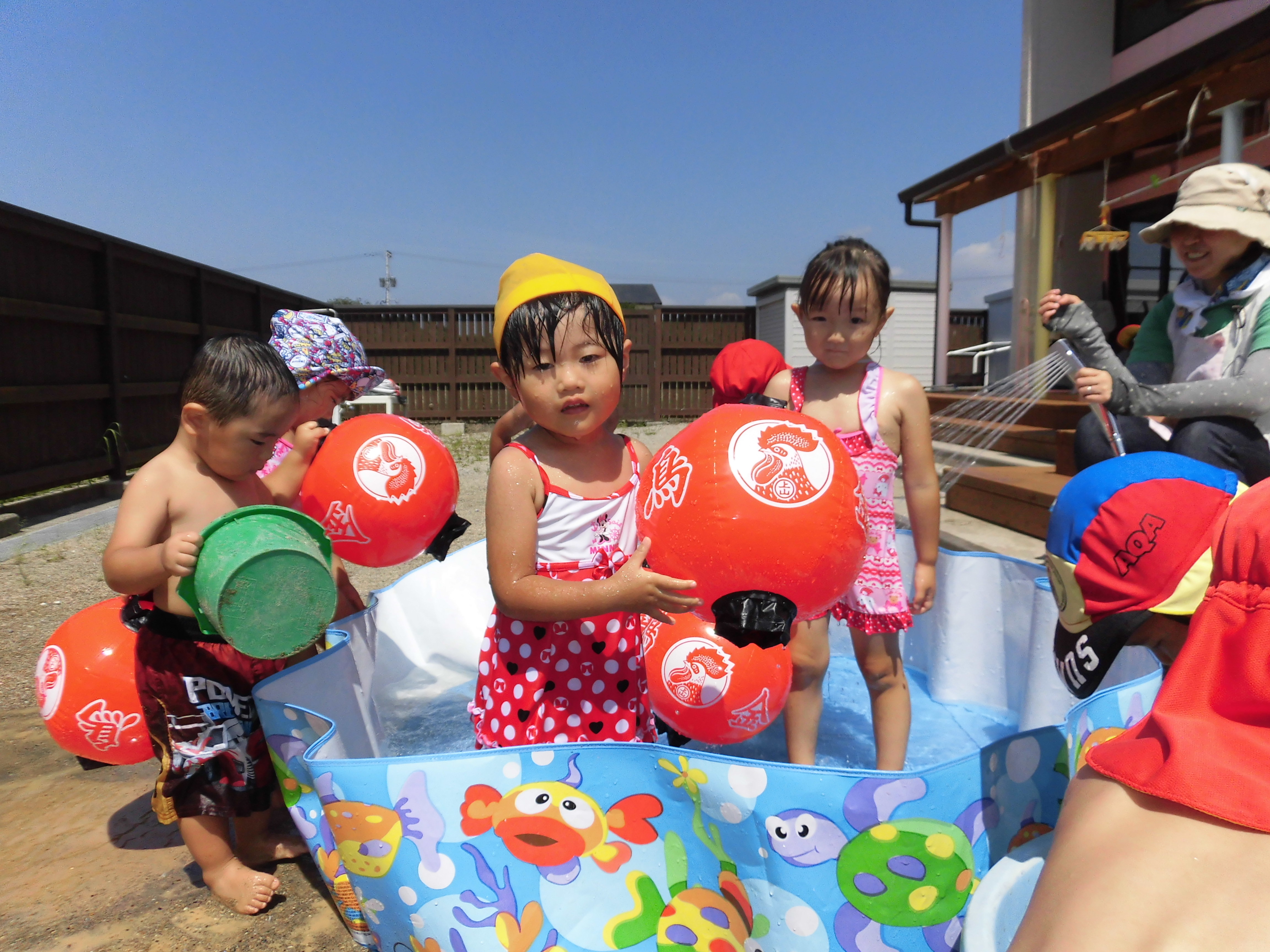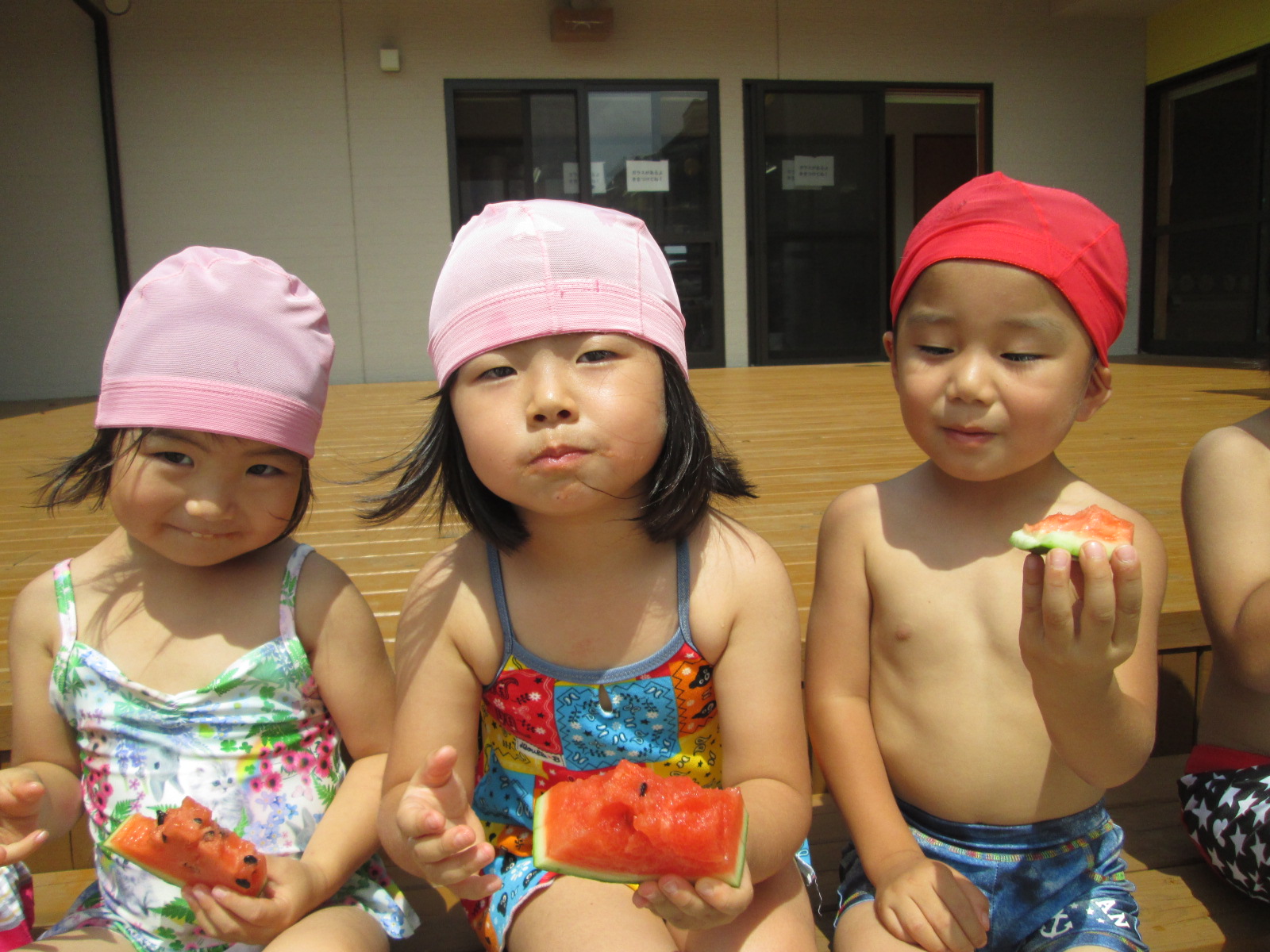 プール開き 7月12日(火) 子どもたちが楽しみにしていたスイカ割りとプール開き。年長ぐみの子どもたちが、竹で「パーン」とスイカを割ってくれました。 今年初めてのプールでの水遊びで、子どもたちは大はしゃぎ!今日から毎日プール遊びが始まります。暑い日の水遊びは最高です。
