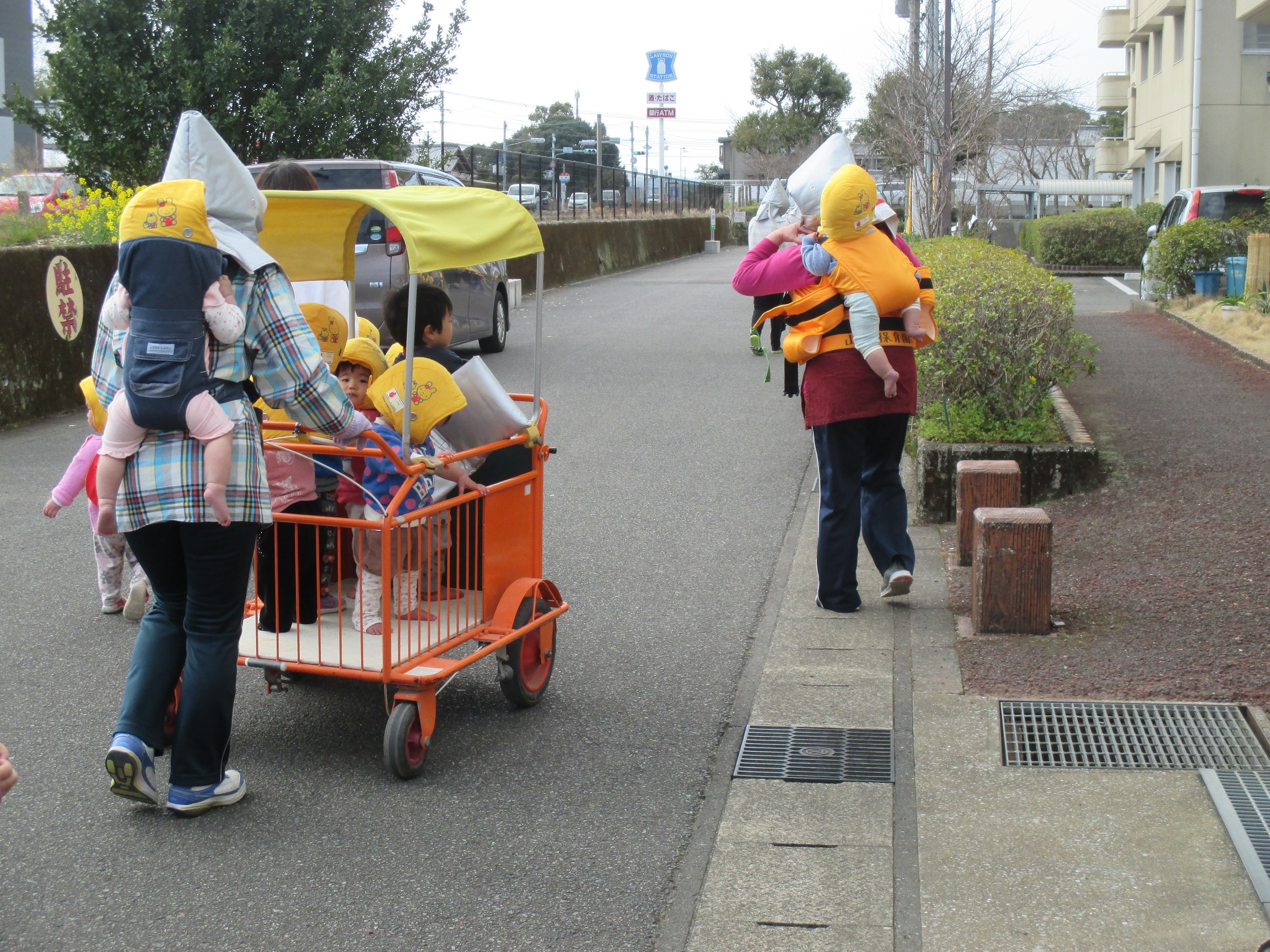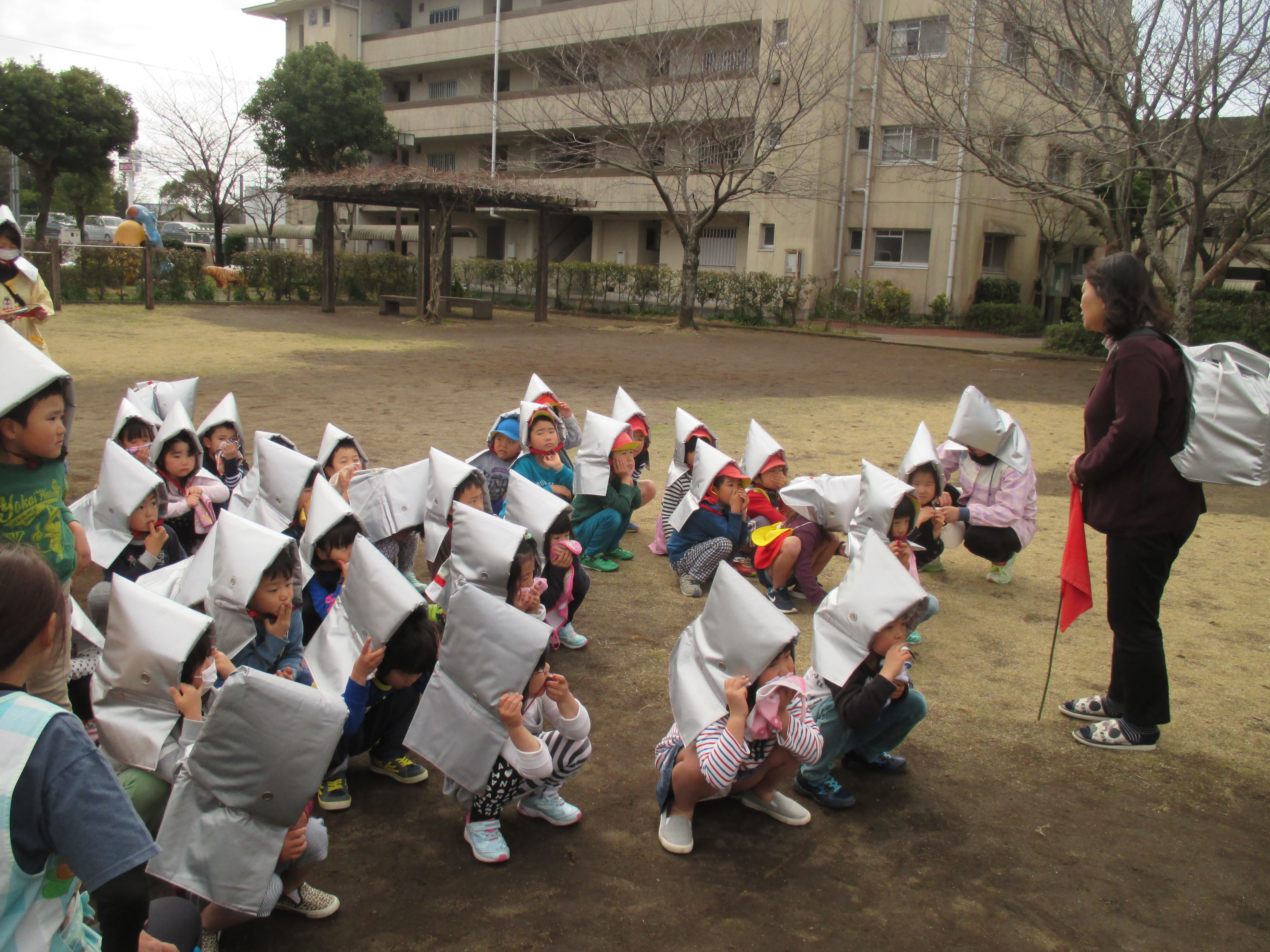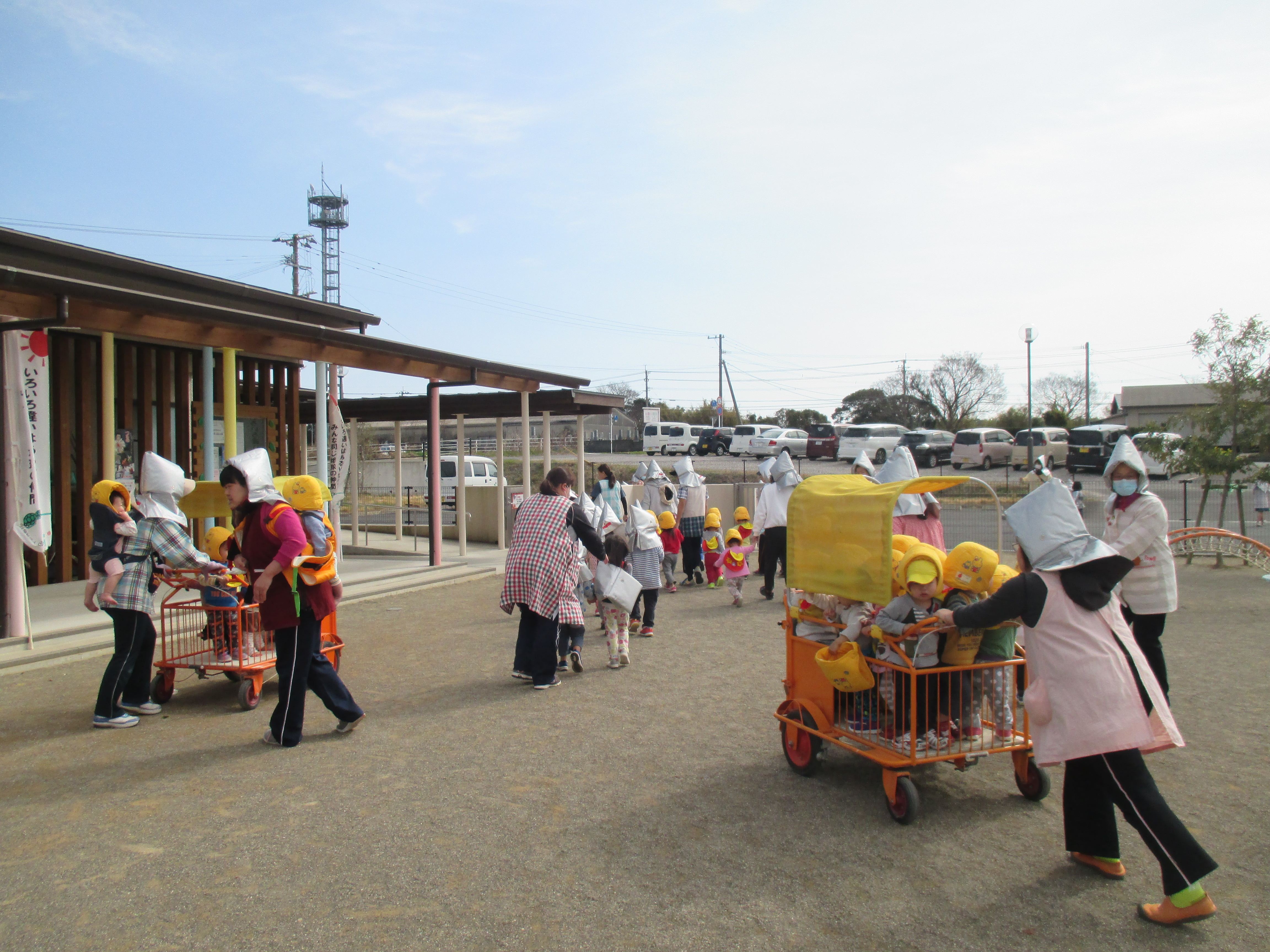 3月の避難訓練 3月16日(木) 宮崎ガスのタンクから、ガスが漏れたとの想定で避難訓練を行いました。爆発の可能性があるため、防災頭巾と靴を着用し園庭に一次避難、その後自由が丘団地集会所まで二次避難しました。 未満児の子どもたちは抱っこにおんぶ、散歩カーでの移動。以上児の子どもたちは保育士の声かけで落ち着いて団地集会所に避難することができました。 繰り返しの訓練で、自分で防災頭巾を被って避難できるようになってきています。