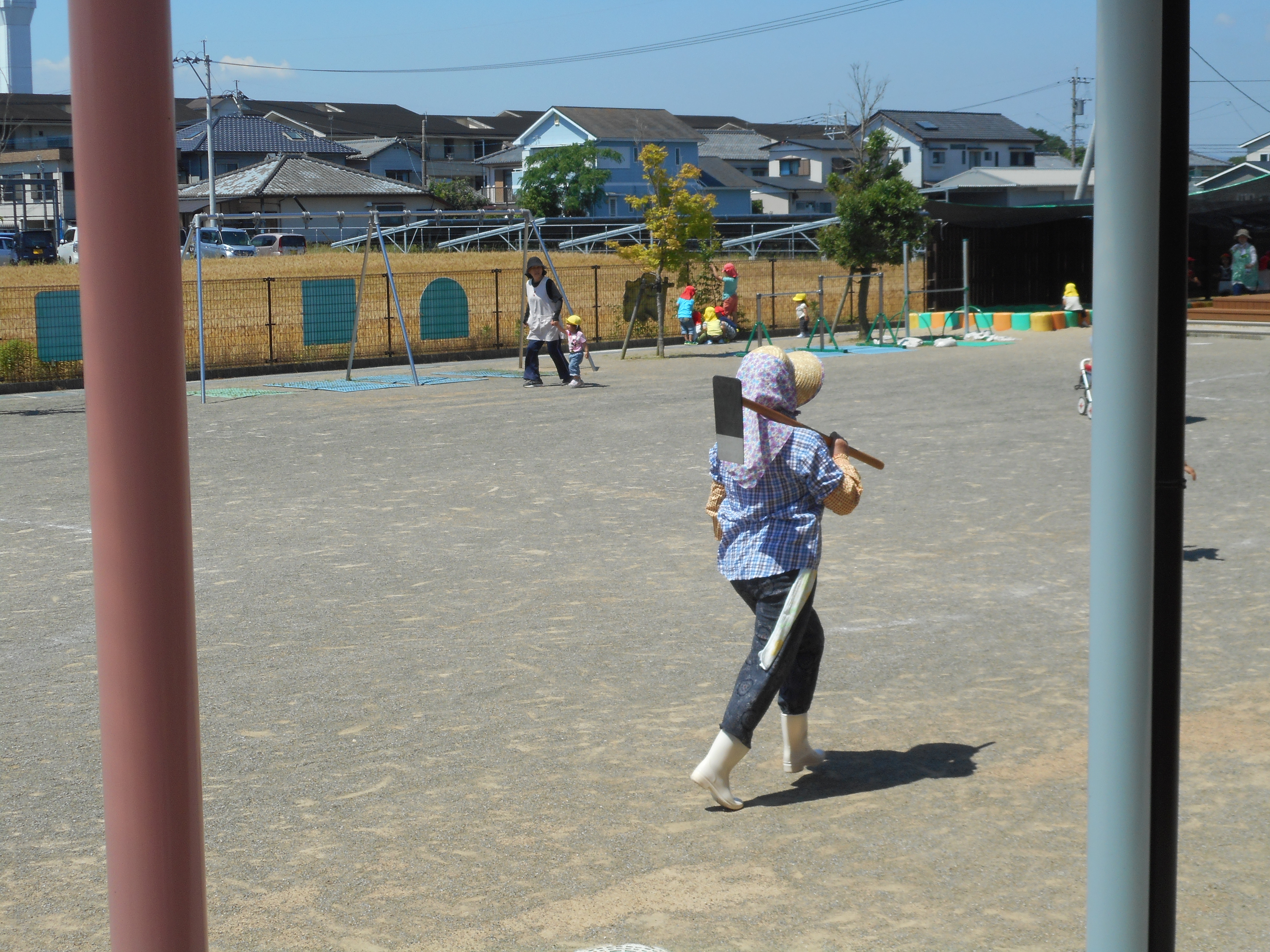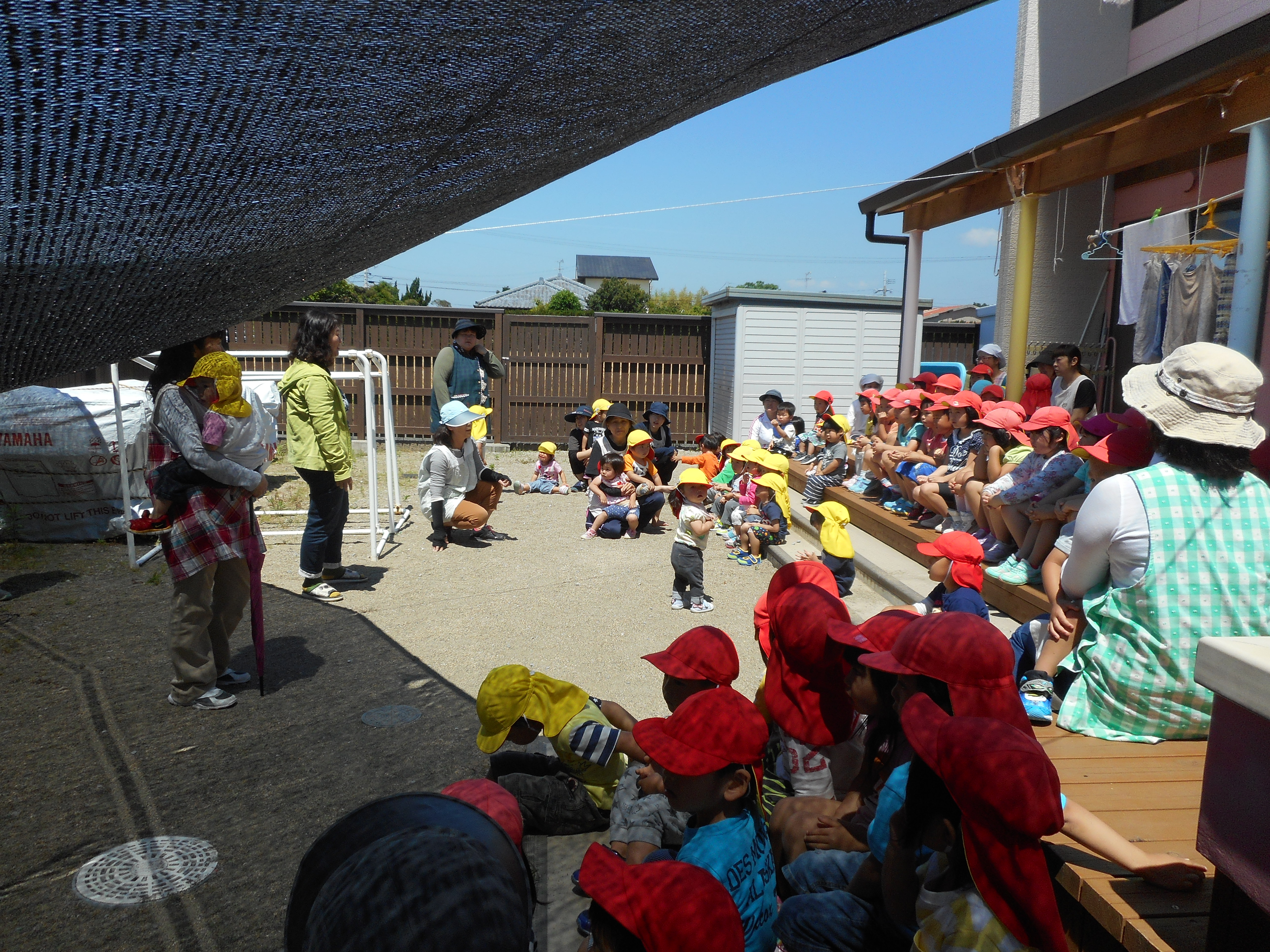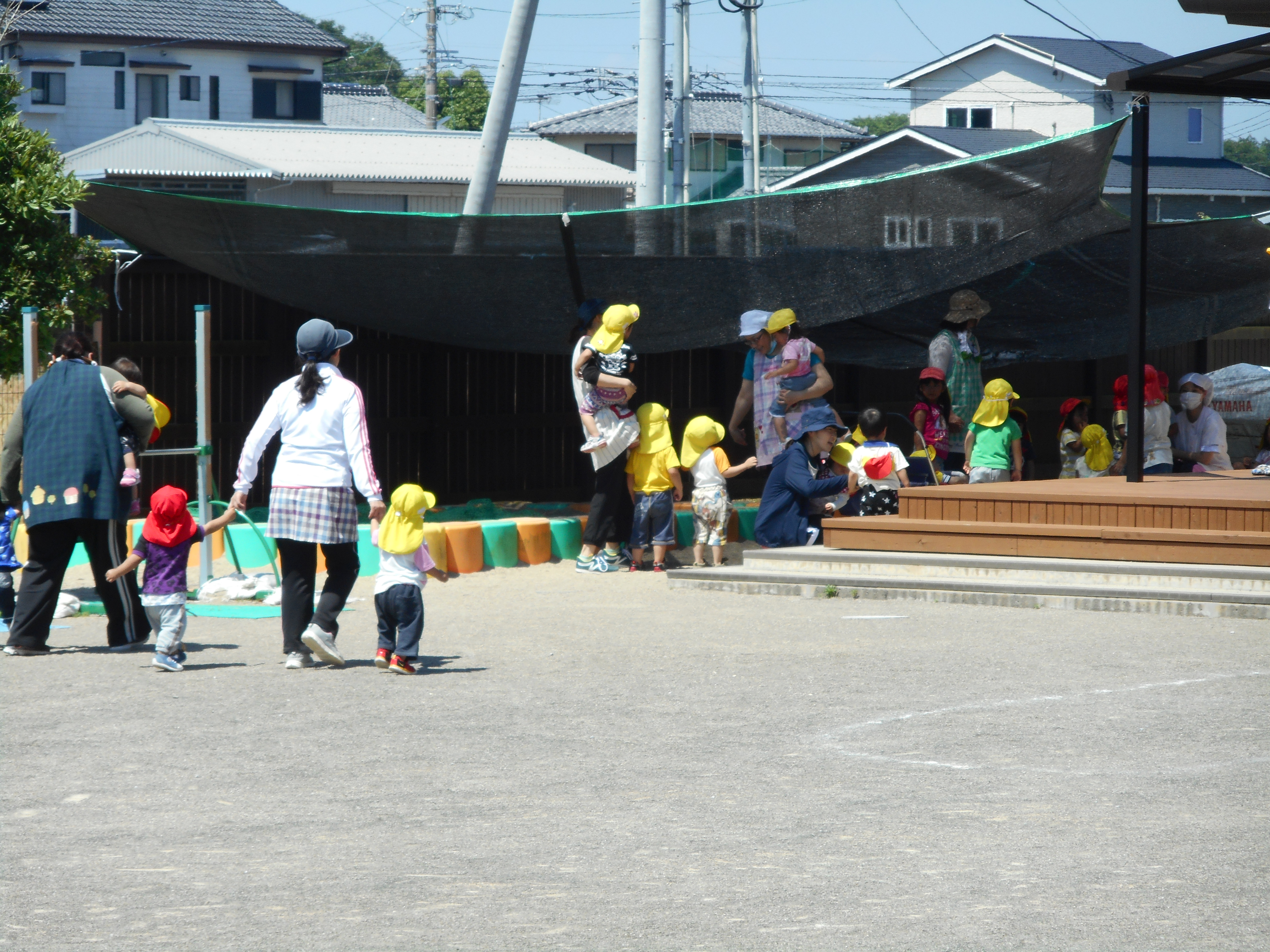 5月の避難訓練 5月18日(木) 園内に不審者が侵入したという設定で避難訓練を行いました。 すぐに保育士が対応し、侵入者と話をしている間に園庭で遊んでいる子どもたちを西側門まで全職員で誘導し待機しました。 対応した職員から、近所の方だったという説明を聞き、安心した子ども達でした。避難終了後、園長から「知らない人が園内に入ってこられたら怖がって逃げるのではなく、まずは、挨拶をするように」という話があり、今後の対応に生かしていきたいと思いました。