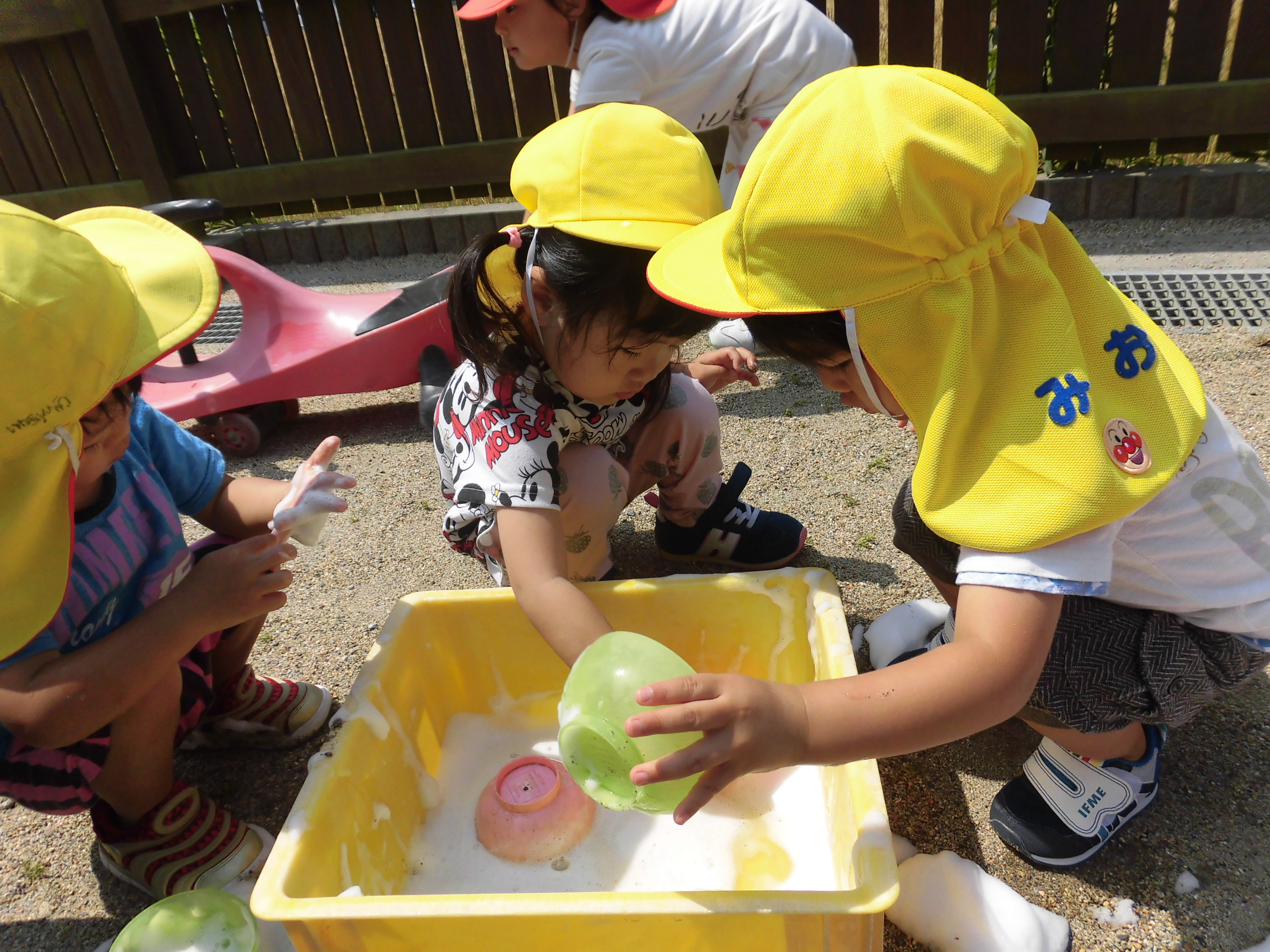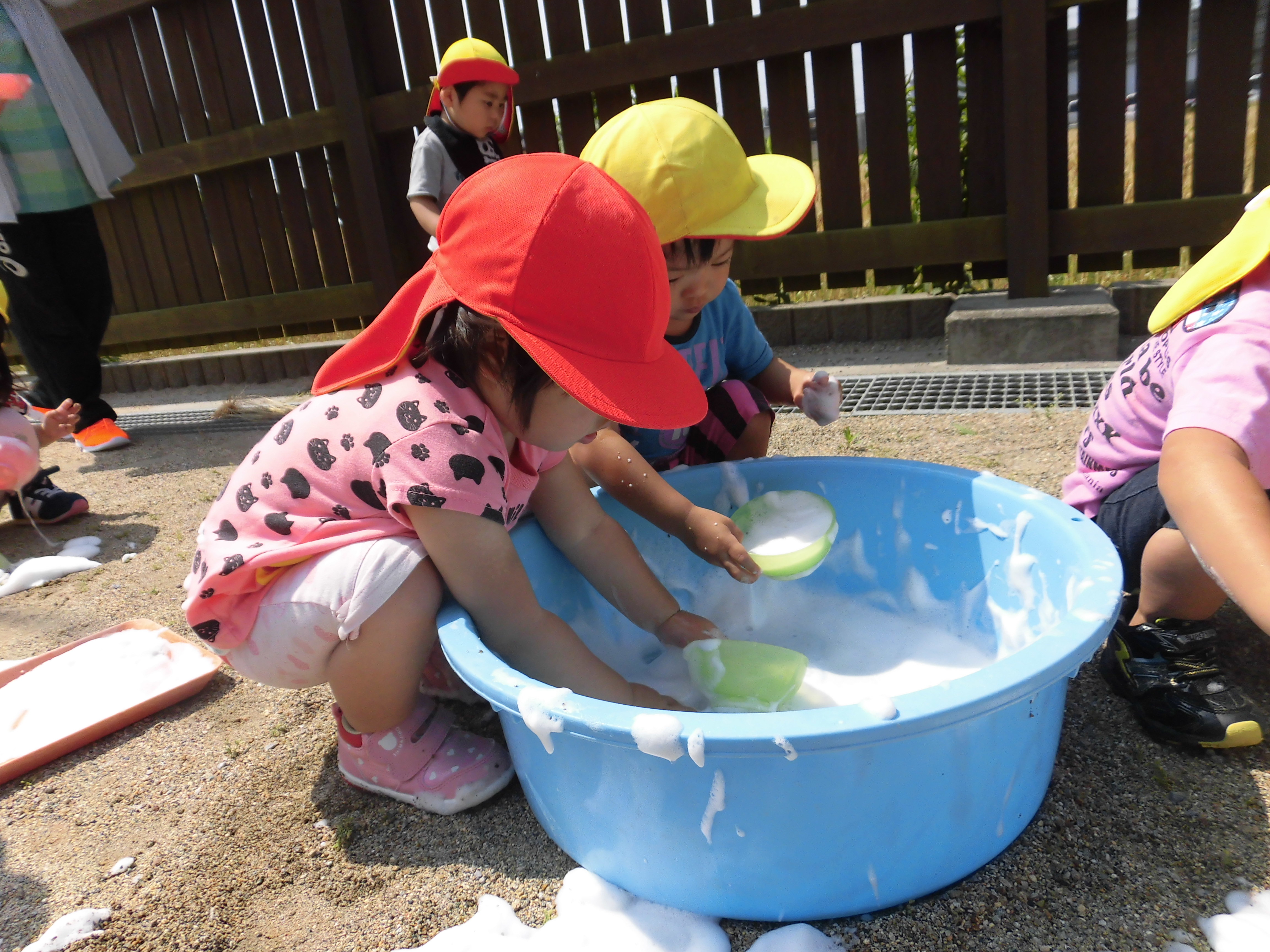 泡あそび 5月17日(木) ぶくぶく、ふわふわ泡遊び。 子どもたちは、両手で泡をすくったり、まぜまぜしたりと泡の感触を楽しみました。 おわんに泡をすくって、「ソフトクリームできたよ。」と持って来てくれました。