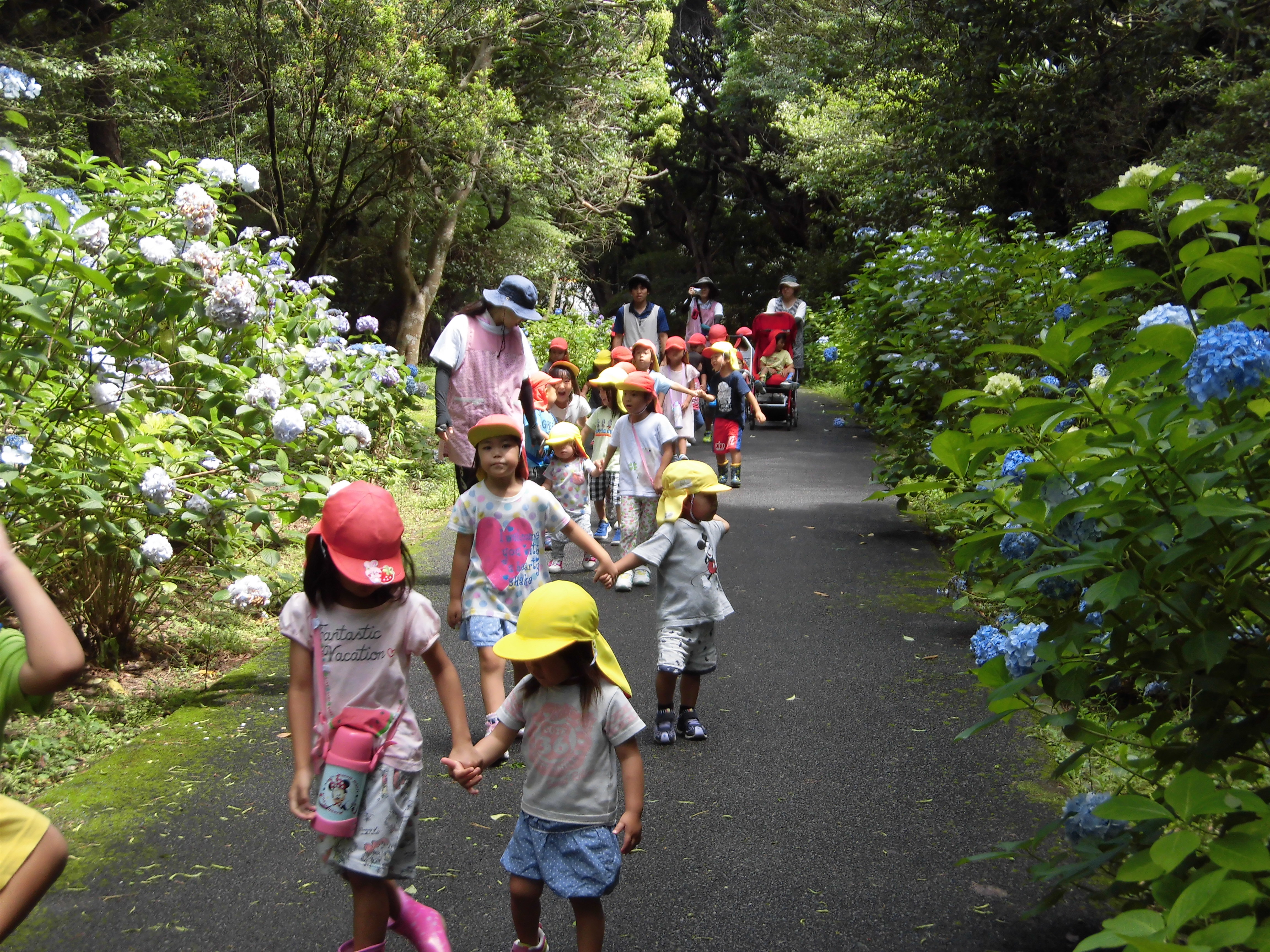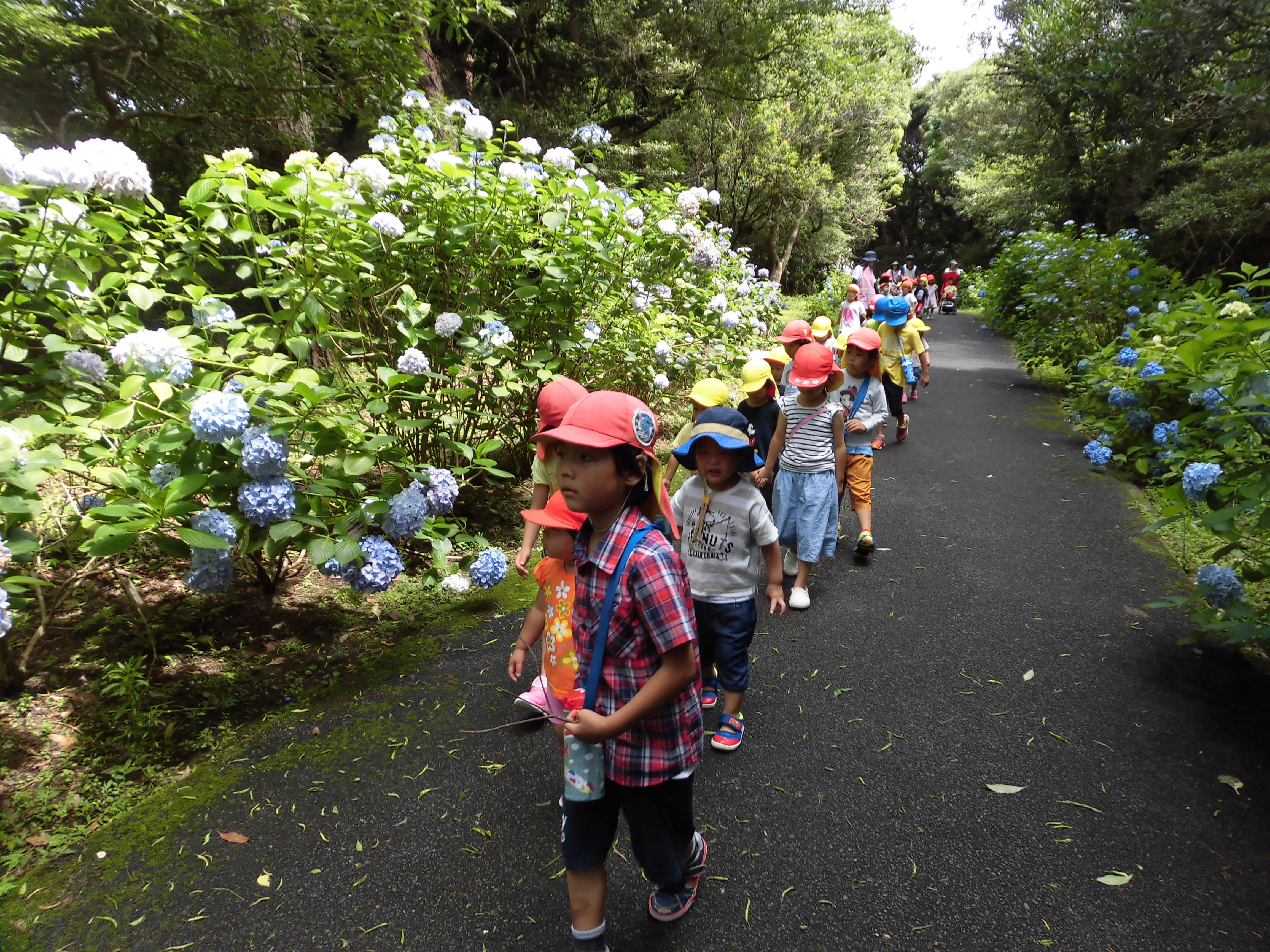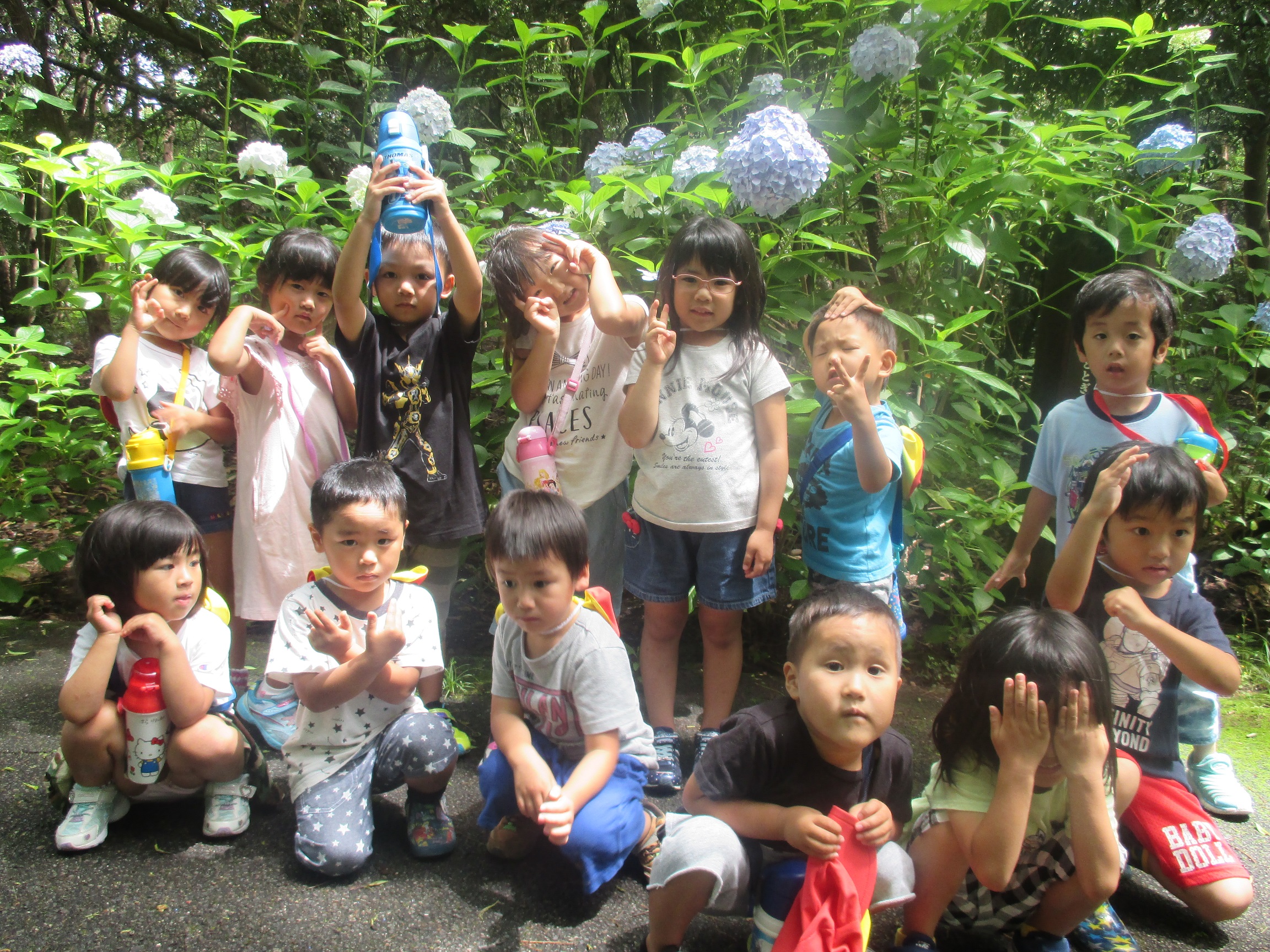 アジサイ 6月15日(金) 市民の森のアジサイロードにお散歩に行きました。 道の左右に子どもたちの顔と同じくらいの大きなアジサイの花が咲いていて、とてもきれいでした。 紫、青、白、少し赤みがかったアジサイの花。「きれいだね。」「大きいね。」「アジサイは紫だけじゃないね。」など子どもたちの会話が弾み、目を輝かせながら散歩を楽しみました。 園周辺を少し歩けば、四季折々の花が見られる恵まれた環境にある山崎保育園。幸せな気分になった1日でした。