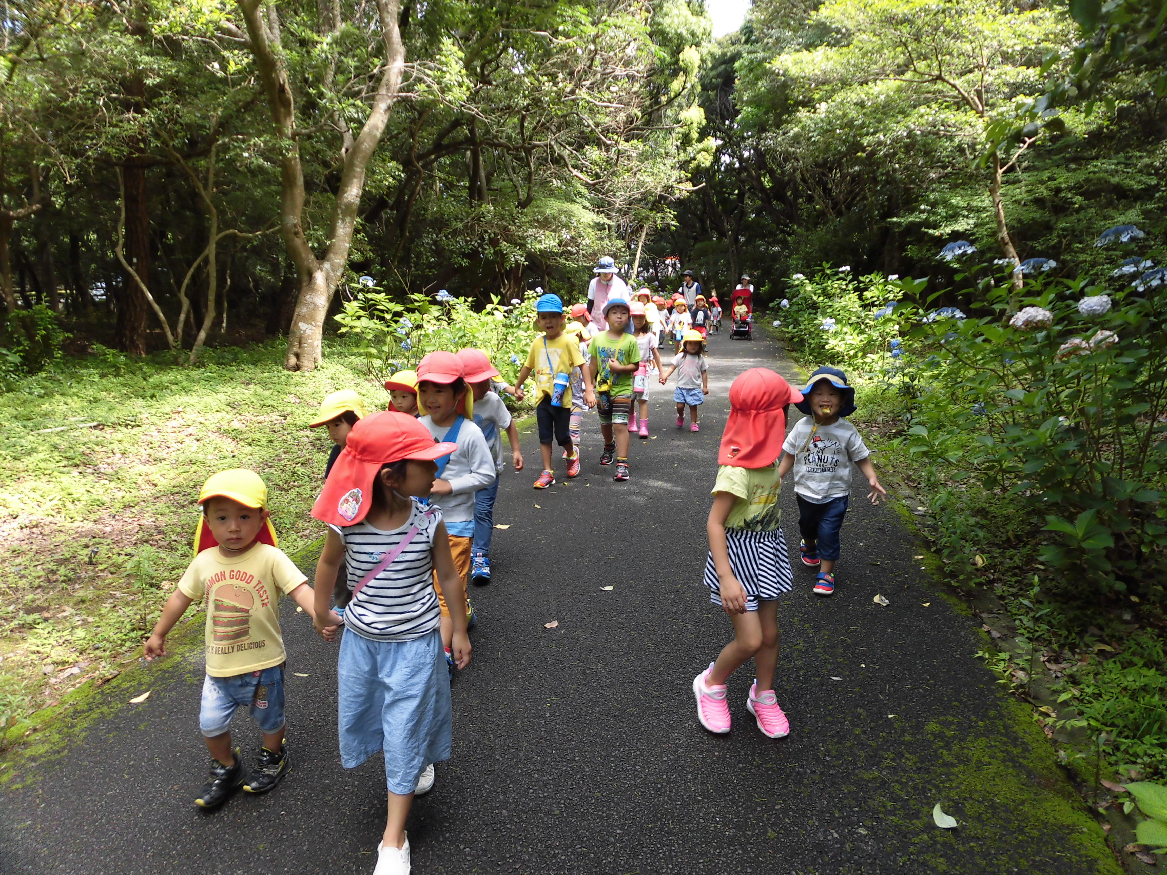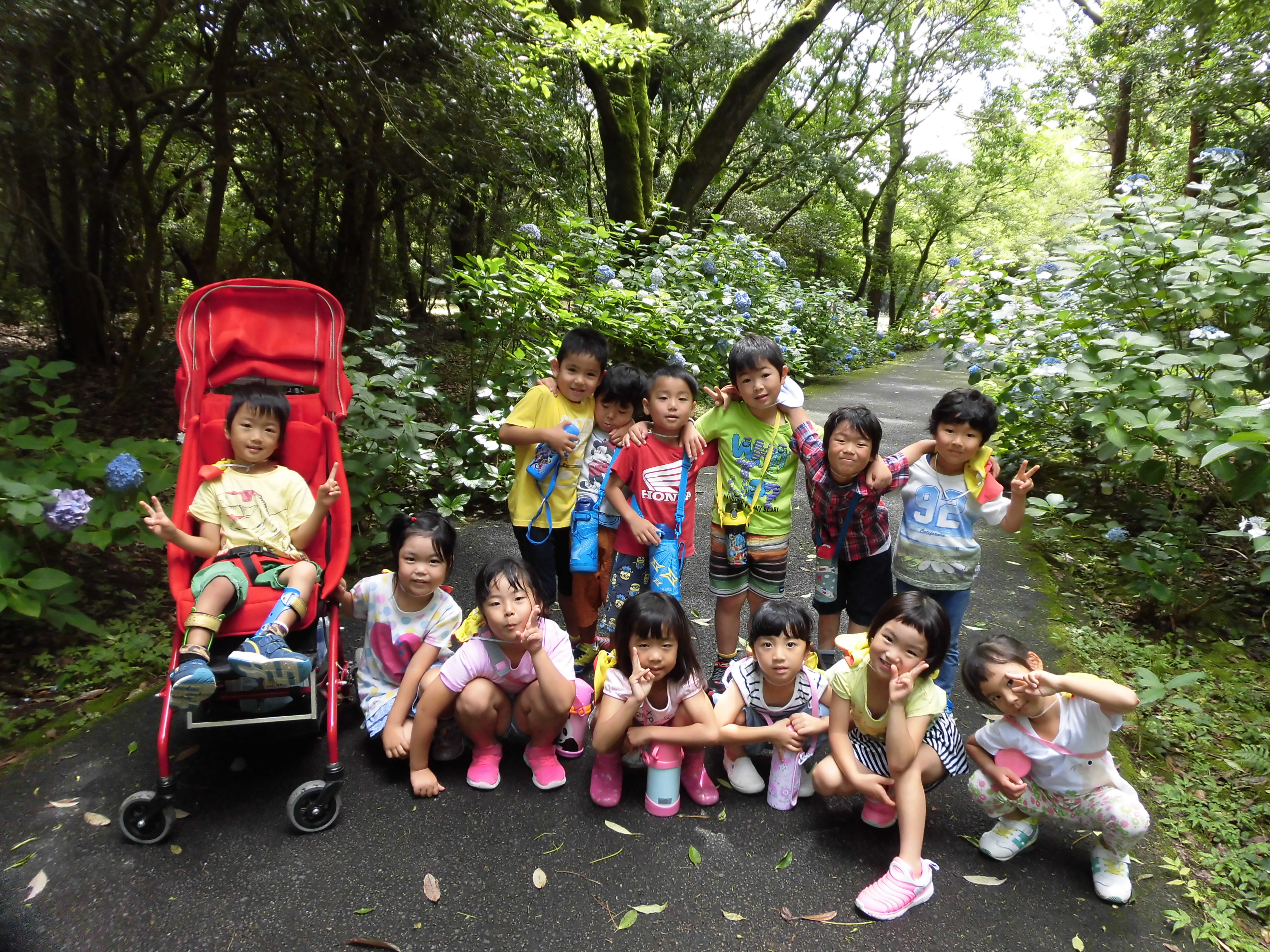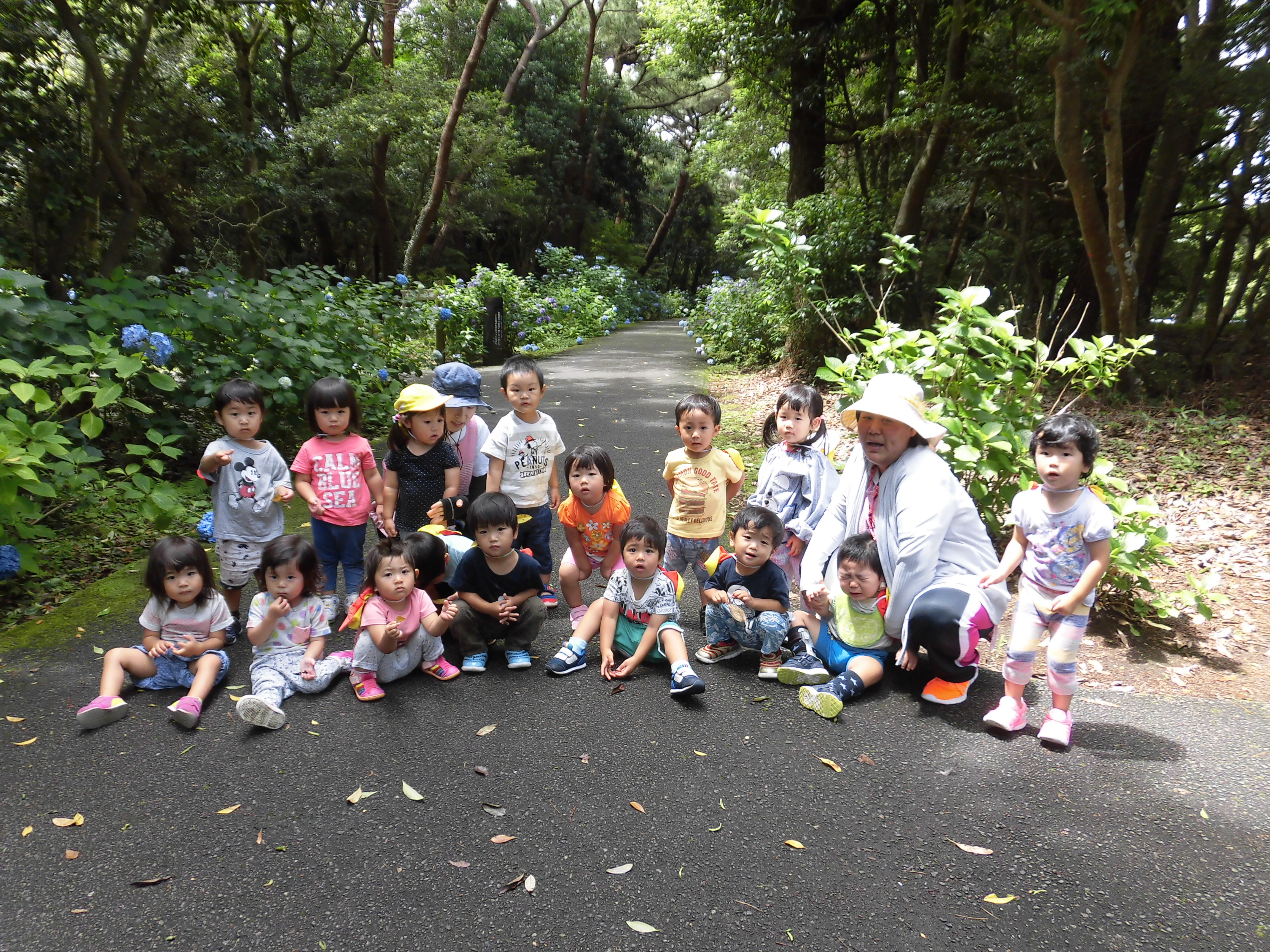 アジサイ 6月15日(金) 市民の森のアジサイロードにお散歩に行きました。 道の左右に子どもたちの顔と同じくらいの大きなアジサイの花が咲いていて、とてもきれいでした。 紫、青、白、少し赤みがかったアジサイの花。「きれいだね。」「大きいね。」「アジサイは紫だけじゃないね。」など子どもたちの会話が弾み、目を輝かせながら散歩を楽しみました。 園周辺を少し歩けば、四季折々の花が見られる恵まれた環境にある山崎保育園。幸せな気分になった1日でした。