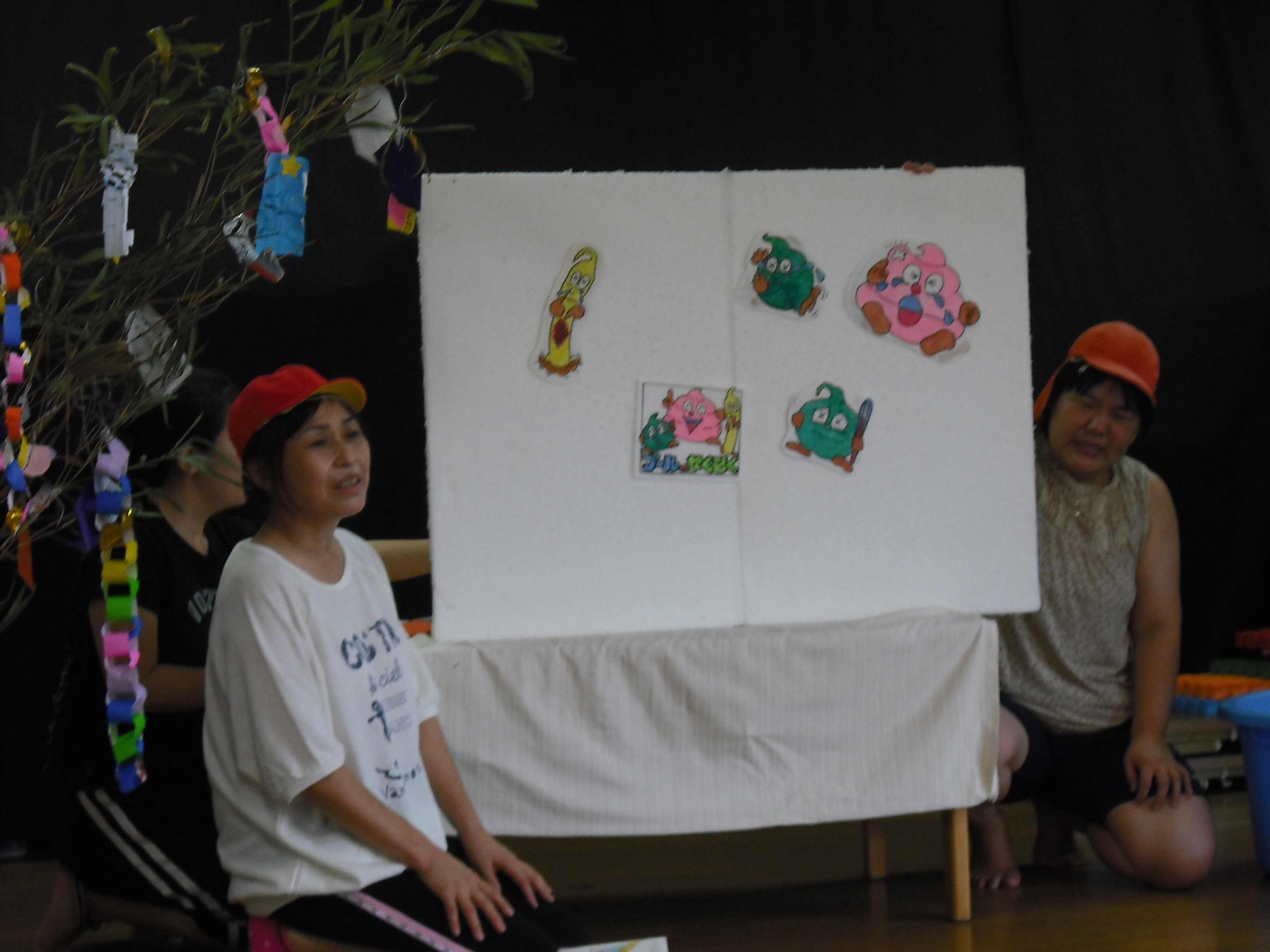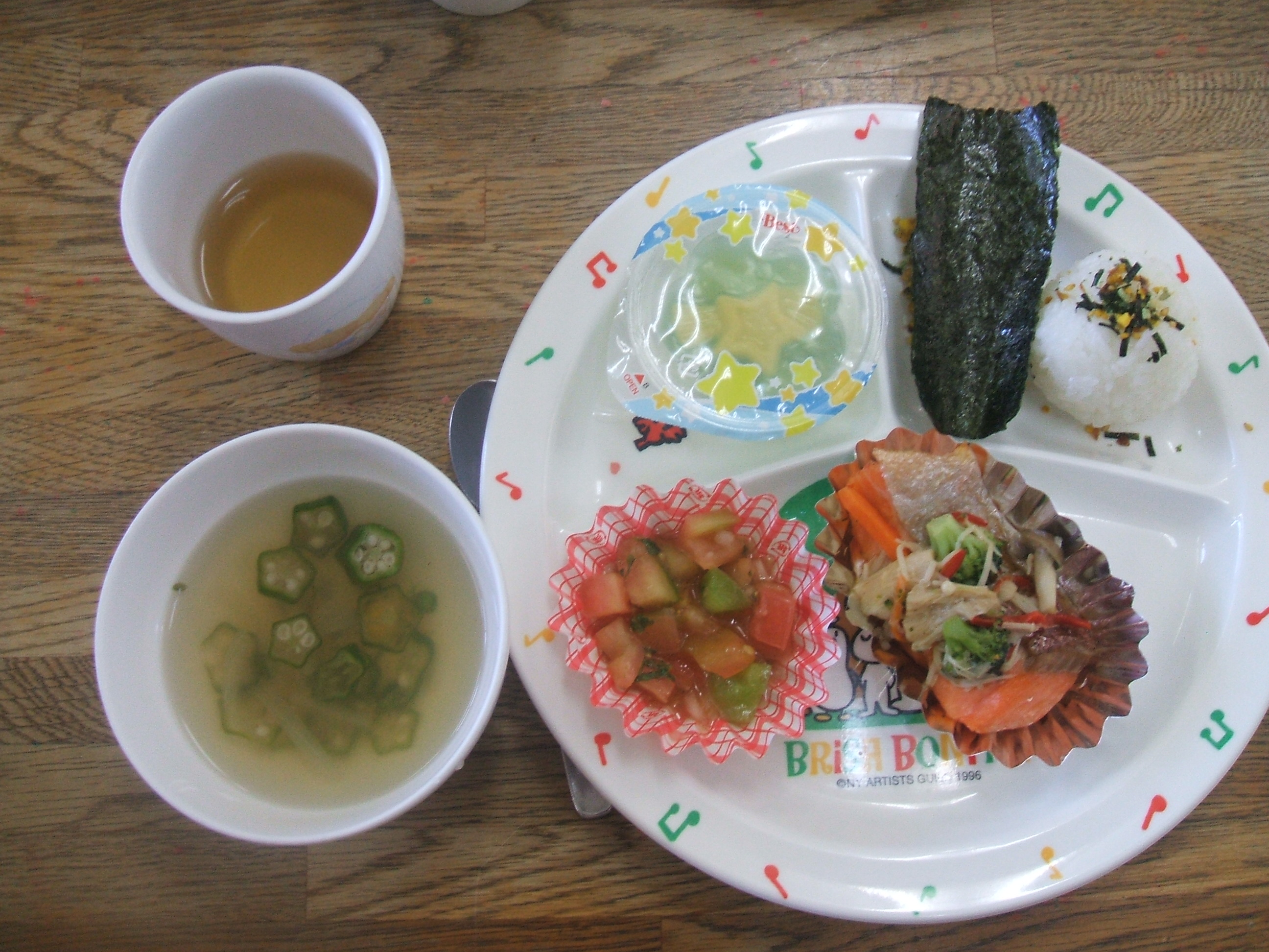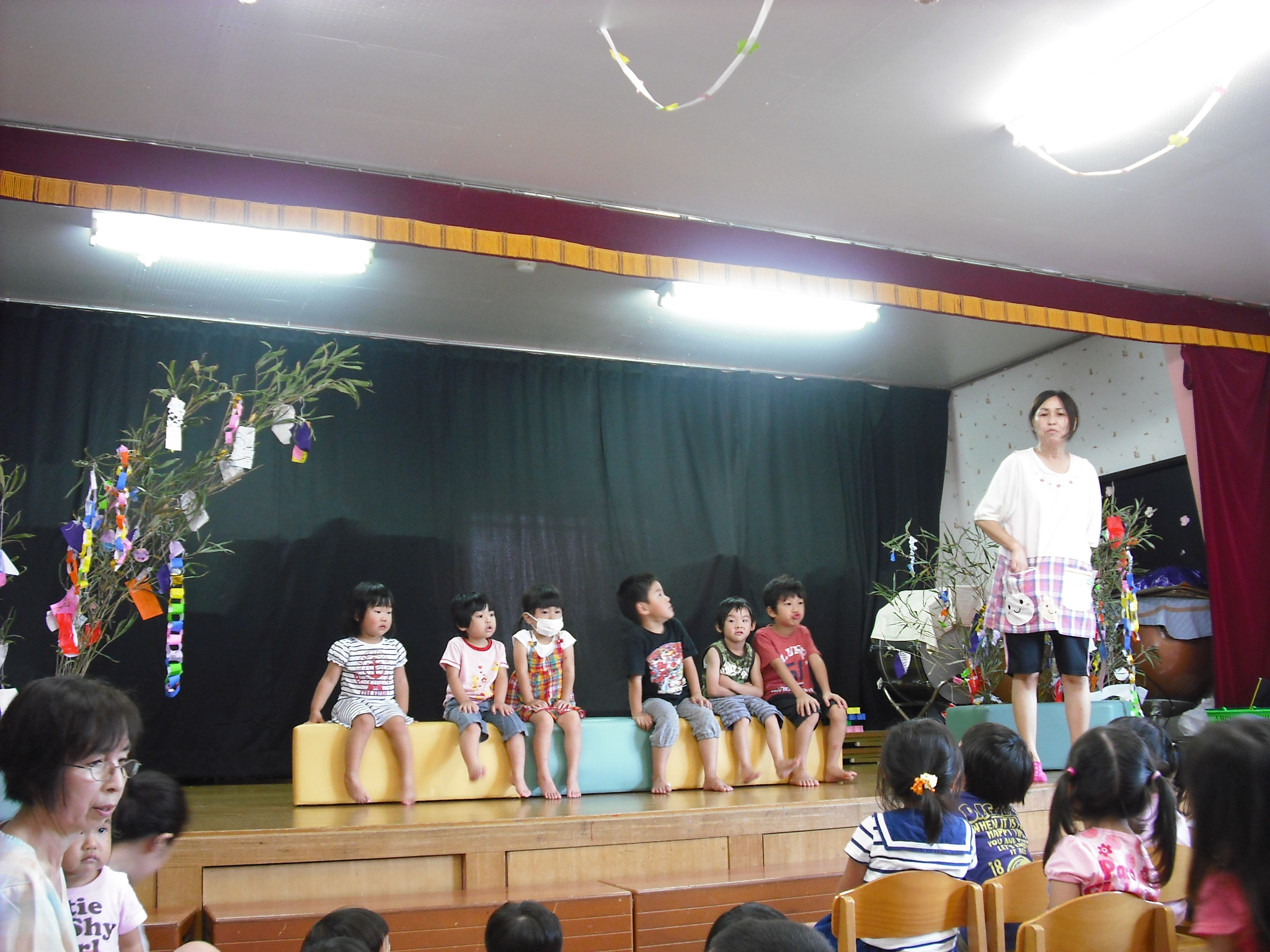 七夕まつり&誕生会 7月5日(金) 七夕まつりと7月の誕生会を行いました。 七夕のペープサートや先生たちの寸劇を楽しんだ後は、『ふりかけご飯・魚のホイル焼き・トマトサラダ・星の子スープ・七夕ゼリー』のご馳走を美味しくいただきました。