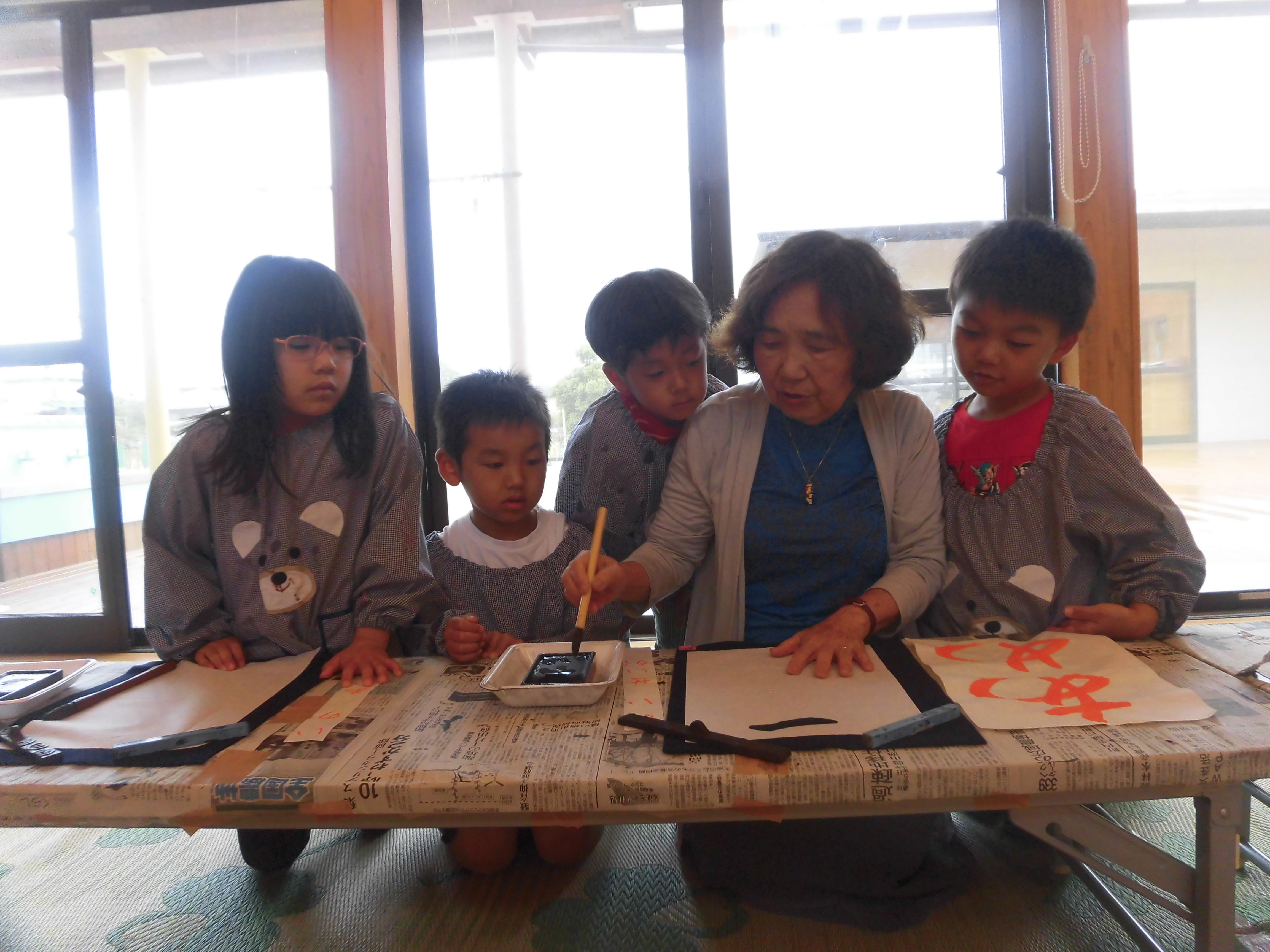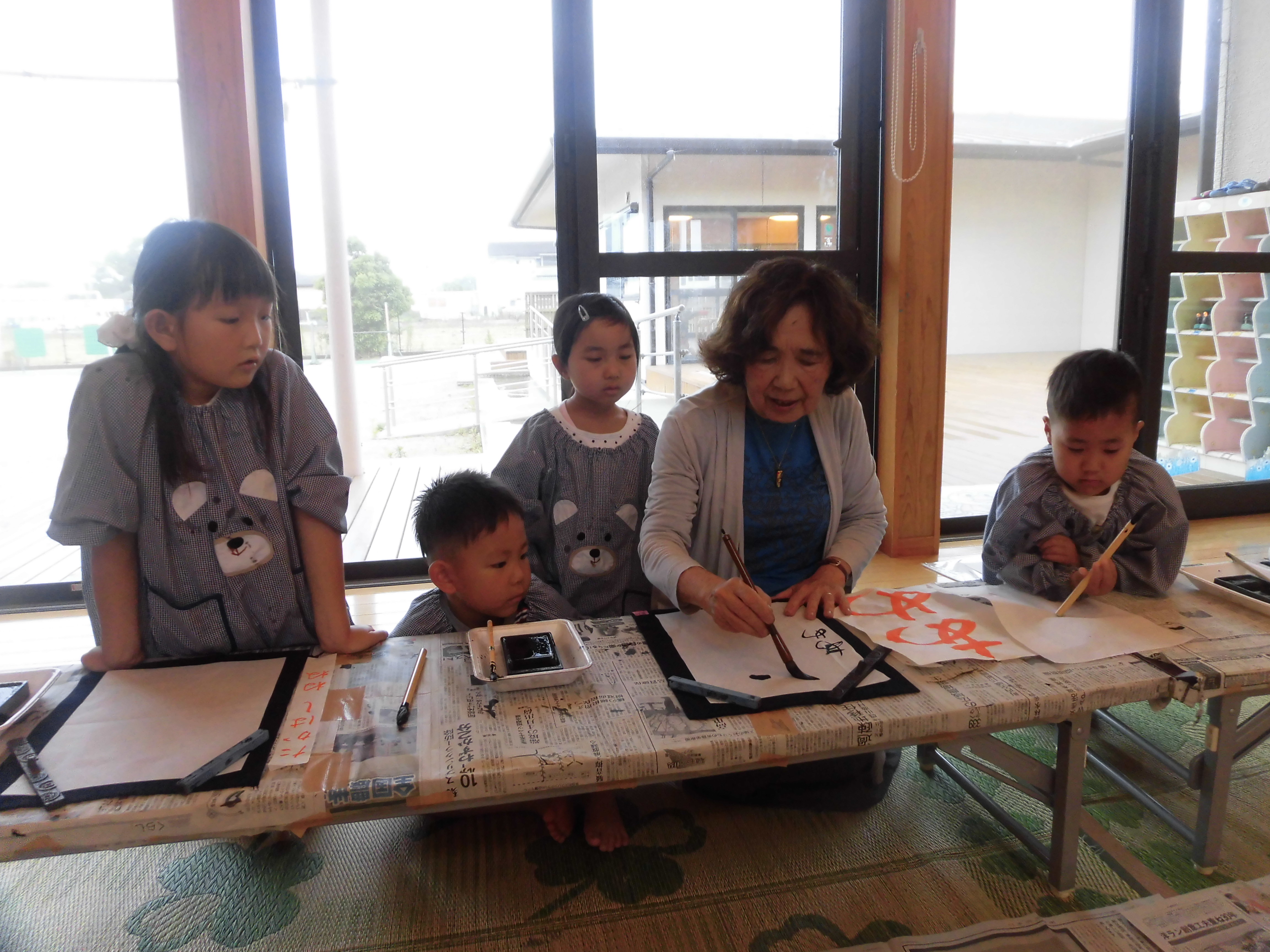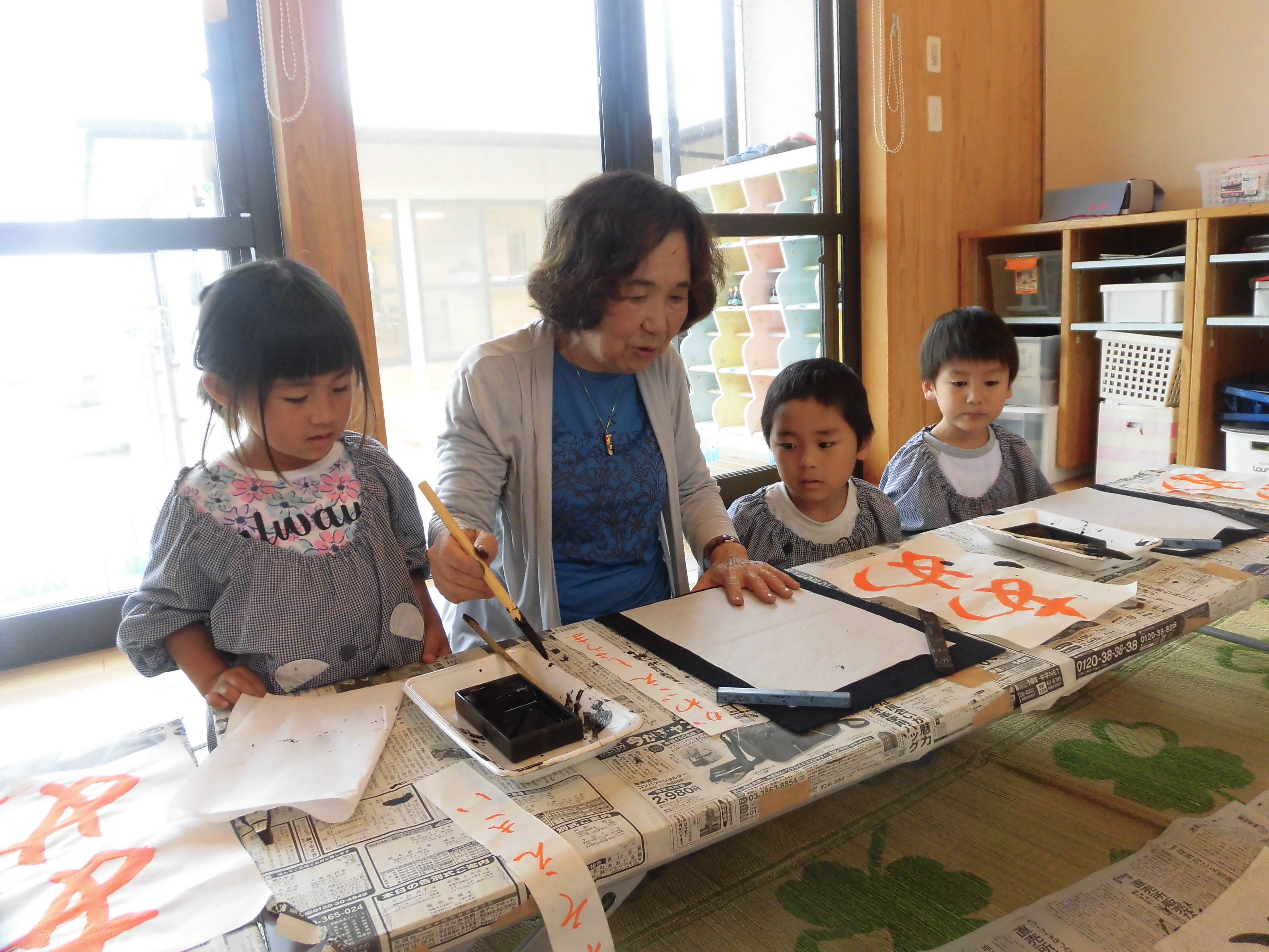 文字遊び 5月28日(火) 年長さん達が毎月楽しみにしている文字遊びの時間です。 今回は、「あめ」という文字を教えて頂きました。講師の見本を見ながら、丁寧に力強く書くことができました。 優しい講師に教えていただき、子どもたちも集中して文字遊びに参加しています。