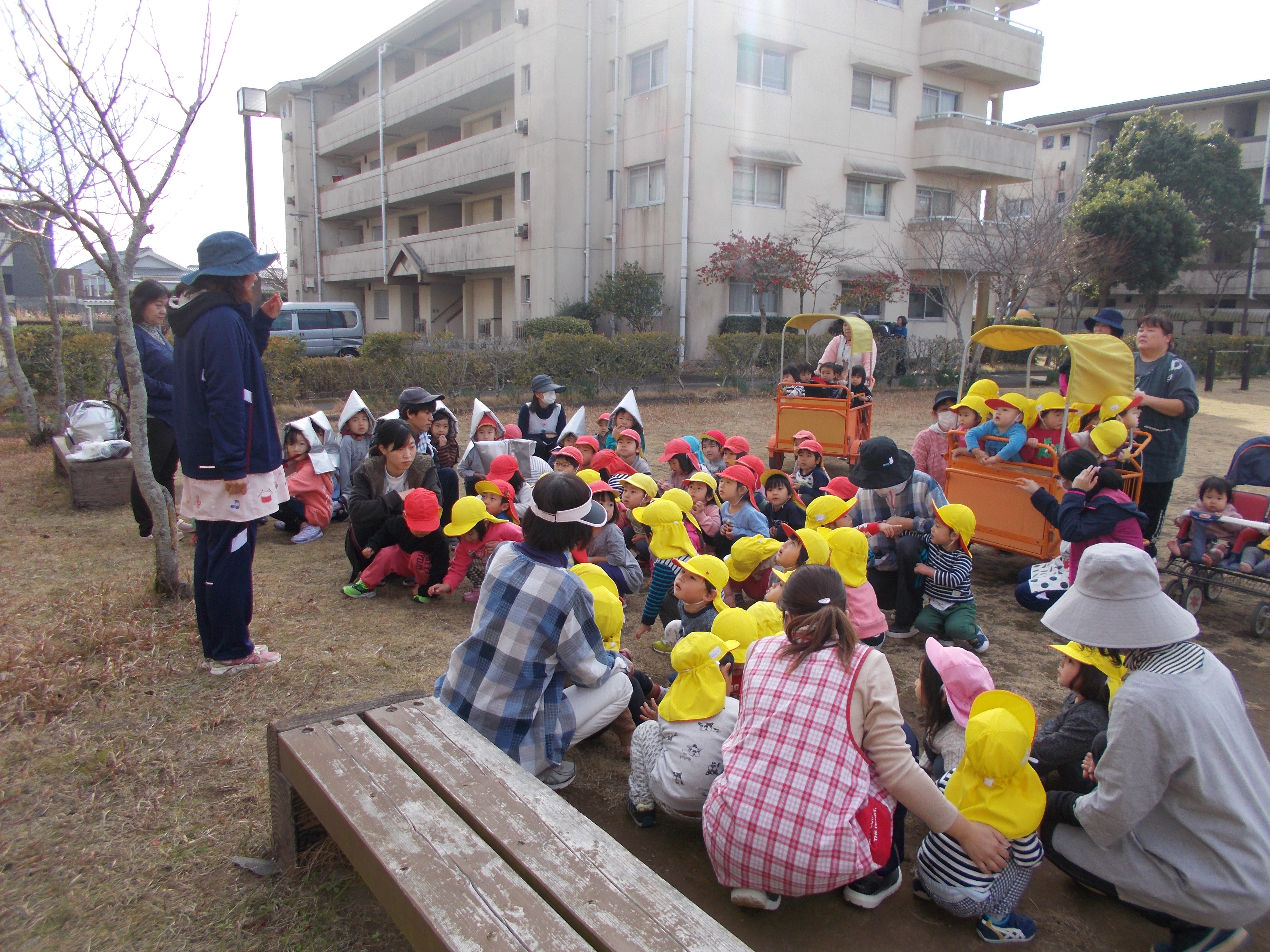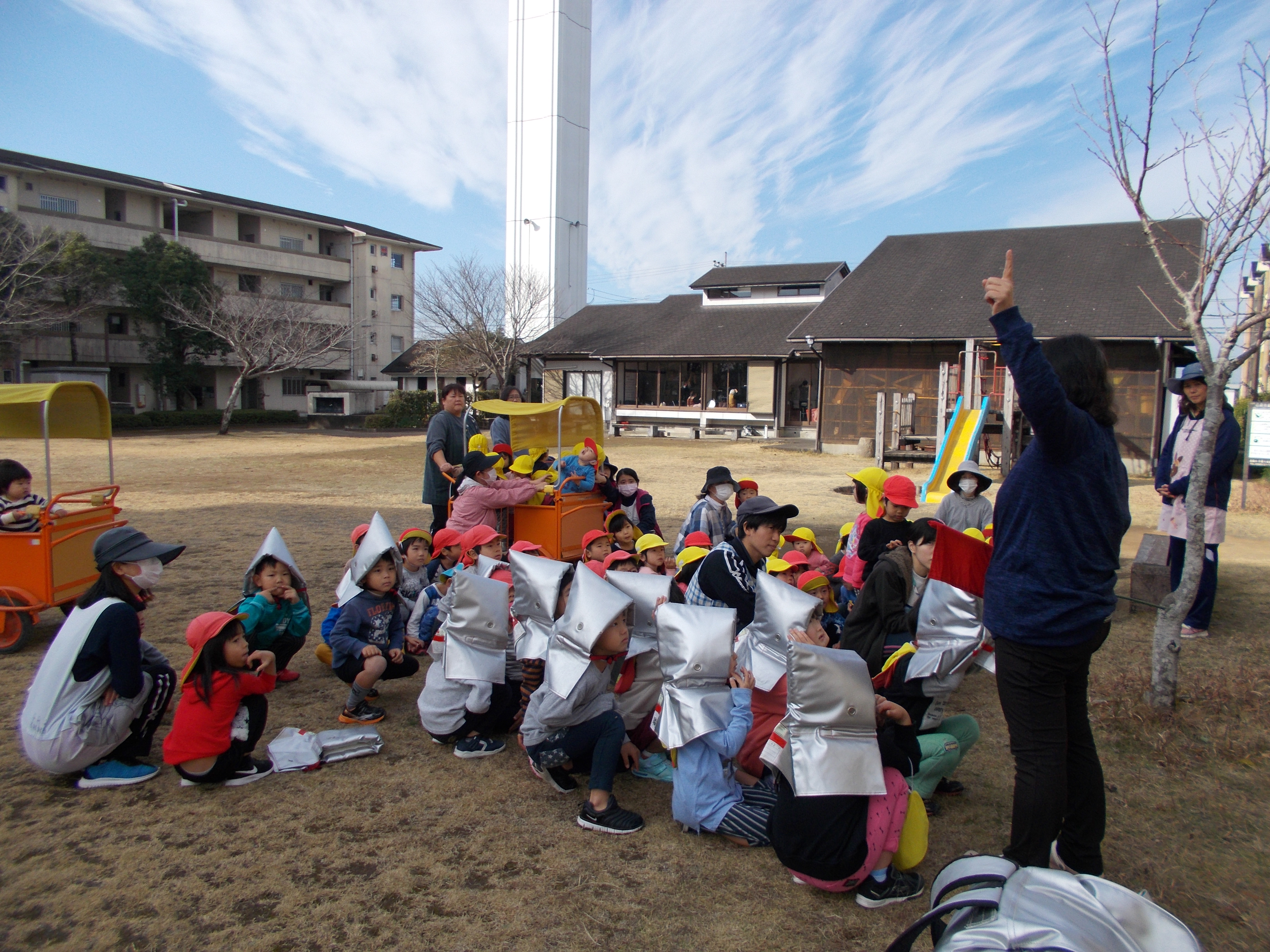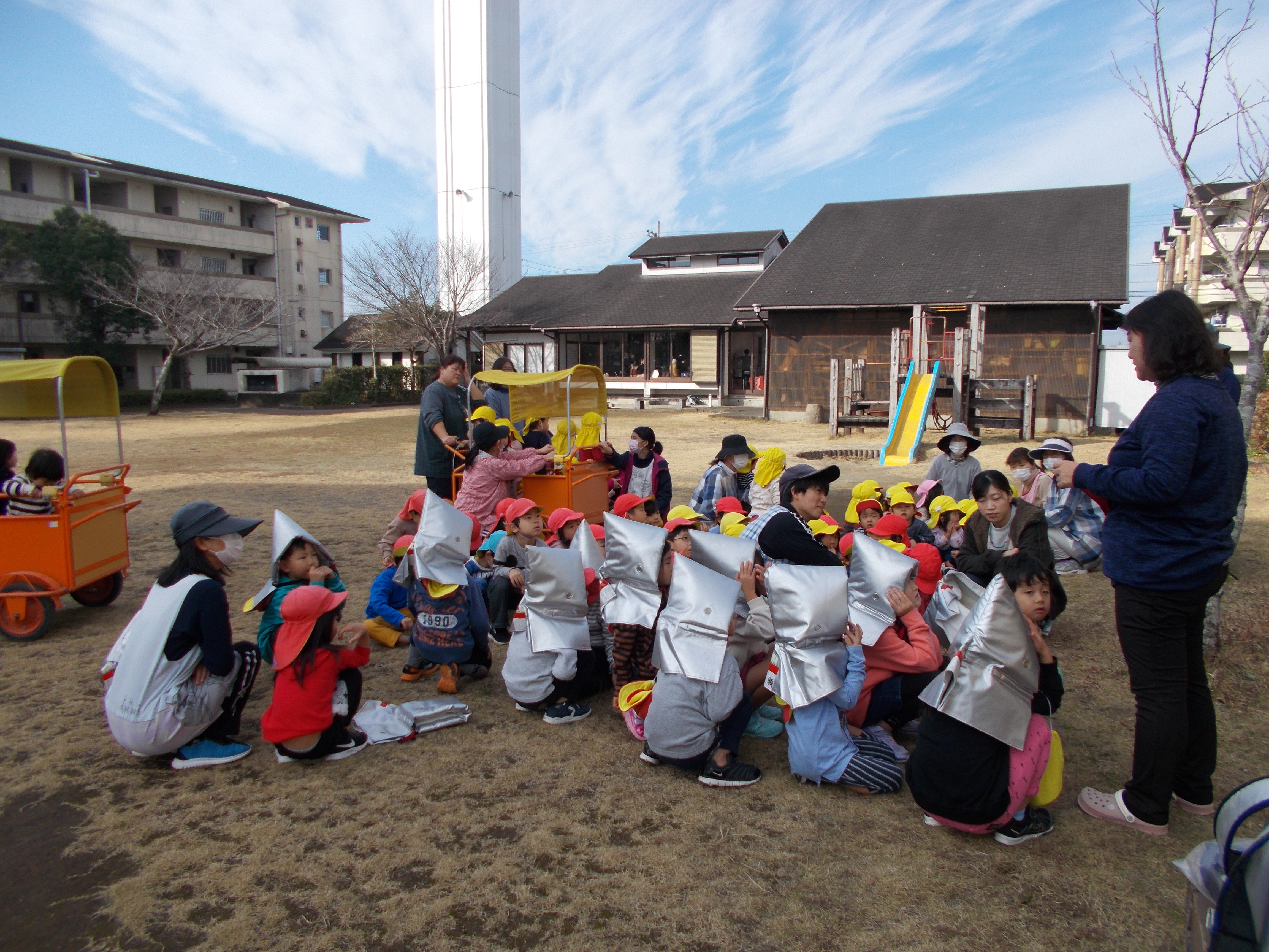 全員、保育士の声かけで防災頭巾を被り、早歩きでスムーズに避難することができました。