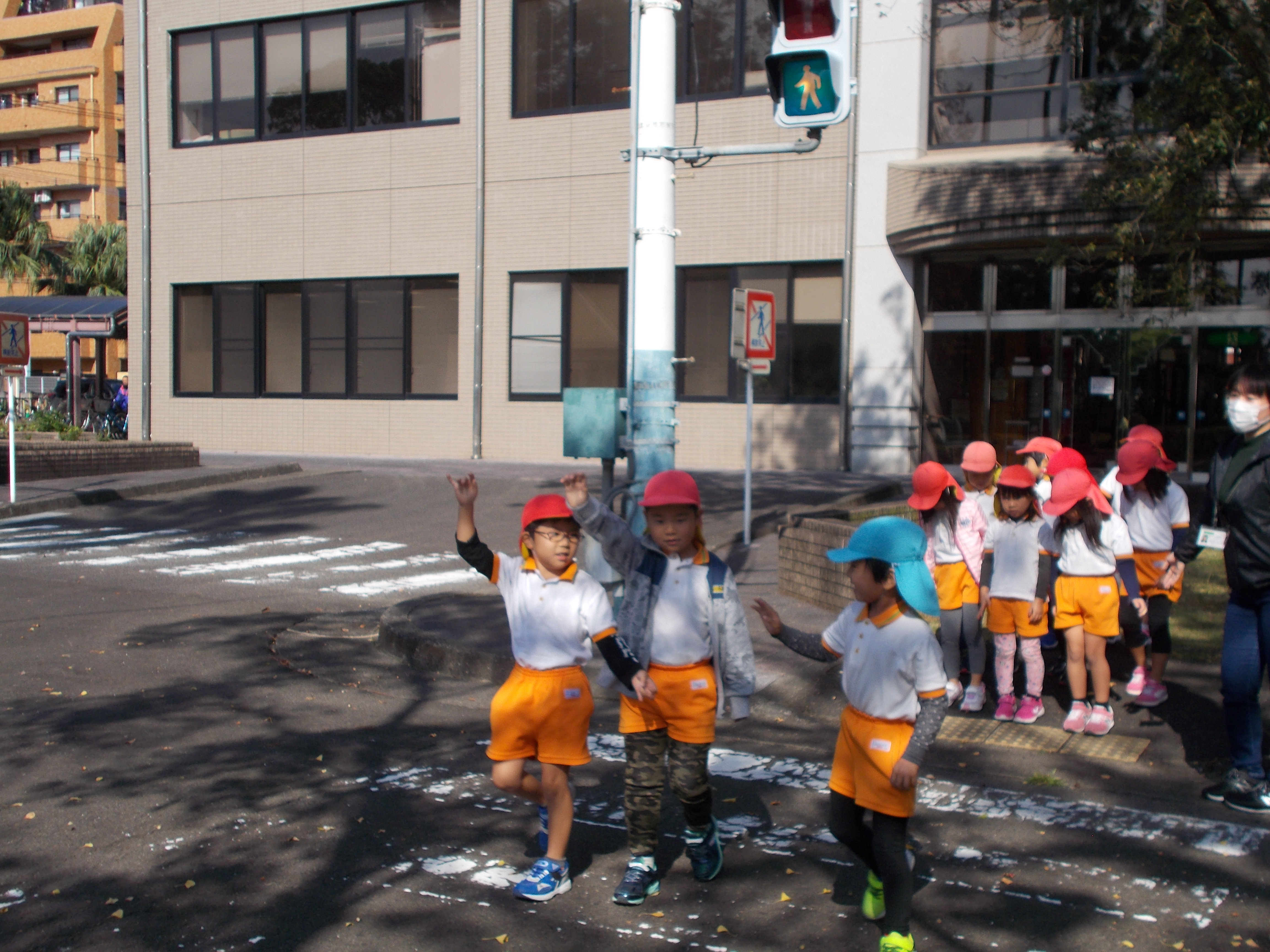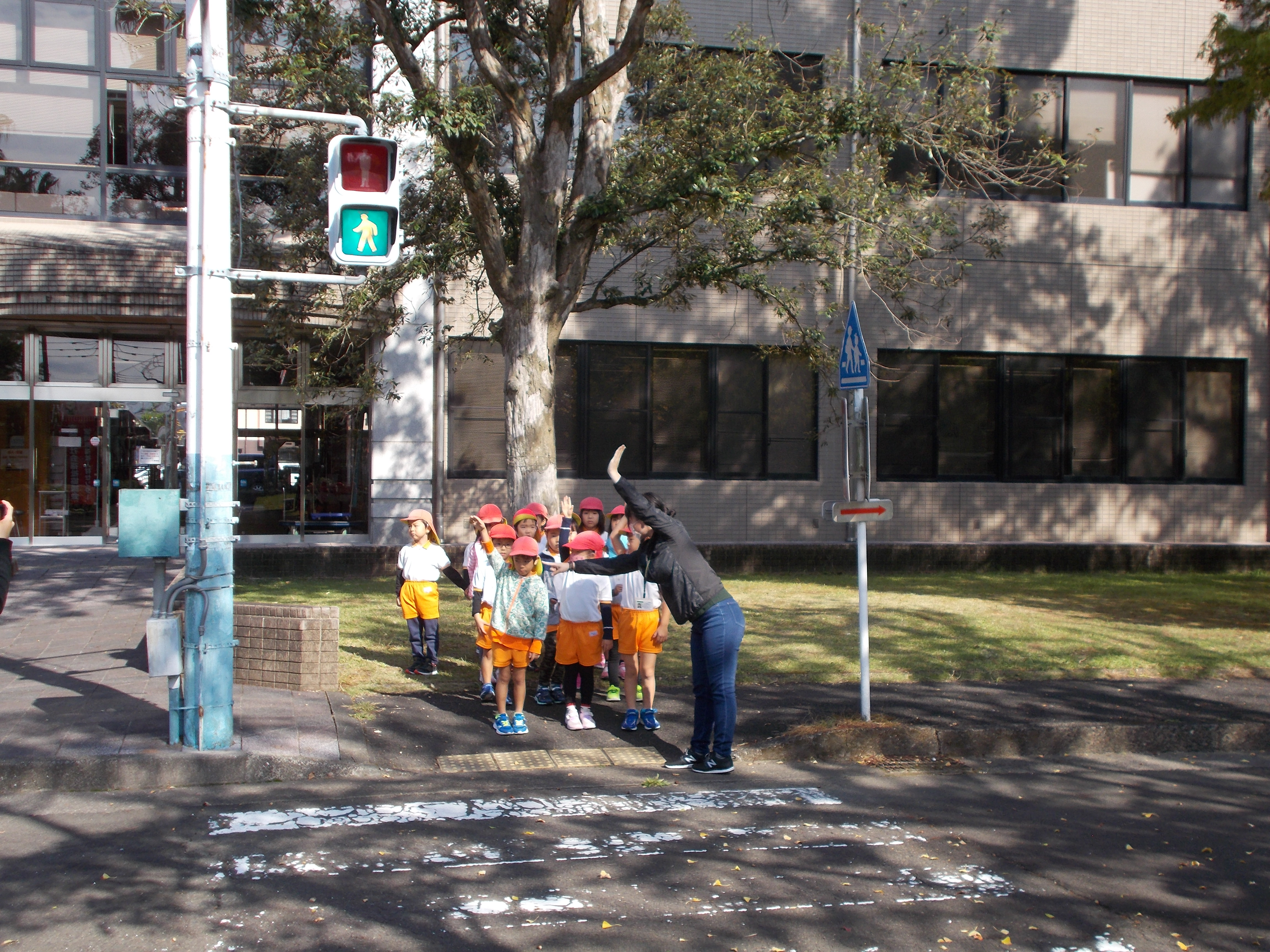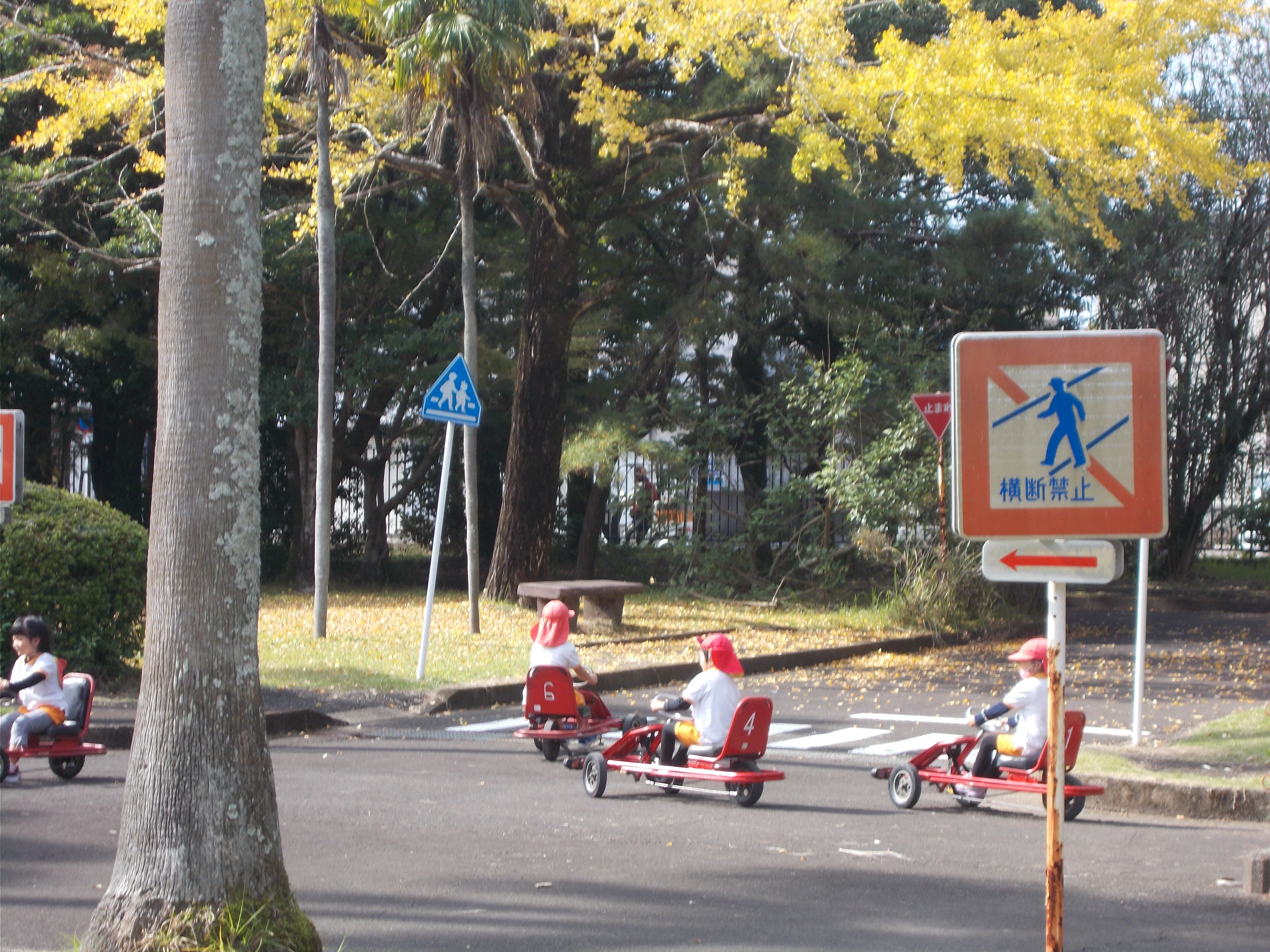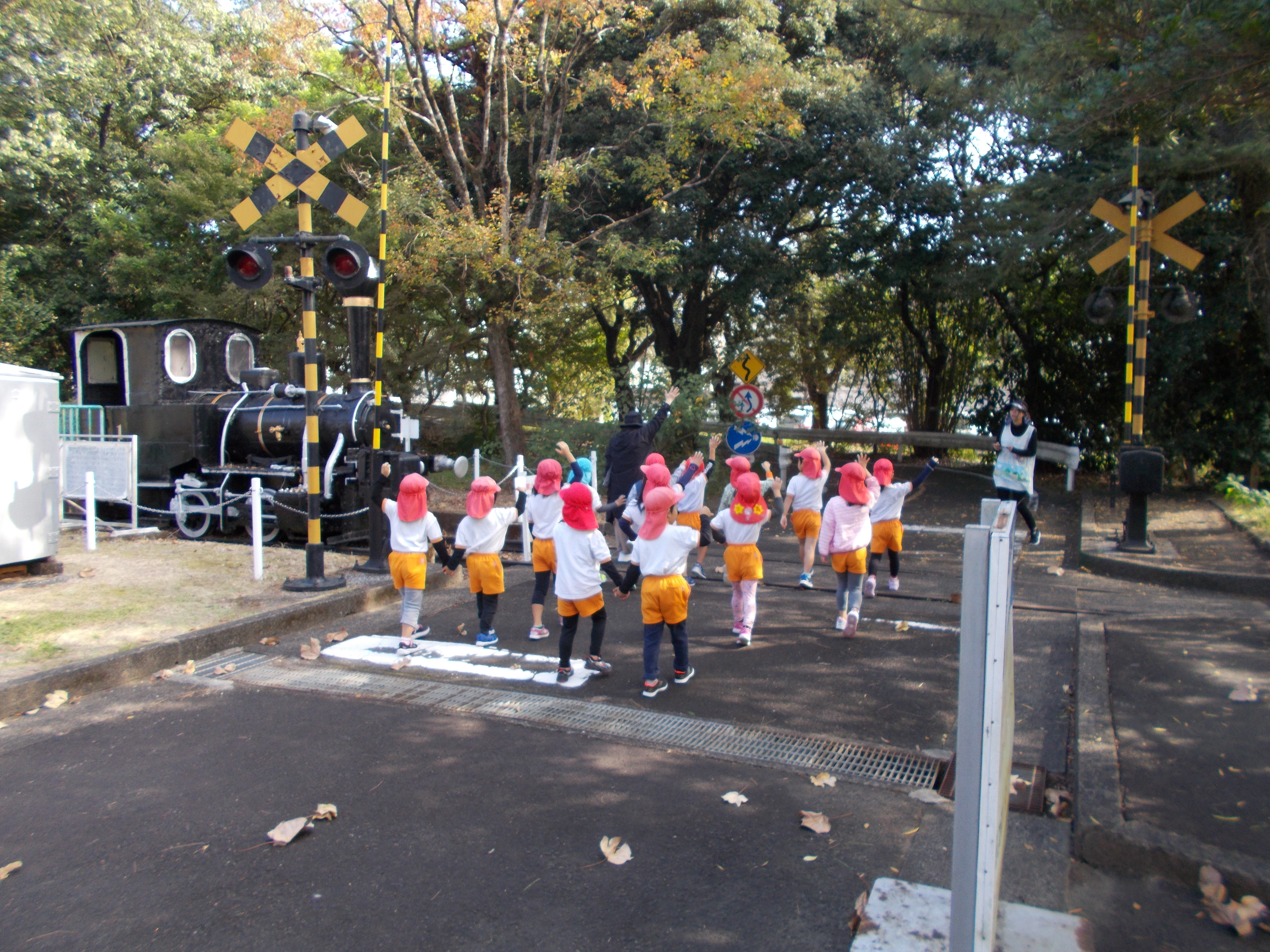 交通遊園(年長児) 11月11日(水) とっても気持ちのいい天気♪ 年長児は交通公園に行き横断歩道や踏切の渡り方などを教えて頂きました。真剣に話を聞き取り組んでいましたよ。 ゴーカートも交通ルールを守って走らせています♪