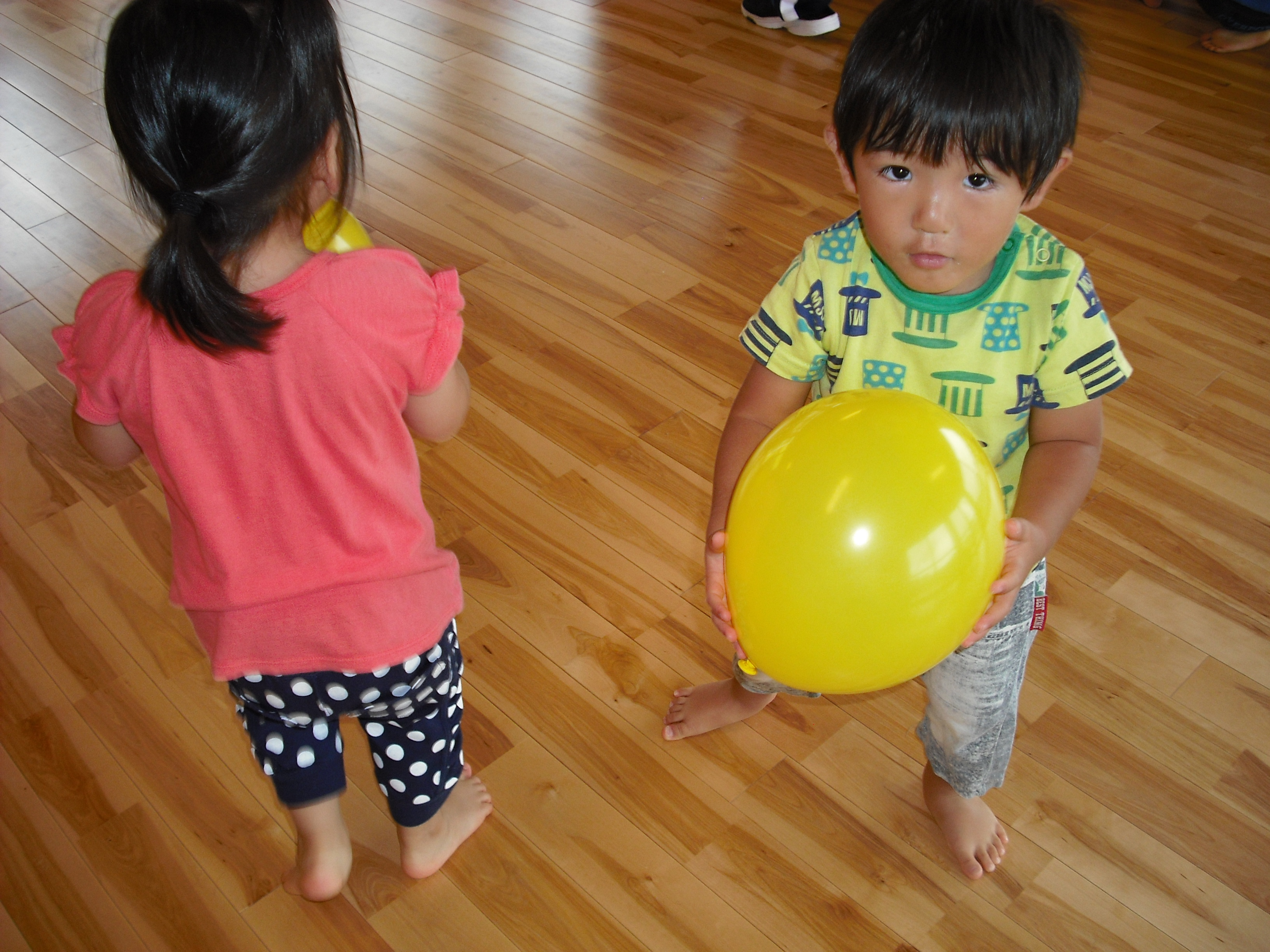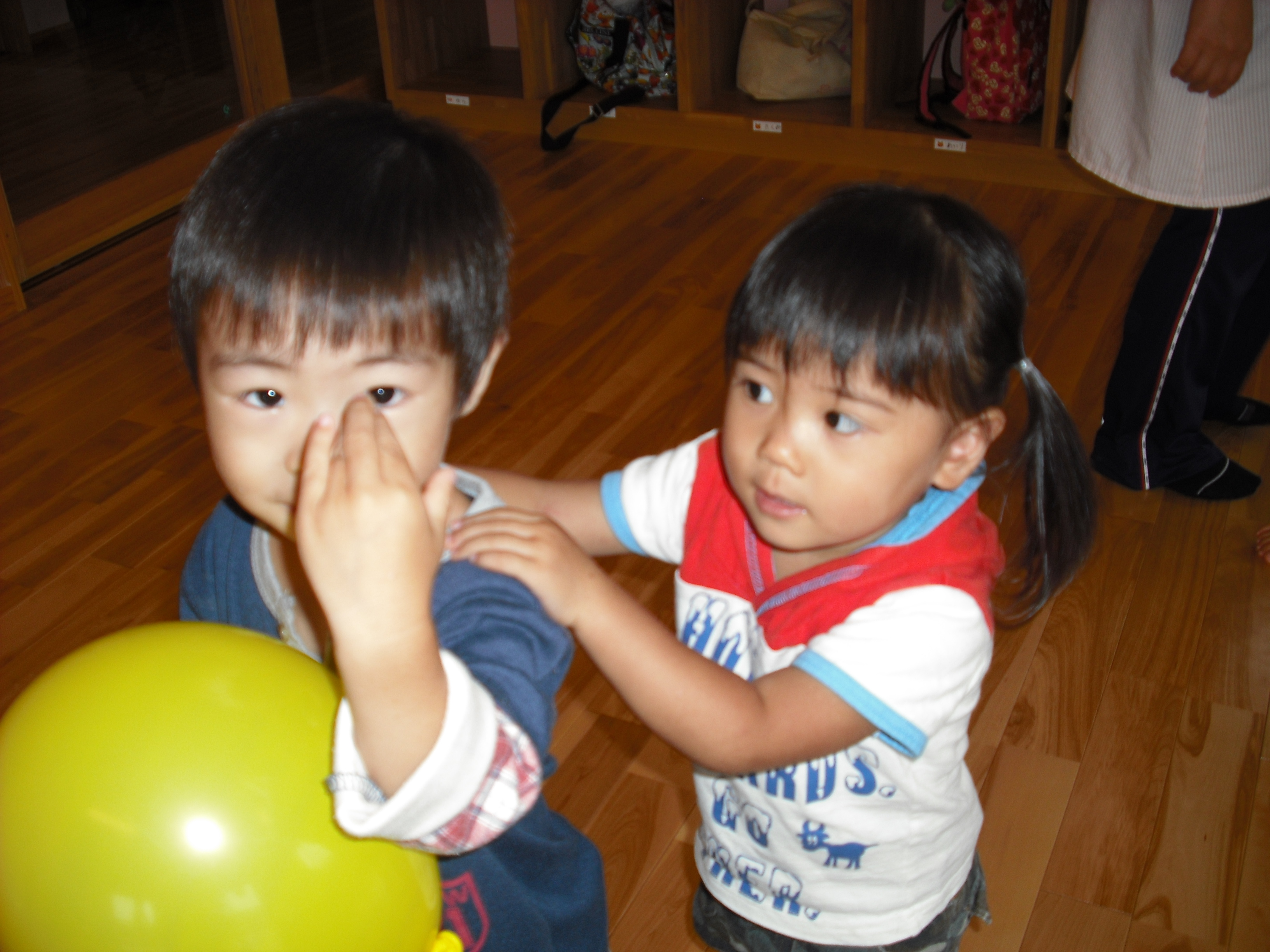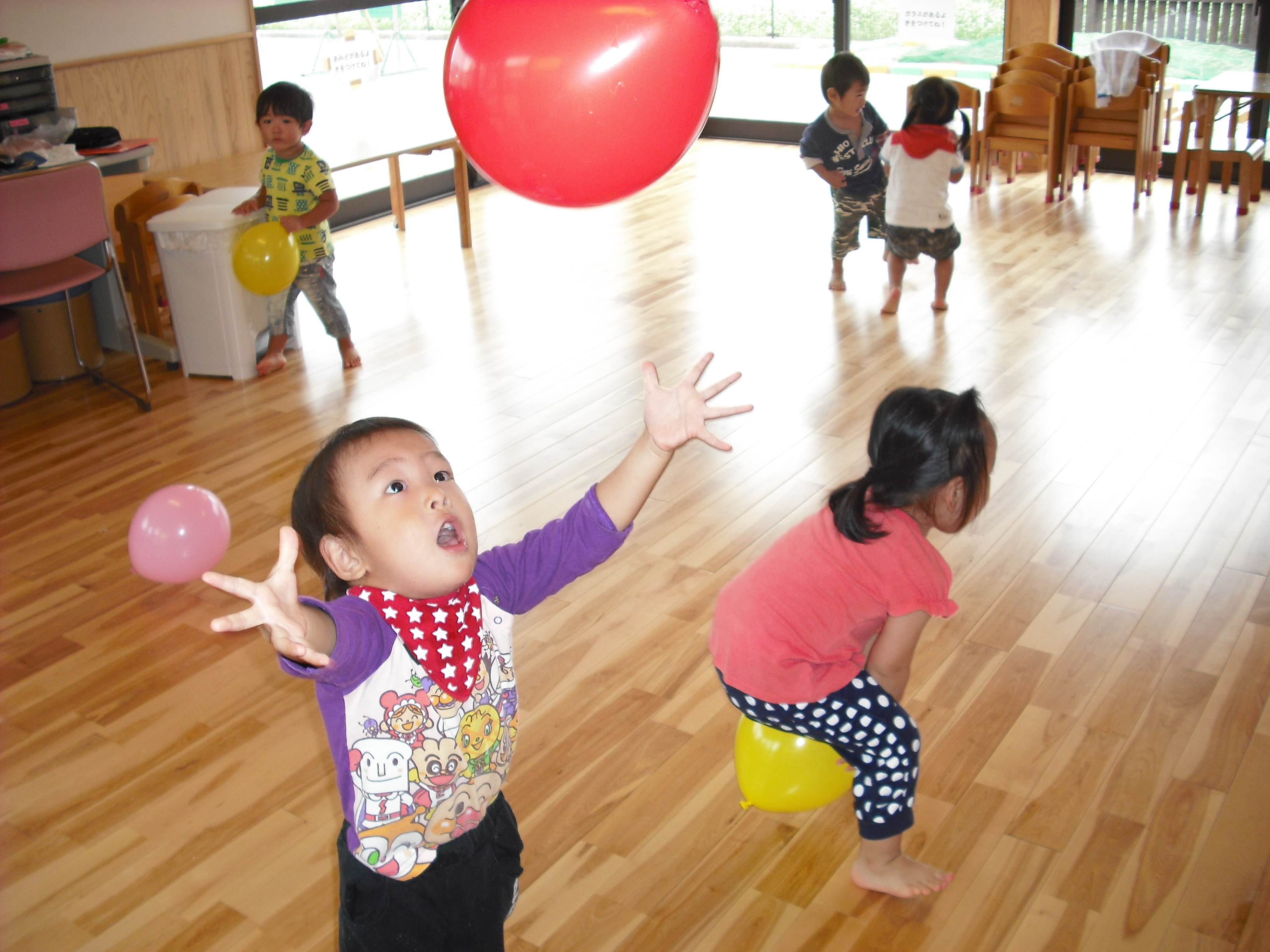 風船あそび 10月8日(火) うさぎ組さんは、風船あそびが大好き! 赤や黄色、緑やピンクなど色とりどりの風船を追いかけます。 部屋が広くなったので、風船はあちこち飛んでいきます。 『まてまて~』やっとつかまえることができました。