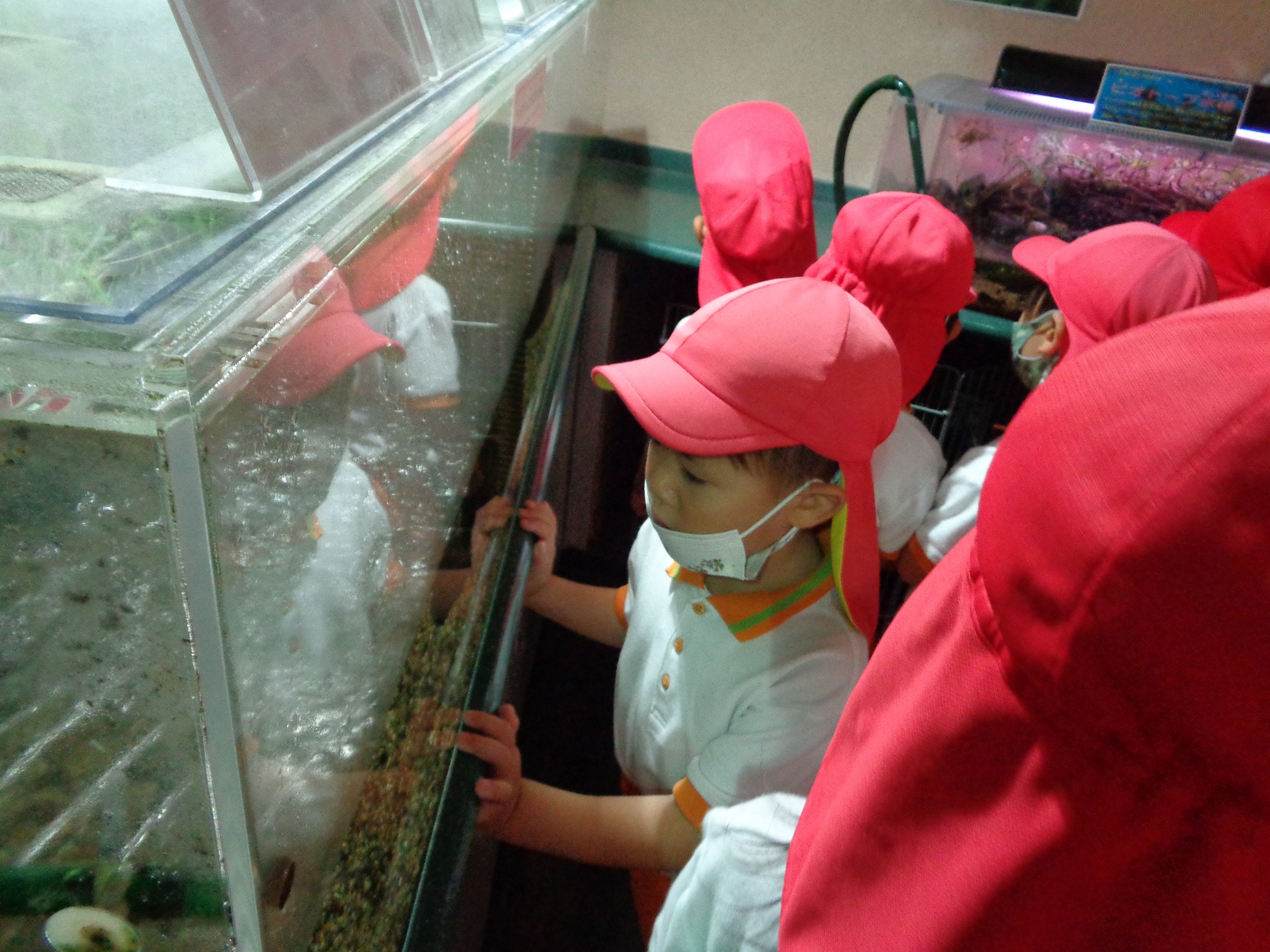 大きなかえるやカマキリ、蛍の幼虫、アカメという大きな魚が展示してあり、「わーこれ知ってる!」と、おおきな声を出して少々興奮気味。