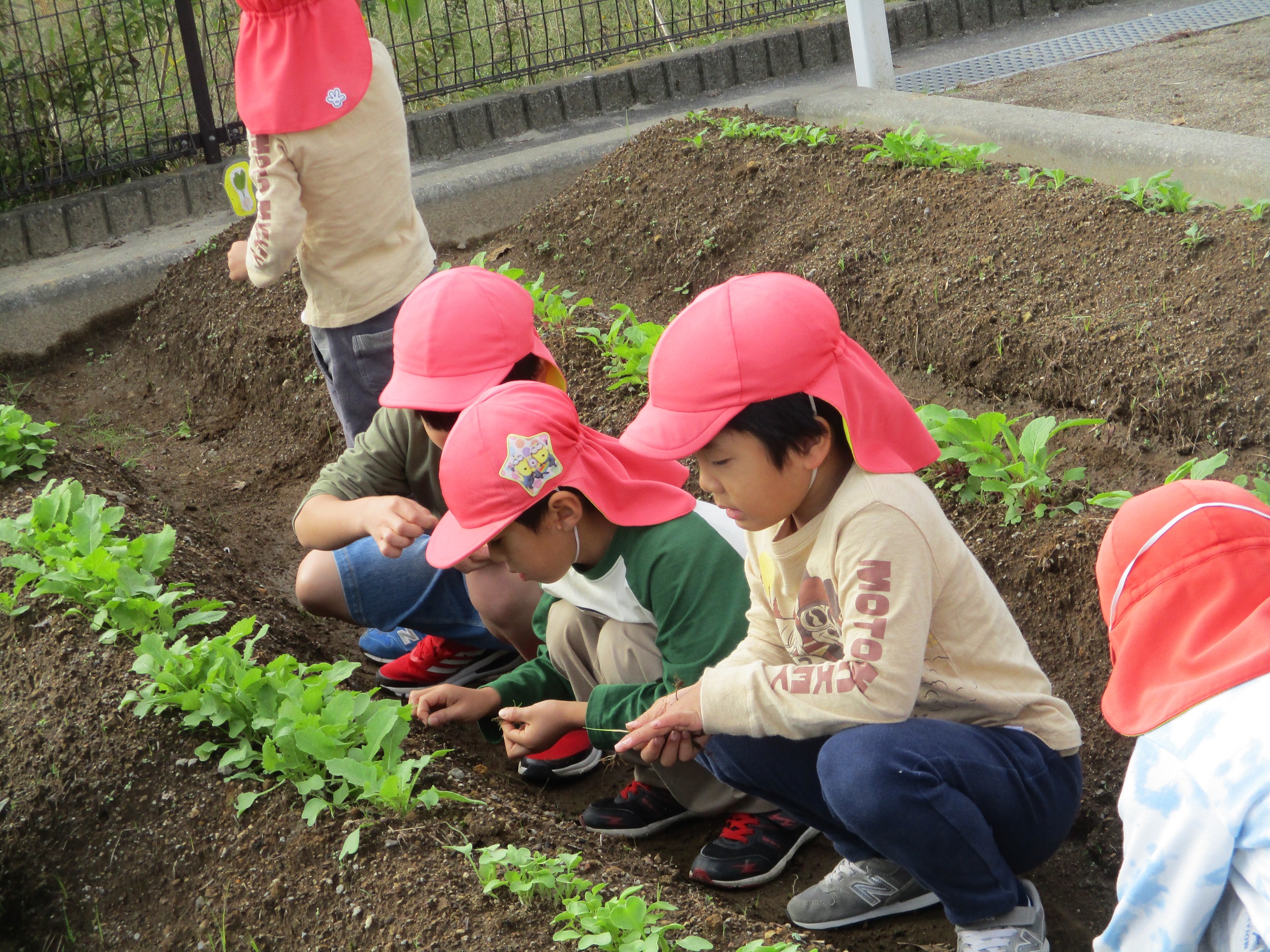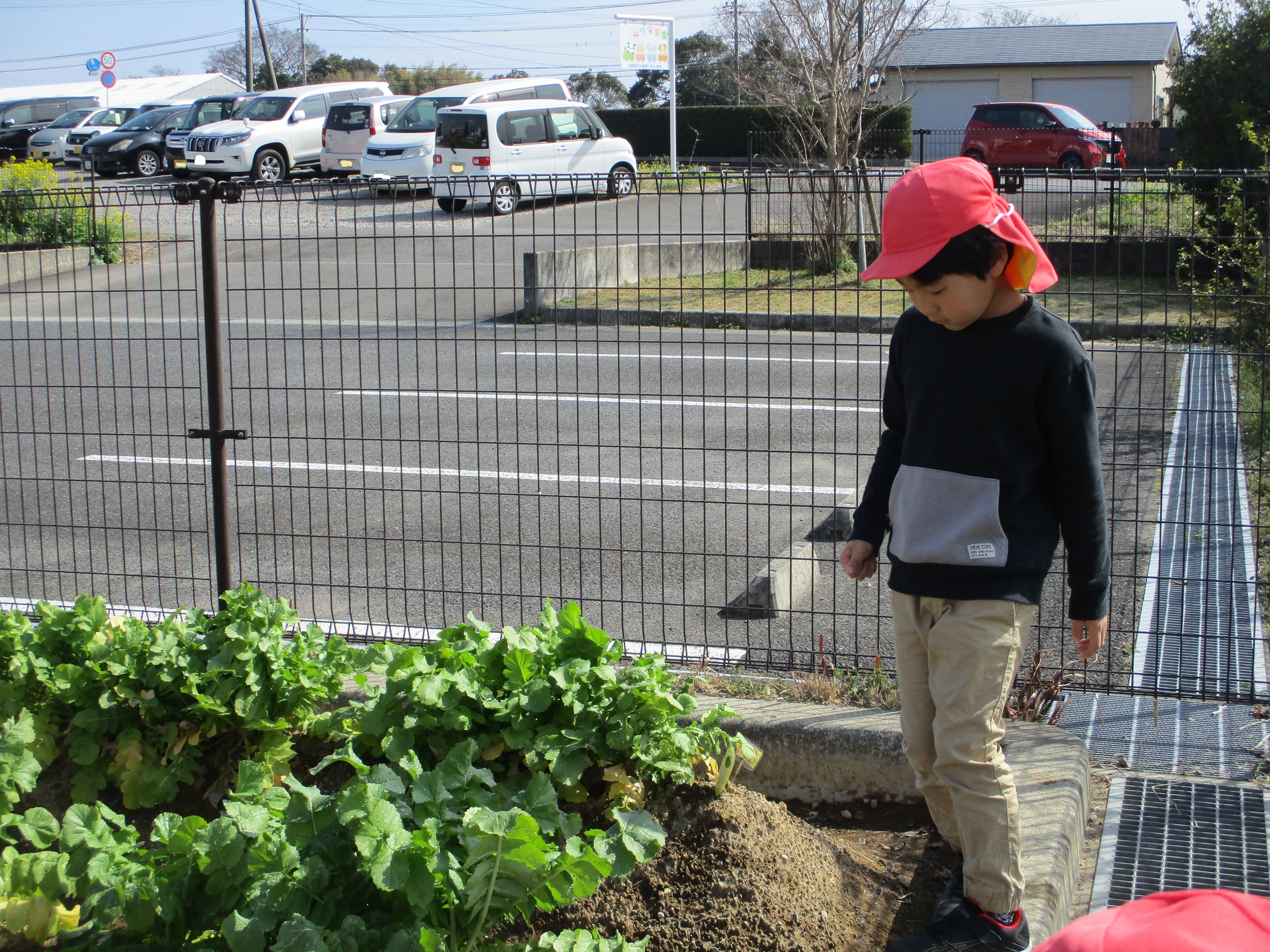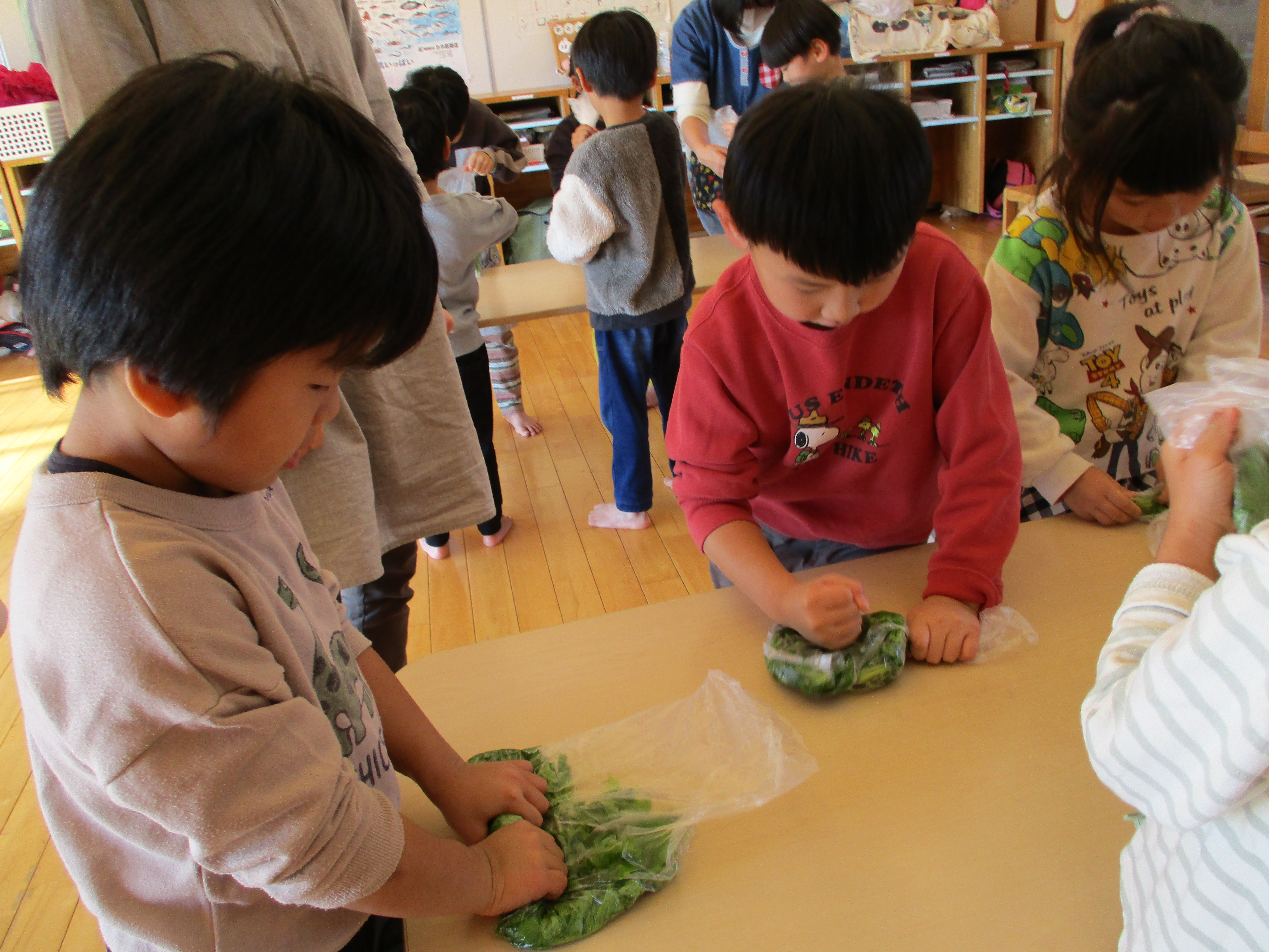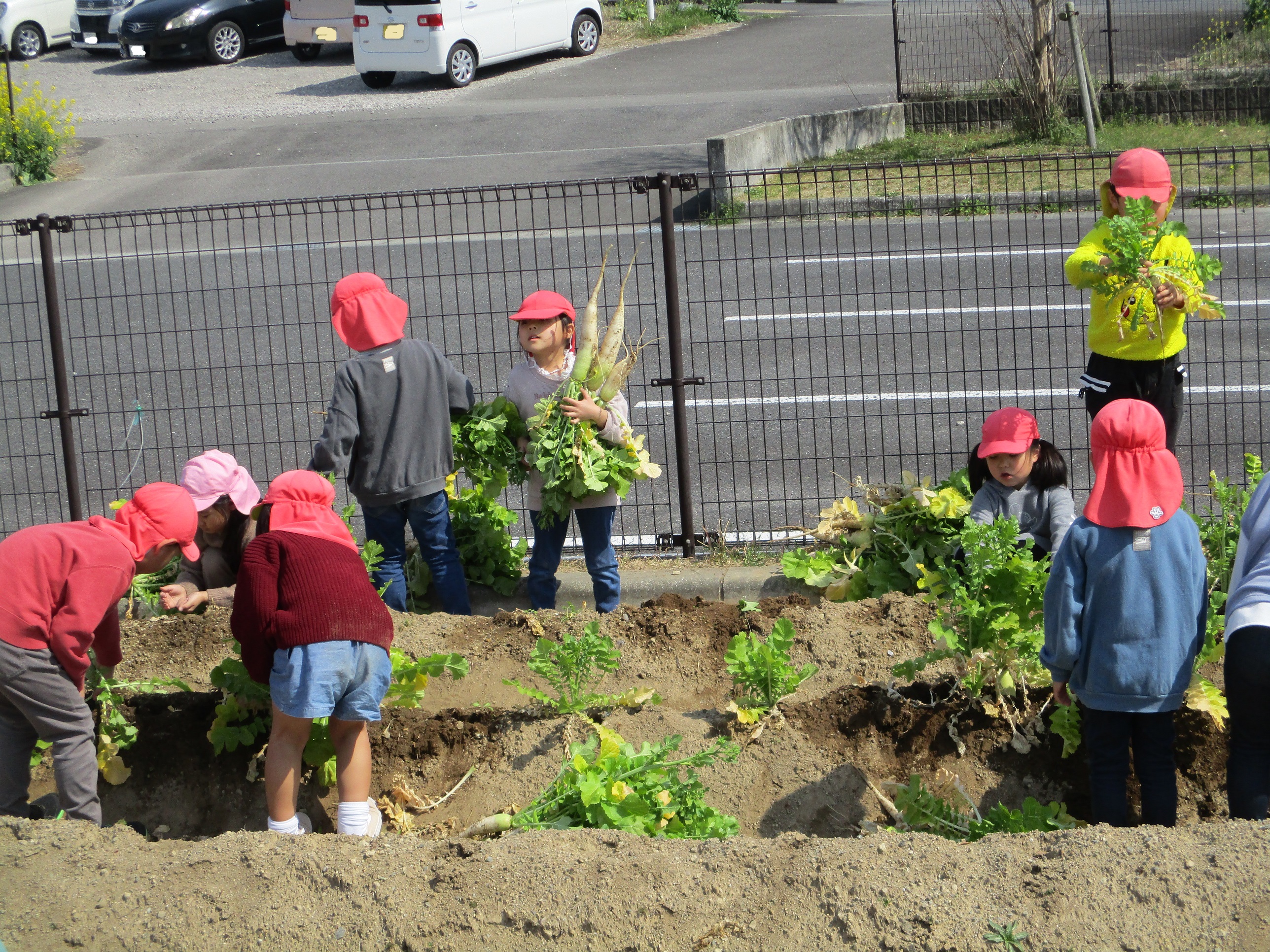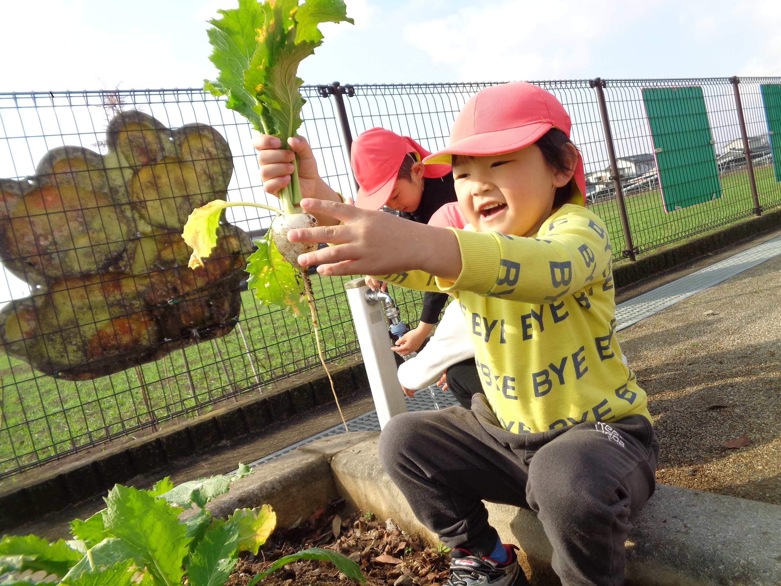 食育(大根・かぶ) 2月28日(火) 11月に種を蒔いて、2週間ほどで間引きが出来るほどに生長した大根とかぶ。 間引きした大根葉に塩を混ぜ良くもんで、漬物を作りました。 「苦いけどおいしい」とご飯にのせて大人の味を味わっていました。 ちょっぴり小さかったけど、大根もかぶも豊作でした‼
