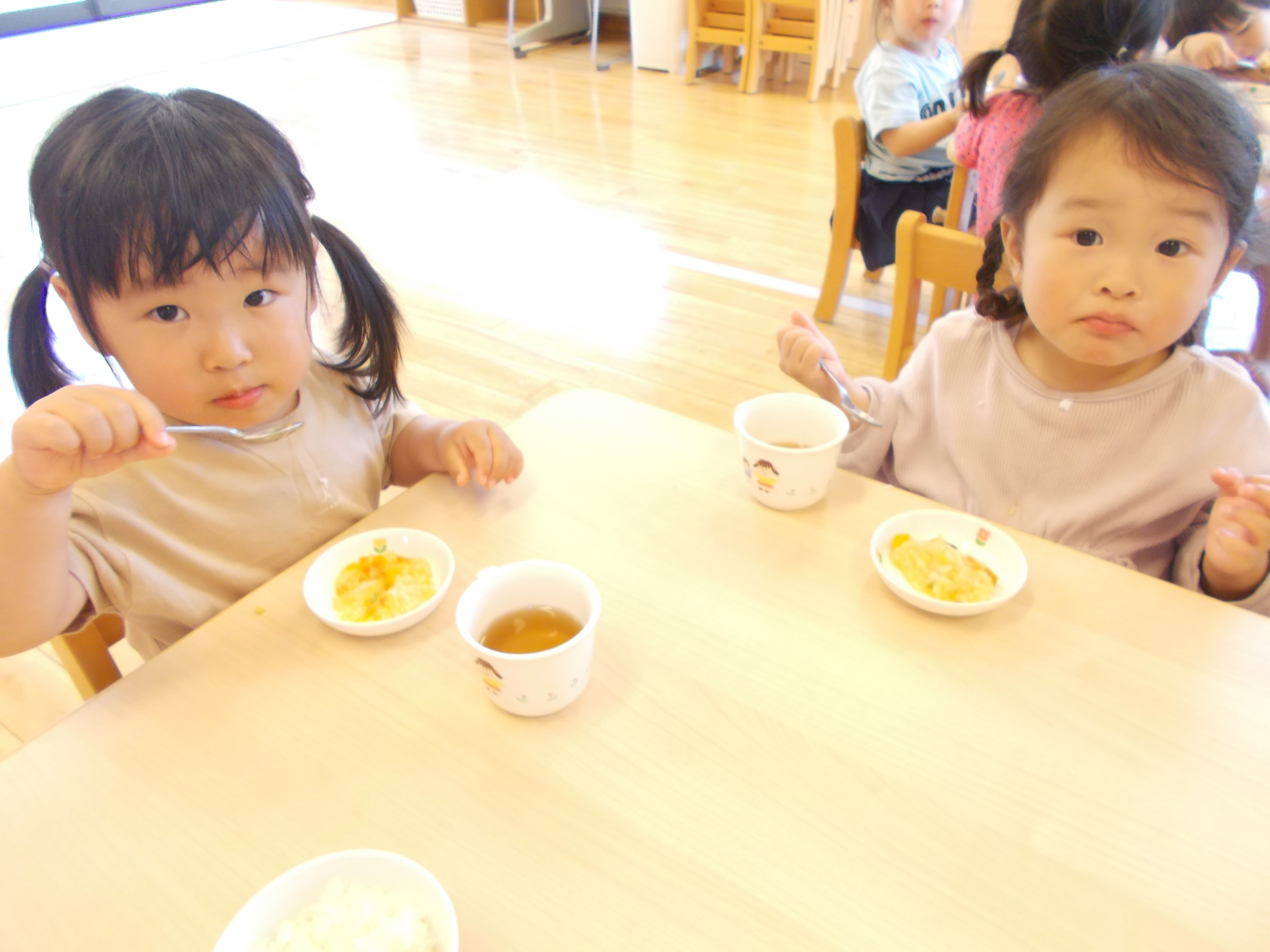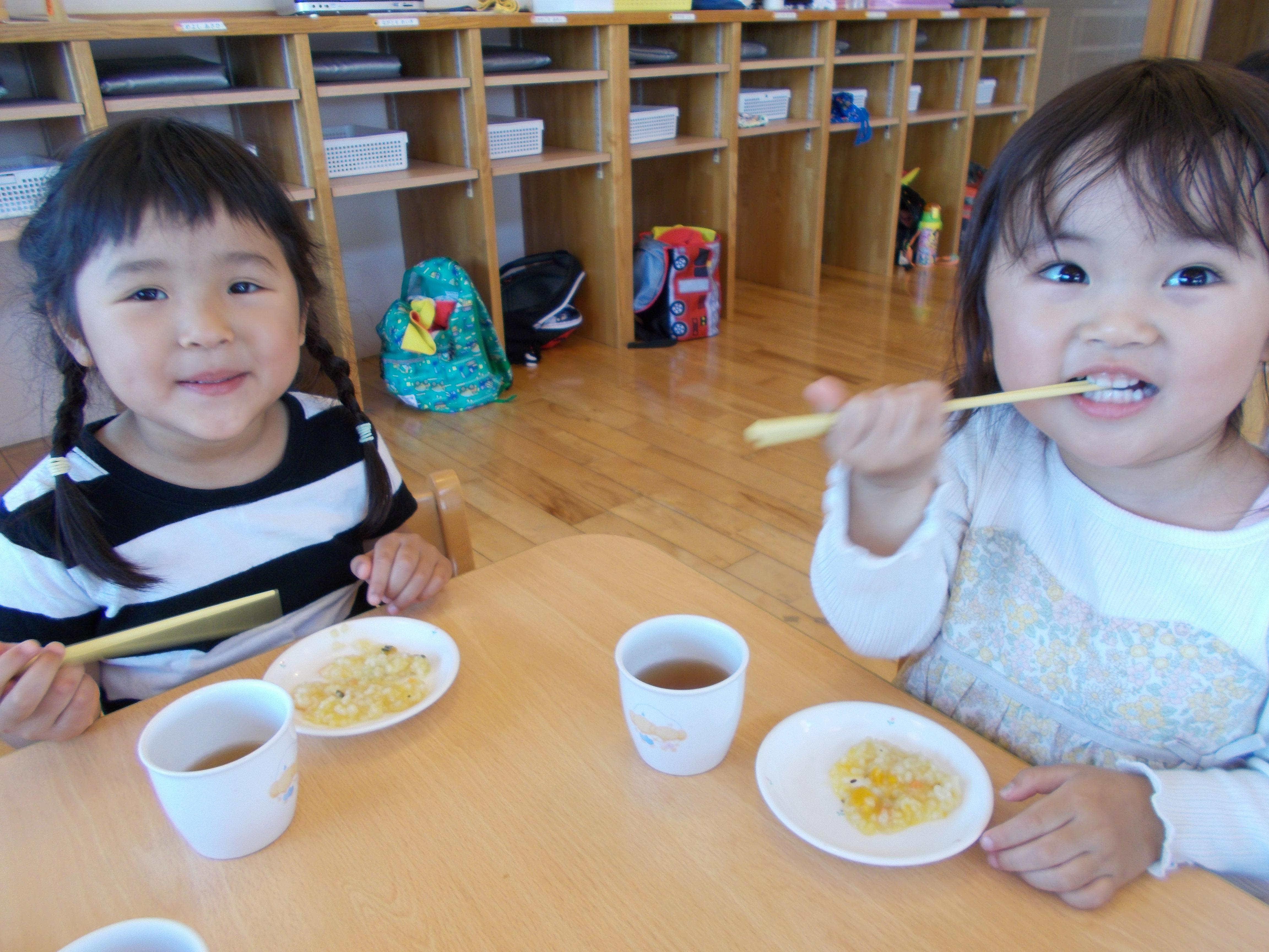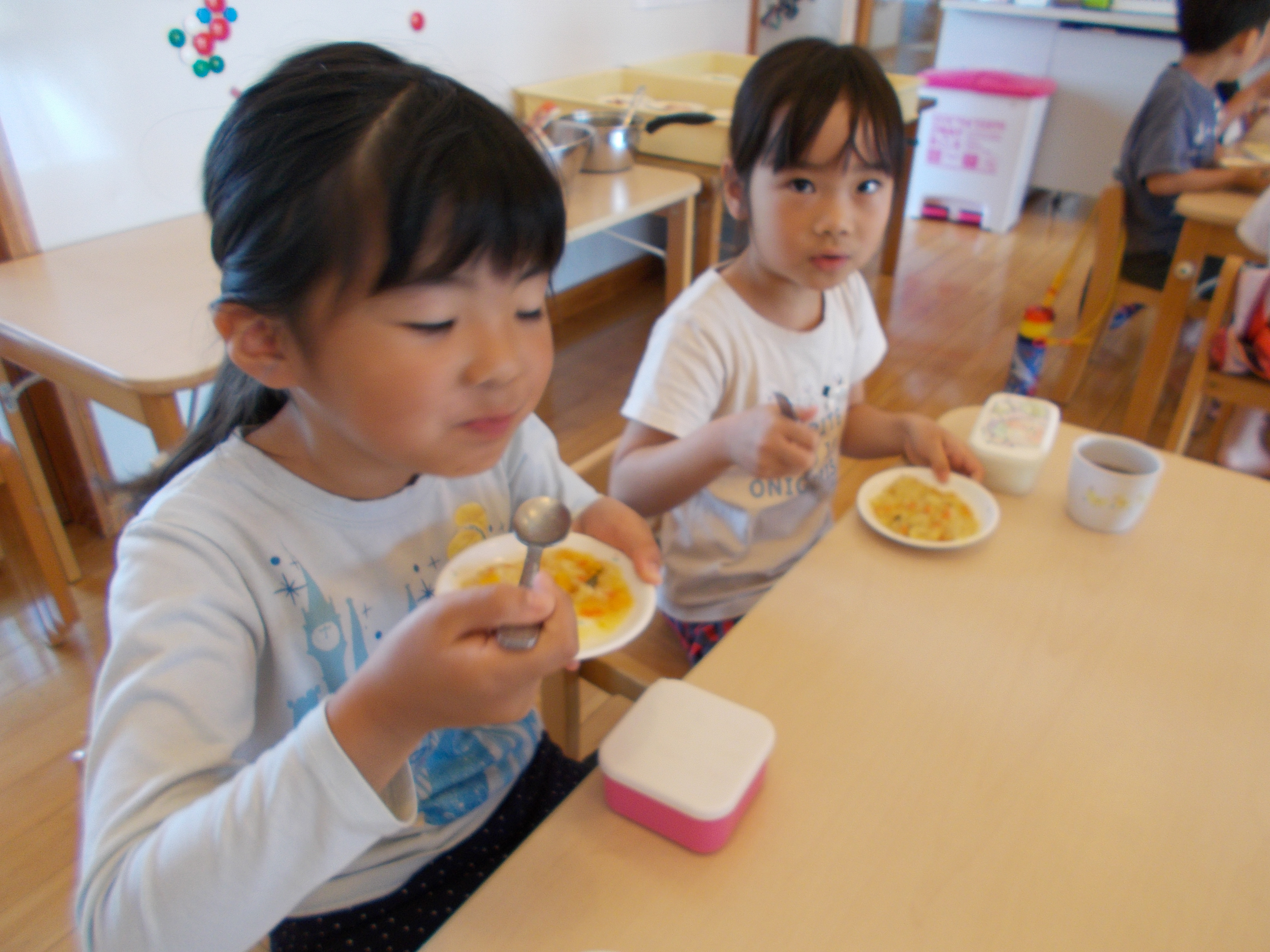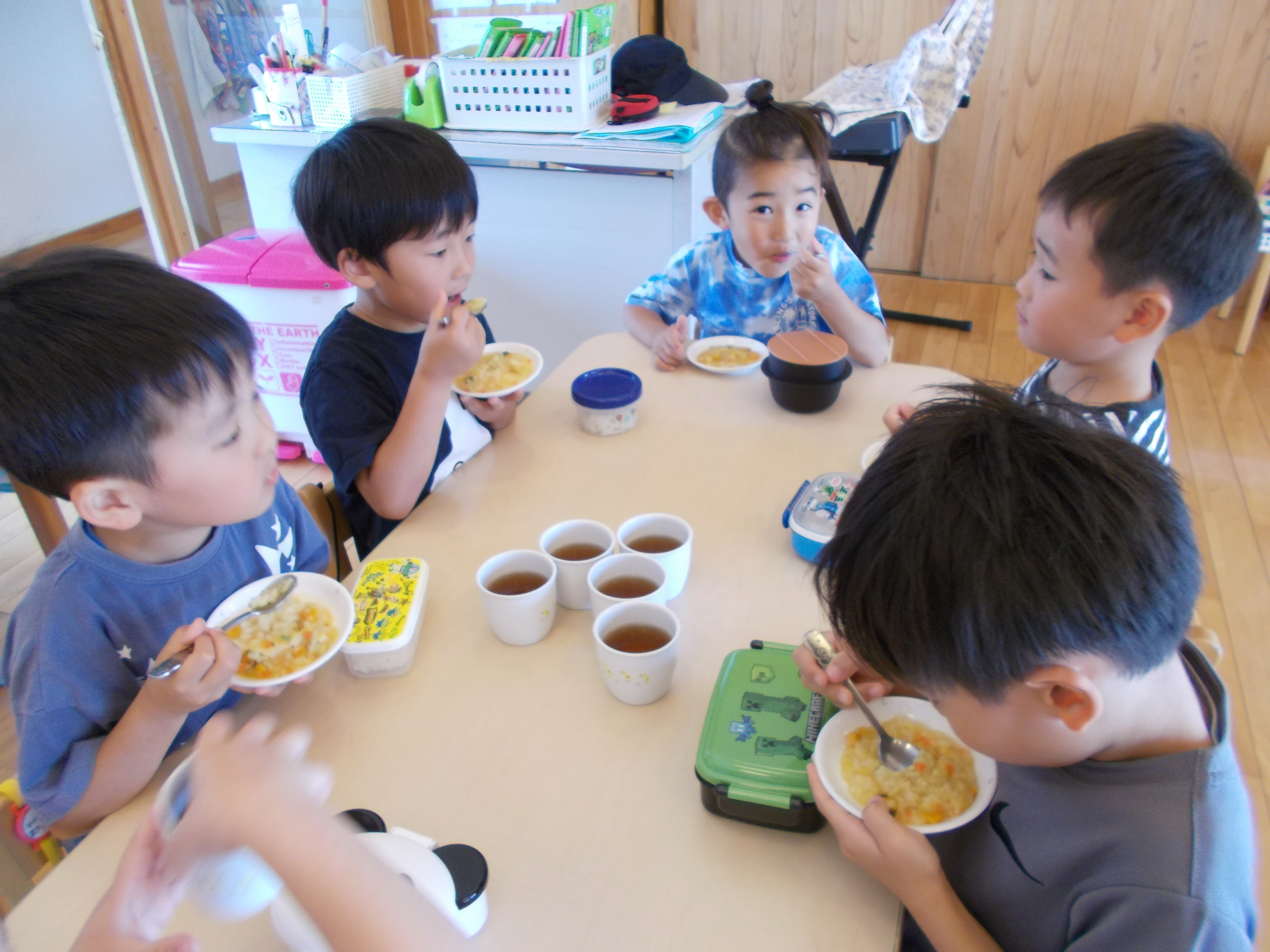 非常食は地震や津波で、給食が作れない時に食べることを話すと、「へーこれを食べるの?」「結構おいしいね」と、友達と話しながら食べていた4、5歳児の子ども達でした。
