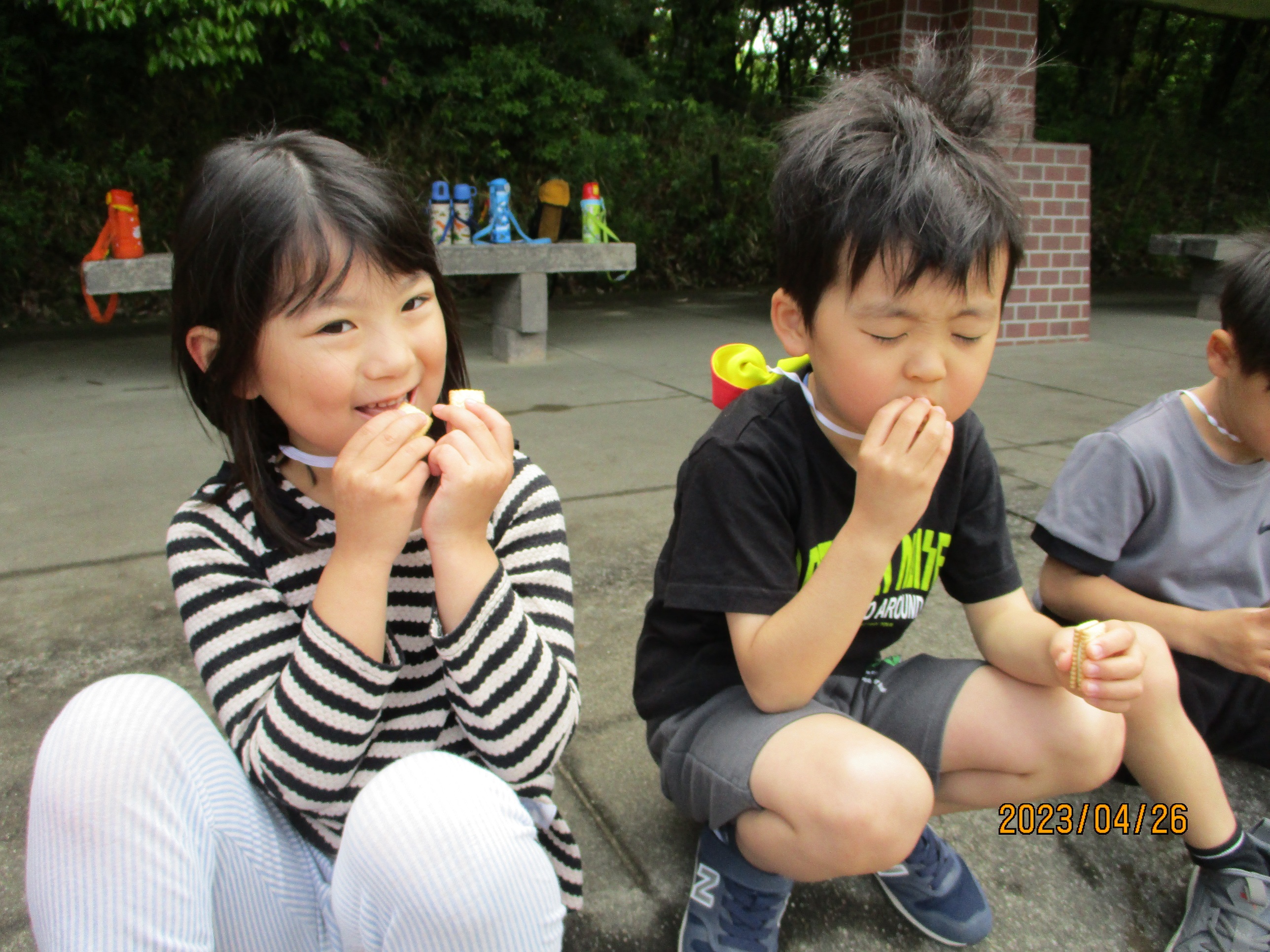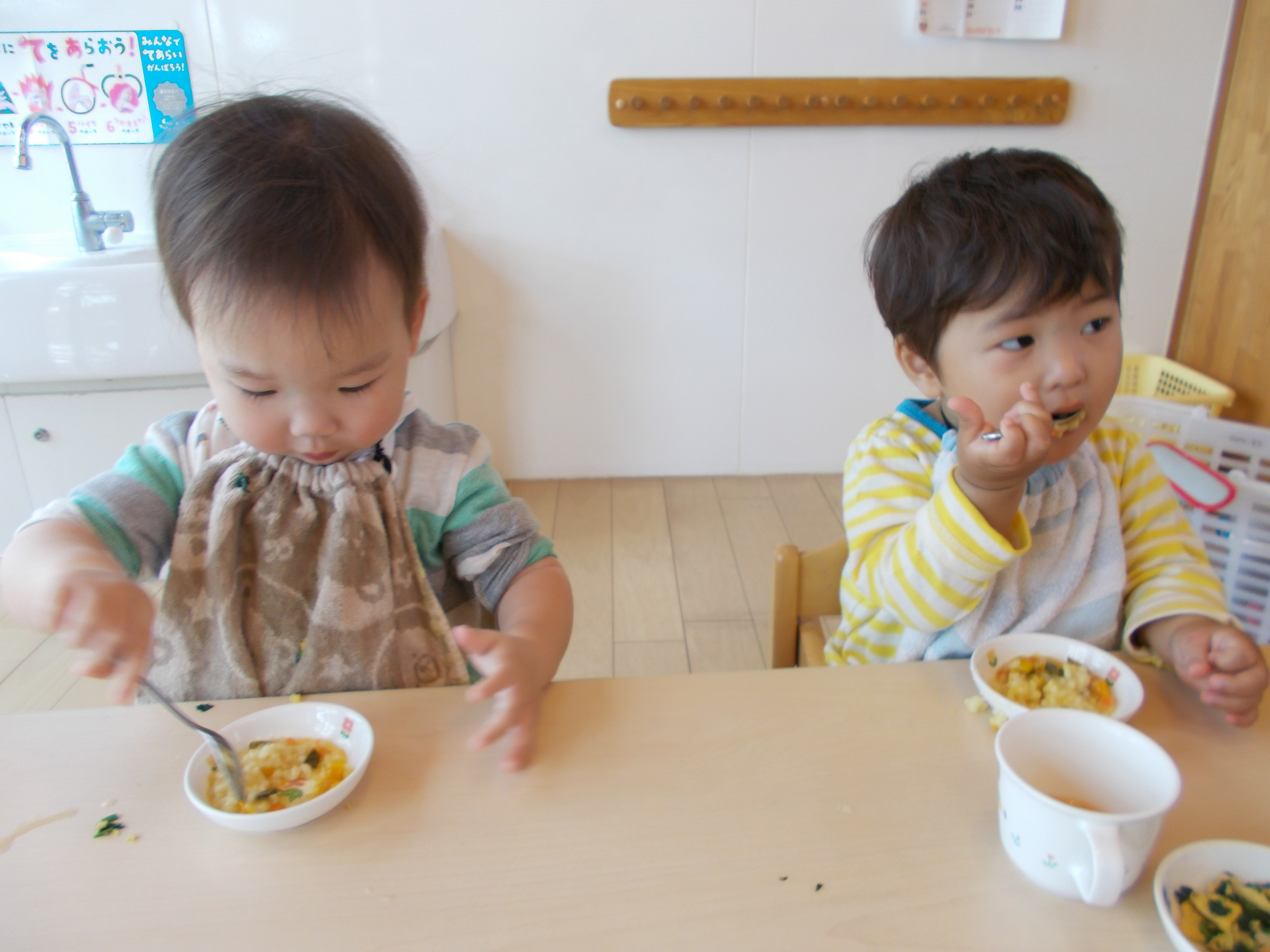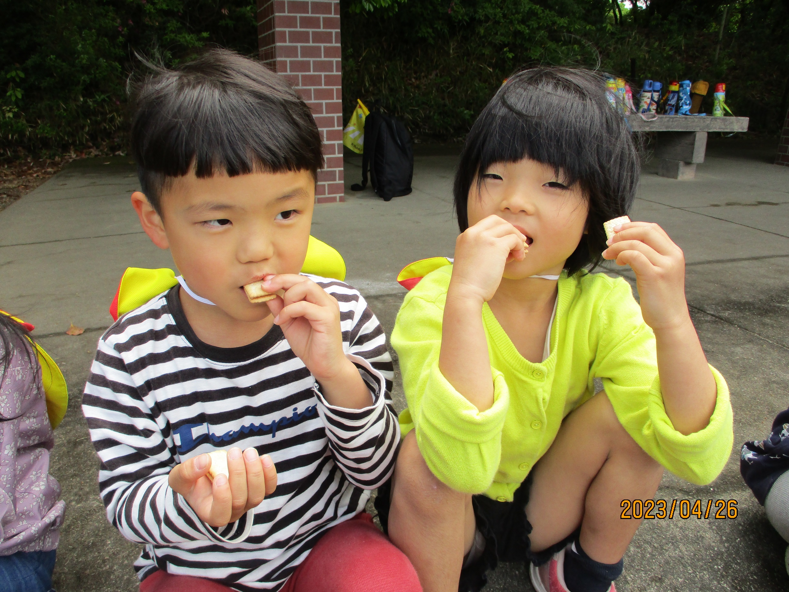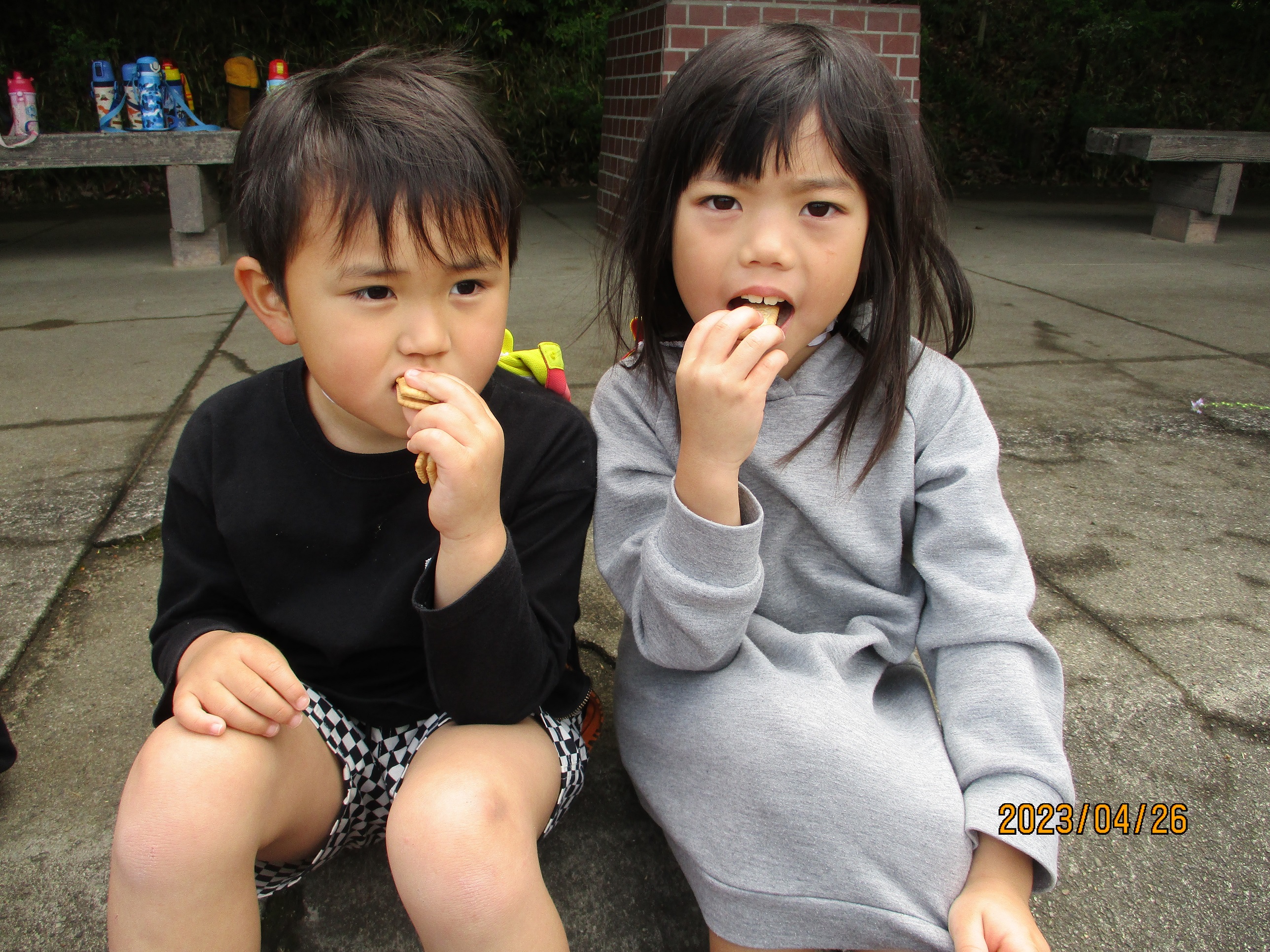 非常食は地震や津波で、給食が作れない時に食べることを話すと、「へーこれを食べるの?」「結構おいしいね」と、友達と話しながら食べていた4、5歳児の子ども達でした。